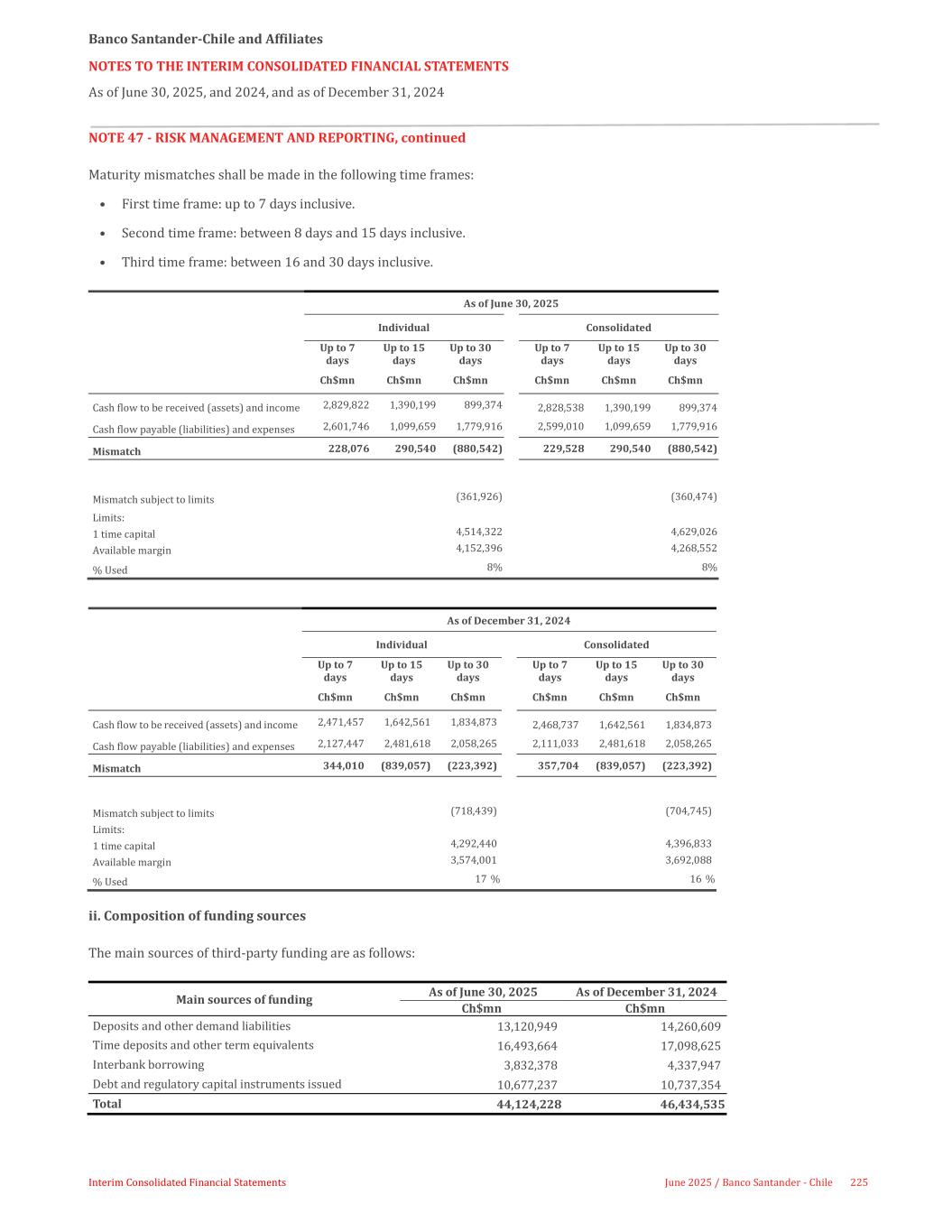 Banco Santander-Chile and Affiliates NOTES TO THE INTERIM CONSOLIDATED FINANCIAL STATEMENTS As of June 30, 2025, and 2024, and as of December 31, 2024 Interim Consolidated Financial Statements June 2025 / Banco Santander - Chile 225 NOTE 47 - RISK MANAGEMENT AND REPORTING, continued Maturity mismatches shall be made in the following time frames: First time frame: up to 7 days inclusive. Second time frame: between 8 days and 15 days inclusive. Third time frame: between 16 and 30 days inclusive. As of June 30, 2025 Individual Consolidated Up to 7 days Up to 15 days Up to 30 days Up to 7 days Up to 15 days Up to 30 days Ch$mn Ch$mn Ch$mn Ch$mn Ch$mn Ch$mn Cash flow to be received (assets) and income 2,829,822 1,390,199 899,374 2,828,538 1,390,199 899,374 Cash flow payable (liabilities) and expenses 2,601,746 1,099,659 1,779,916 2,599,010 1,099,659 1,779,916 Mismatch 228,076 290,540 (880,542) 229,528 290,540 (880,542) Mismatch subject to limits (361,926) (360,474) Limits: 1 time capital 4,514,322 4,629,026 Available margin 4,152,396 4,268,552 % Used 8% 8% As of December 31, 2024 Individual Consolidated Up to 7 days Up to 15 days Up to 30 days Up to 7 days Up to 15 days Up to 30 days Ch$mn Ch$mn Ch$mn Ch$mn Ch$mn Ch$mn Cash flow to be received (assets) and income 2,471,457 1,642,561 1,834,873 2,468,737 1,642,561 1,834,873 Cash flow payable (liabilities) and expenses 2,127,447 2,481,618 2,058,265 2,111,033 2,481,618 2,058,265 Mismatch 344,010 (839,057) (223,392) 357,704 (839,057) (223,392) Mismatch subject to limits (718,439) (704,745) Limits: 1 time capital 4,292,440 4,396,833 Available margin 3,574,001 3,692,088 % Used 17 % 16 % ii. Composition of funding sources The main sources of third-party funding are as follows: Main sources of funding As of June 30, 2025 As of December 31, 2024 Ch$mn Ch$mn Deposits and other demand liabilities 13,120,949 14,260,609 Time deposits and other term equivalents 16,493,664 17,098,625 Interbank borrowing 3,832,378 4,337,947 Debt and regulatory capital instruments issued 10,677,237 10,737,354 Total 44,124,228 46,434,535