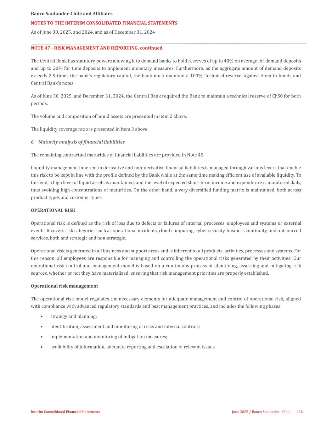 Banco Santander-Chile and Affiliates NOTES TO THE INTERIM CONSOLIDATED FINANCIAL STATEMENTS As of June 30, 2025, and 2024, and as of December 31, 2024 Interim Consolidated Financial Statements June 2025 / Banco Santander - Chile 226 NOTE 47 - RISK MANAGEMENT AND REPORTING, continued The Central Bank has statutory powers allowing it to demand banks to hold reserves of up to 40% on average for demand deposits and up to 20% for time deposits to implement monetary measures. Furthermore, as the aggregate amount of demand deposits exceeds 2.5 times the bank's regulatory capital, the bank must maintain a 100% 'technical reserve' against them in bonds and Central Bank's notes. As of June 30, 2025, and December 31, 2024, the Central Bank required the Bank to maintain a technical reserve of Ch$0 for both periods. The volume and composition of liquid assets are presented in item 2 above. The liquidity coverage ratio is presented in item 3 above. 6. Maturity analysis of financial liabilities The remaining contractual maturities of financial liabilities are provided in Note 45. Liquidity management inherent in derivative and non-derivative financial liabilities is managed through various levers that enable this risk to be kept in line with the profile defined by the Bank while at the same time making efficient use of available liquidity. To this end, a high level of liquid assets is maintained, and the level of expected short-term income and expenditure is monitored daily, thus avoiding high concentrations of maturities. On the other hand, a very diversified funding matrix is maintained, both across product types and customer types. OPERATIONAL RISK Operational risk is defined as the risk of loss due to defects or failures of internal processes, employees and systems or external events. It covers risk categories such as operational incidents, cloud computing, cyber security, business continuity, and outsourced services, both and strategic and non-strategic. Operational risk is generated in all business and support areas and is inherent to all products, activities, processes and systems. For this reason, all employees are responsible for managing and controlling the operational risks generated by their activities. Our operational risk control and management model is based on a continuous process of identifying, assessing and mitigating risk sources, whether or not they have materialized, ensuring that risk management priorities are properly established. Operational risk management The operational risk model regulates the necessary elements for adequate management and control of operational risk, aligned with compliance with advanced regulatory standards and best management practices, and includes the following phases: strategy and planning; identification, assessment and monitoring of risks and internal controls; implementation and monitoring of mitigation measures; availability of information, adequate reporting and escalation of relevant issues.