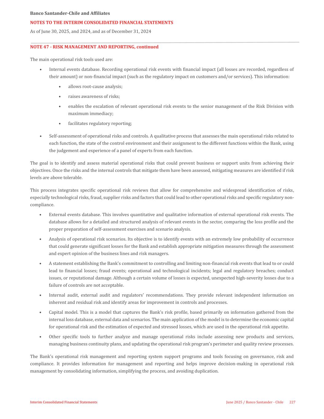 Banco Santander-Chile and Affiliates NOTES TO THE INTERIM CONSOLIDATED FINANCIAL STATEMENTS As of June 30, 2025, and 2024, and as of December 31, 2024 Interim Consolidated Financial Statements June 2025 / Banco Santander - Chile 227 NOTE 47 - RISK MANAGEMENT AND REPORTING, continued The main operational risk tools used are: Internal events database. Recording operational risk events with financial impact (all losses are recorded, regardless of their amount) or non-financial impact (such as the regulatory impact on customers and/or services). This information: allows root-cause analysis; raises awareness of risks; enables the escalation of relevant operational risk events to the senior management of the Risk Division with maximum immediacy; facilitates regulatory reporting; Self-assessment of operational risks and controls. A qualitative process that assesses the main operational risks related to each function, the state of the control environment and their assignment to the different functions within the Bank, using the judgement and experience of a panel of experts from each function. The goal is to identify and assess material operational risks that could prevent business or support units from achieving their objectives. Once the risks and the internal controls that mitigate them have been assessed, mitigating measures are identified if risk levels are above tolerable. This process integrates specific operational risk reviews that allow for comprehensive and widespread identification of risks, especially technological risks, fraud, supplier risks and factors that could lead to other operational risks and specific regulatory non- compliance. External events database. This involves quantitative and qualitative information of external operational risk events. The database allows for a detailed and structured analysis of relevant events in the sector, comparing the loss profile and the proper preparation of self-assessment exercises and scenario analysis. Analysis of operational risk scenarios. Its objective is to identify events with an extremely low probability of occurrence that could generate significant losses for the Bank and establish appropriate mitigation measures through the assessment and expert opinion of the business lines and risk managers. A statement establishing the Bank's commitment to controlling and limiting non-financial risk events that lead to or could lead to financial losses; fraud events; operational and technological incidents; legal and regulatory breaches; conduct issues, or reputational damage. Although a certain volume of losses is expected, unexpected high-severity losses due to a failure of controls are not acceptable. Internal audit, external audit and regulators' recommendations. They provide relevant independent information on inherent and residual risk and identify areas for improvement in controls and processes. Capital model. This is a model that captures the Bank's risk profile, based primarily on information gathered from the internal loss database, external data and scenarios. The main application of the model is to determine the economic capital for operational risk and the estimation of expected and stressed losses, which are used in the operational risk appetite. Other specific tools to further analyze and manage operational risks include assessing new products and services, managing business continuity plans, and updating the operational risk program's perimeter and quality review processes. The Bank's operational risk management and reporting system support programs and tools focusing on governance, risk and compliance. It provides information for management and reporting and helps improve decision-making in operational risk management by consolidating information, simplifying the process, and avoiding duplication.
