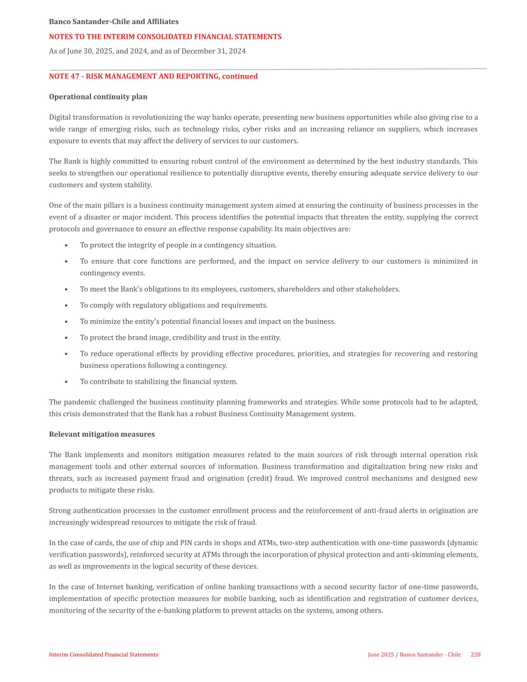 Banco Santander-Chile and Affiliates NOTES TO THE INTERIM CONSOLIDATED FINANCIAL STATEMENTS As of June 30, 2025, and 2024, and as of December 31, 2024 Interim Consolidated Financial Statements June 2025 / Banco Santander - Chile 228 NOTE 47 - RISK MANAGEMENT AND REPORTING, continued Operational continuity plan Digital transformation is revolutionizing the way banks operate, presenting new business opportunities while also giving rise to a wide range of emerging risks, such as technology risks, cyber risks and an increasing reliance on suppliers, which increases exposure to events that may affect the delivery of services to our customers. The Bank is highly committed to ensuring robust control of the environment as determined by the best industry standards. This seeks to strengthen our operational resilience to potentially disruptive events, thereby ensuring adequate service delivery to our customers and system stability. One of the main pillars is a business continuity management system aimed at ensuring the continuity of business processes in the event of a disaster or major incident. This process identifies the potential impacts that threaten the entity, supplying the correct protocols and governance to ensure an effective response capability. Its main objectives are: To protect the integrity of people in a contingency situation. To ensure that core functions are performed, and the impact on service delivery to our customers is minimized in contingency events. To meet the Bank's obligations to its employees, customers, shareholders and other stakeholders. To comply with regulatory obligations and requirements. To minimize the entity's potential financial losses and impact on the business. To protect the brand image, credibility and trust in the entity. To reduce operational effects by providing effective procedures, priorities, and strategies for recovering and restoring business operations following a contingency. To contribute to stabilizing the financial system. The pandemic challenged the business continuity planning frameworks and strategies. While some protocols had to be adapted, this crisis demonstrated that the Bank has a robust Business Continuity Management system. Relevant mitigation measures The Bank implements and monitors mitigation measures related to the main sources of risk through internal operation risk management tools and other external sources of information. Business transformation and digitalization bring new risks and threats, such as increased payment fraud and origination (credit) fraud. We improved control mechanisms and designed new products to mitigate these risks. Strong authentication processes in the customer enrollment process and the reinforcement of anti-fraud alerts in origination are increasingly widespread resources to mitigate the risk of fraud. In the case of cards, the use of chip and PIN cards in shops and ATMs, two-step authentication with one-time passwords (dynamic verification passwords), reinforced security at ATMs through the incorporation of physical protection and anti-skimming elements, as well as improvements in the logical security of these devices. In the case of Internet banking, verification of online banking transactions with a second security factor of one-time passwords, implementation of specific protection measures for mobile banking, such as identification and registration of customer devices, monitoring of the security of the e-banking platform to prevent attacks on the systems, among others.