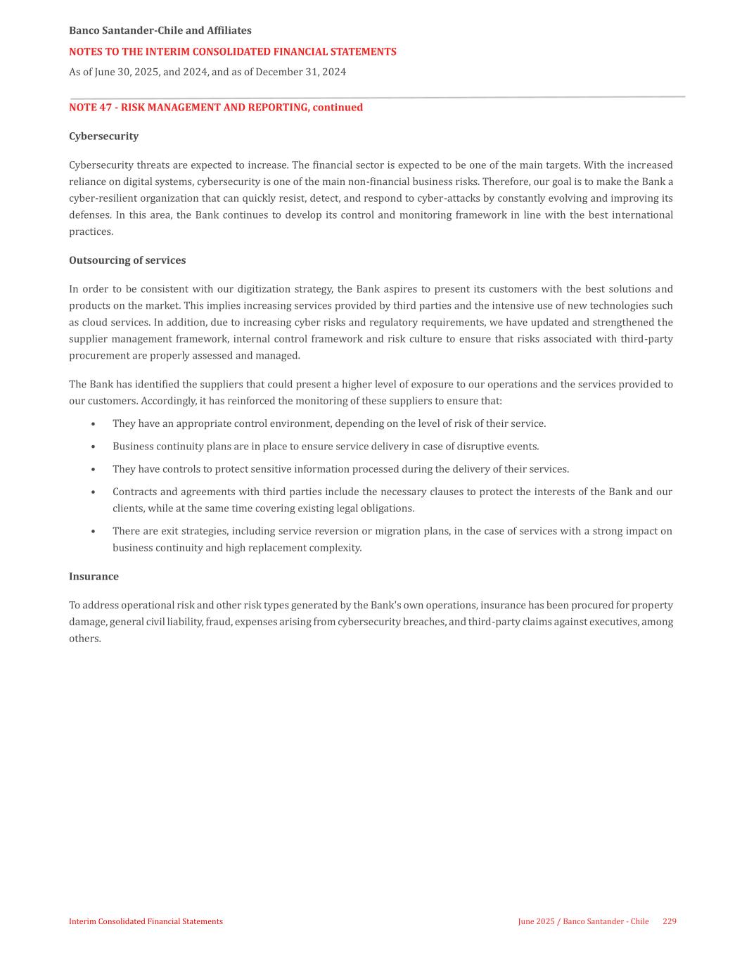 Banco Santander-Chile and Affiliates NOTES TO THE INTERIM CONSOLIDATED FINANCIAL STATEMENTS As of June 30, 2025, and 2024, and as of December 31, 2024 Interim Consolidated Financial Statements June 2025 / Banco Santander - Chile 229 NOTE 47 - RISK MANAGEMENT AND REPORTING, continued Cybersecurity Cybersecurity threats are expected to increase. The financial sector is expected to be one of the main targets. With the increased reliance on digital systems, cybersecurity is one of the main non-financial business risks. Therefore, our goal is to make the Bank a cyber-resilient organization that can quickly resist, detect, and respond to cyber-attacks by constantly evolving and improving its defenses. In this area, the Bank continues to develop its control and monitoring framework in line with the best international practices. Outsourcing of services In order to be consistent with our digitization strategy, the Bank aspires to present its customers with the best solutions and products on the market. This implies increasing services provided by third parties and the intensive use of new technologies such as cloud services. In addition, due to increasing cyber risks and regulatory requirements, we have updated and strengthened the supplier management framework, internal control framework and risk culture to ensure that risks associated with third-party procurement are properly assessed and managed. The Bank has identified the suppliers that could present a higher level of exposure to our operations and the services provided to our customers. Accordingly, it has reinforced the monitoring of these suppliers to ensure that: They have an appropriate control environment, depending on the level of risk of their service. Business continuity plans are in place to ensure service delivery in case of disruptive events. They have controls to protect sensitive information processed during the delivery of their services. Contracts and agreements with third parties include the necessary clauses to protect the interests of the Bank and our clients, while at the same time covering existing legal obligations. There are exit strategies, including service reversion or migration plans, in the case of services with a strong impact on business continuity and high replacement complexity. Insurance To address operational risk and other risk types generated by the Bank's own operations, insurance has been procured for property damage, general civil liability, fraud, expenses arising from cybersecurity breaches, and third-party claims against executives, among others.
