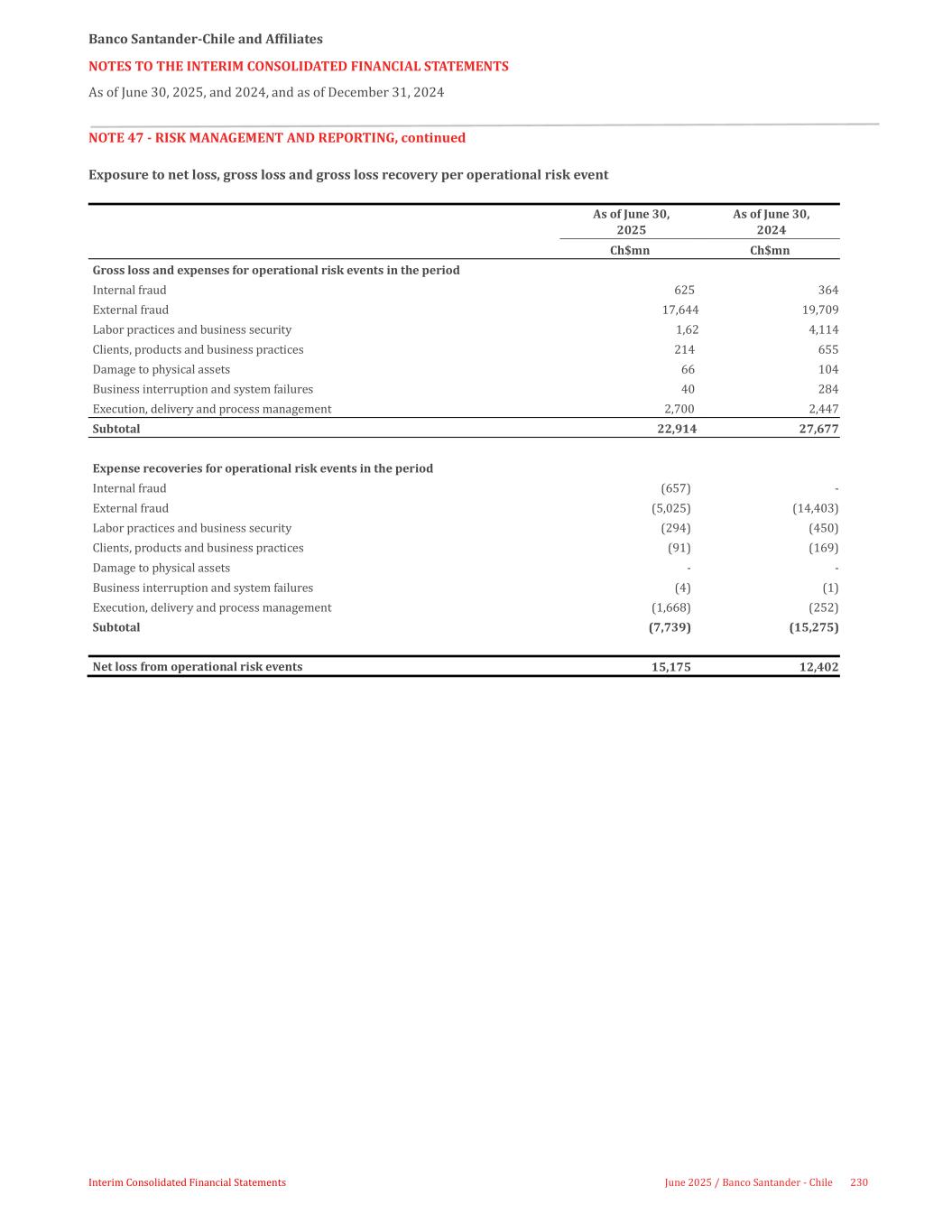 Banco Santander-Chile and Affiliates NOTES TO THE INTERIM CONSOLIDATED FINANCIAL STATEMENTS As of June 30, 2025, and 2024, and as of December 31, 2024 Interim Consolidated Financial Statements June 2025 / Banco Santander - Chile 230 NOTE 47 - RISK MANAGEMENT AND REPORTING, continued Exposure to net loss, gross loss and gross loss recovery per operational risk event As of June 30, 2025 As of June 30, 2024 Ch$mn Ch$mn Gross loss and expenses for operational risk events in the period Internal fraud 625 364 External fraud 17,644 19,709 Labor practices and business security 1,62 4,114 Clients, products and business practices 214 655 Damage to physical assets 66 104 Business interruption and system failures 40 284 Execution, delivery and process management 2,700 2,447 Subtotal 22,914 27,677 Expense recoveries for operational risk events in the period Internal fraud (657) - External fraud (5,025) (14,403) Labor practices and business security (294) (450) Clients, products and business practices (91) (169) Damage to physical assets - - Business interruption and system failures (4) (1) Execution, delivery and process management (1,668) (252) Subtotal (7,739) (15,275) Net loss from operational risk events 15,175 12,402