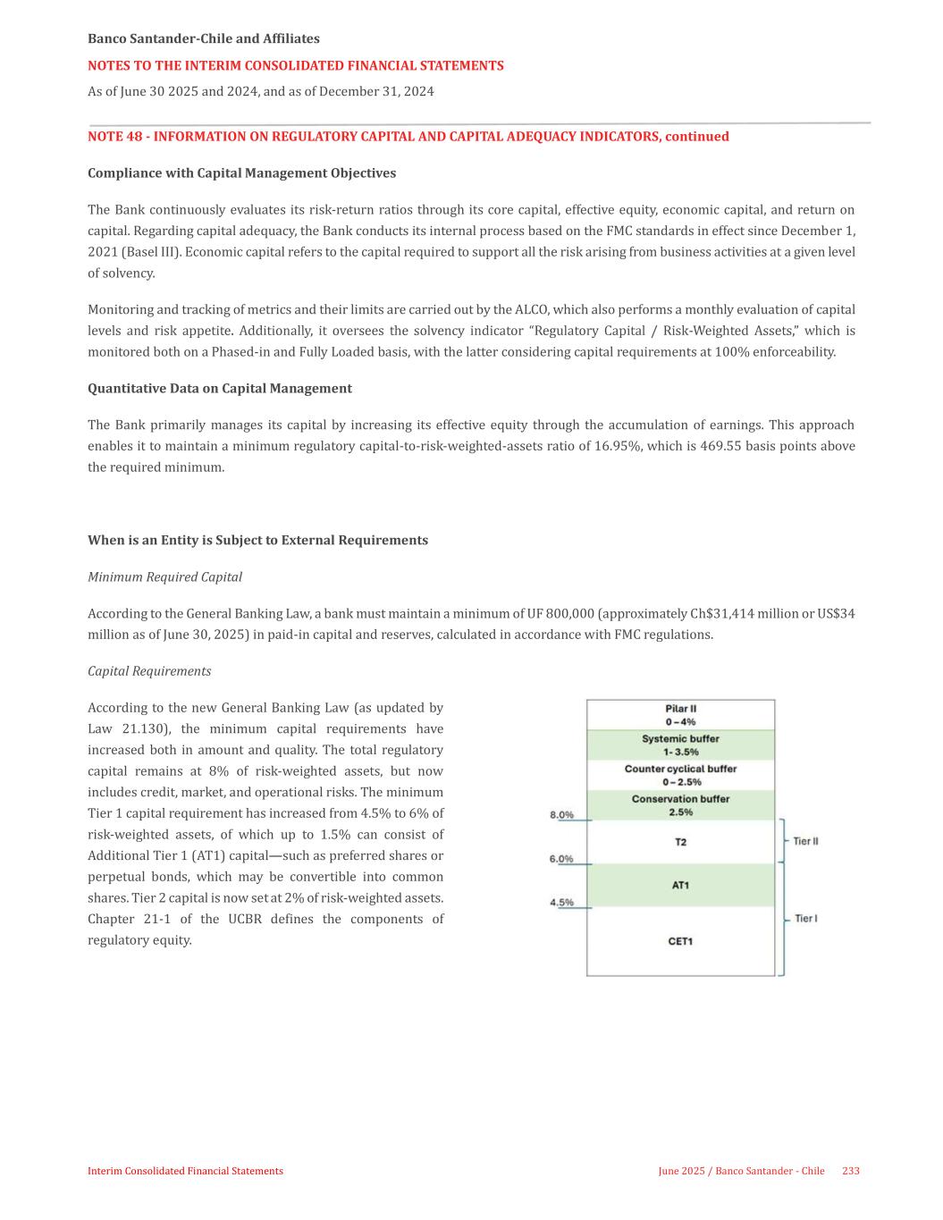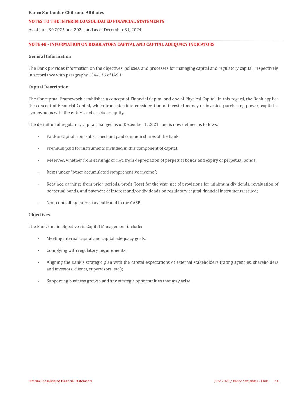 Banco Santander-Chile and Affiliates NOTES TO THE INTERIM CONSOLIDATED FINANCIAL STATEMENTS As of June 30 2025 and 2024, and as of December 31, 2024 Interim Consolidated Financial Statements June 2025 / Banco Santander - Chile 231 NOTE 48 - INFORMATION ON REGULATORY CAPITAL AND CAPITAL ADEQUACY INDICATORS General Information The Bank provides information on the objectives, policies, and processes for managing capital and regulatory capital, respectively, in accordance with paragraphs 134 136 of IAS 1. Capital Description The Conceptual Framework establishes a concept of Financial Capital and one of Physical Capital. In this regard, the Bank applies the concept of Financial Capital, which translates into consideration of invested money or invested purchasing power; capital is The definition of regulatory capital changed as of December 1, 2021, and is now defined as follows: - Paid-in capital from subscribed and paid common shares of the Bank; - Premium paid for instruments included in this component of capital; - Reserves, whether from earnings or not, from depreciation of perpetual bonds and expiry of perpetual bonds; - - Retained earnings from prior periods, profit (loss) for the year, net of provisions for minimum dividends, revaluation of perpetual bonds, and payment of interest and/or dividends on regulatory capital financial instruments issued; - Non-controlling interest as indicated in the CASB. Objectives - Meeting internal capital and capital adequacy goals; - Complying with regulatory requirements; - and investors, clients, supervisors, etc.); - Supporting business growth and any strategic opportunities that may arise.