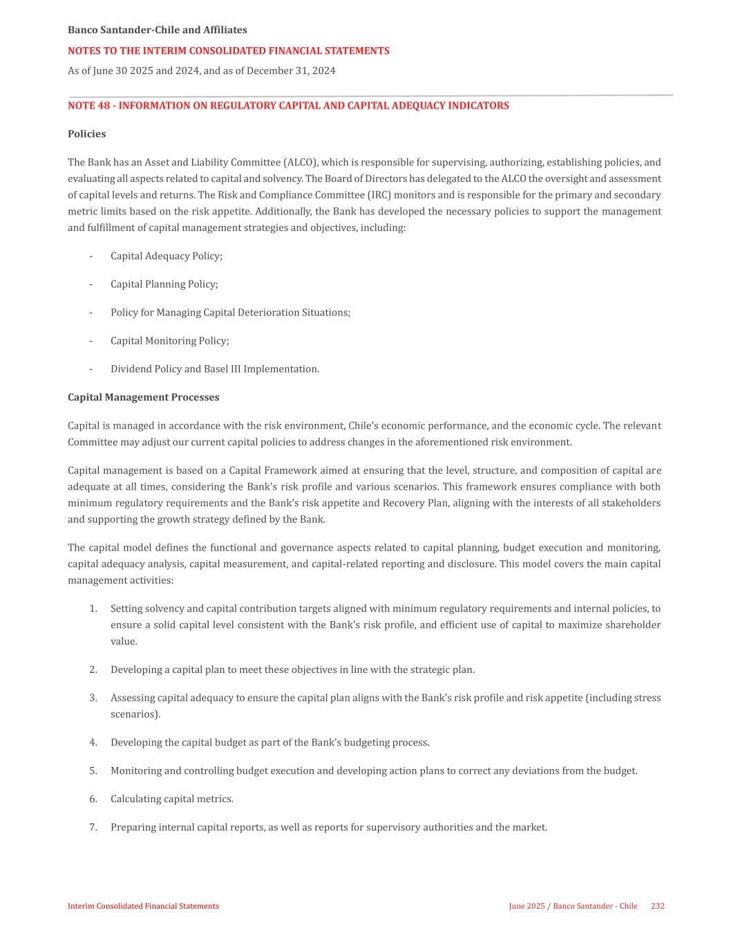 Banco Santander-Chile and Affiliates NOTES TO THE INTERIM CONSOLIDATED FINANCIAL STATEMENTS As of June 30 2025 and 2024, and as of December 31, 2024 Interim Consolidated Financial Statements June 2025 / Banco Santander - Chile 232 NOTE 48 - INFORMATION ON REGULATORY CAPITAL AND CAPITAL ADEQUACY INDICATORS Policies The Bank has an Asset and Liability Committee (ALCO), which is responsible for supervising, authorizing, establishing policies, and evaluating all aspects related to capital and solvency. The Board of Directors has delegated to the ALCO the oversight and assessment of capital levels and returns. The Risk and Compliance Committee (IRC) monitors and is responsible for the primary and secondary metric limits based on the risk appetite. Additionally, the Bank has developed the necessary policies to support the management and fulfillment of capital management strategies and objectives, including: - Capital Adequacy Policy; - Capital Planning Policy; - Policy for Managing Capital Deterioration Situations; - Capital Monitoring Policy; - Dividend Policy and Basel III Implementation. Capital Management Processes t Committee may adjust our current capital policies to address changes in the aforementioned risk environment. Capital management is based on a Capital Framework aimed at ensuring that the level, structure, and composition of capital are adequate at all times, considering the Bank's risk profile and various scenarios. This framework ensures compliance with both min and supporting the growth strategy defined by the Bank. The capital model defines the functional and governance aspects related to capital planning, budget execution and monitoring, capital adequacy analysis, capital measurement, and capital-related reporting and disclosure. This model covers the main capital management activities: 1. Setting solvency and capital contribution targets aligned with minimum regulatory requirements and internal policies, to ensure a solid capital level consistent with the Bank's risk profile, and efficient use of capital to maximize shareholder value. 2. Developing a capital plan to meet these objectives in line with the strategic plan. 3. scenarios). 4. 5. Monitoring and controlling budget execution and developing action plans to correct any deviations from the budget. 6. Calculating capital metrics. 7. Preparing internal capital reports, as well as reports for supervisory authorities and the market.