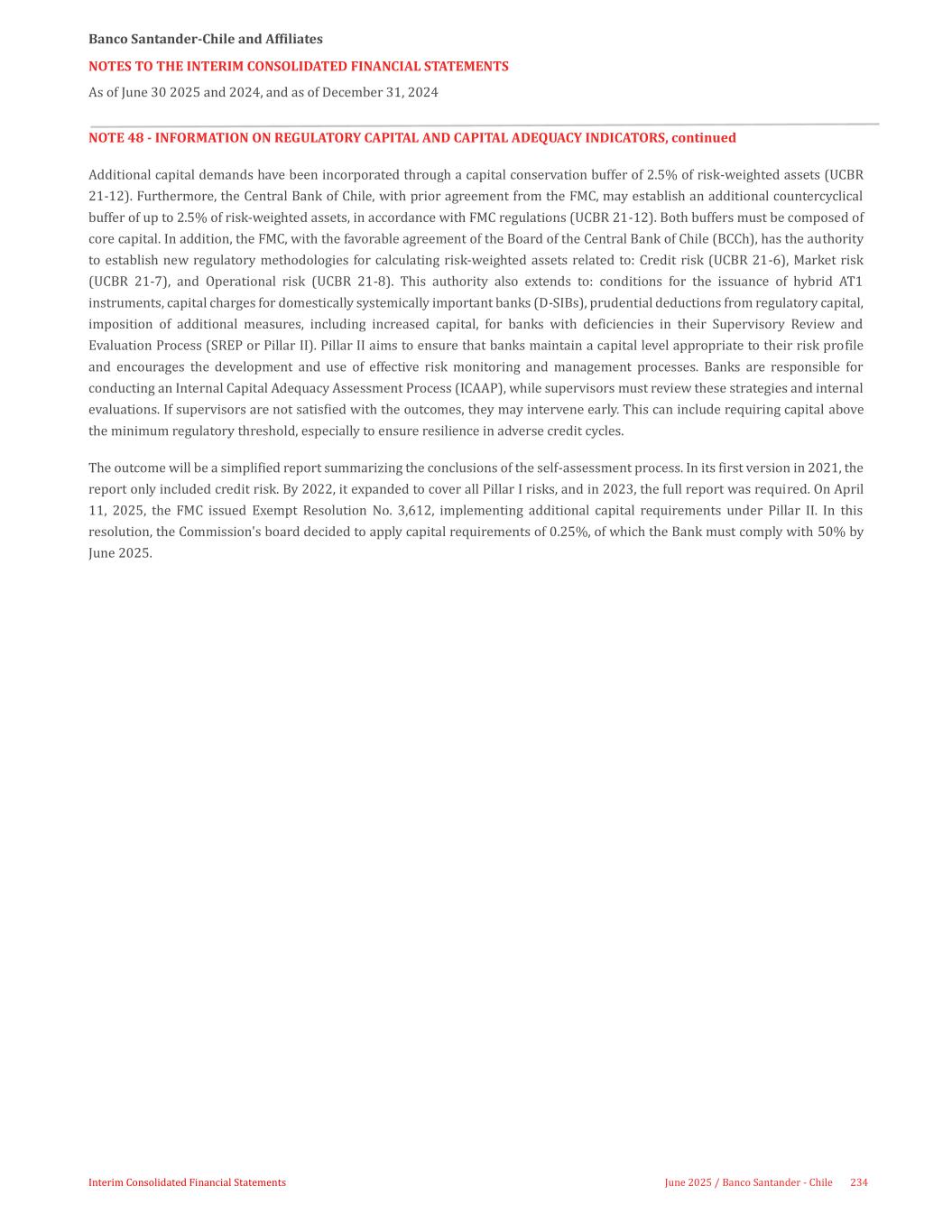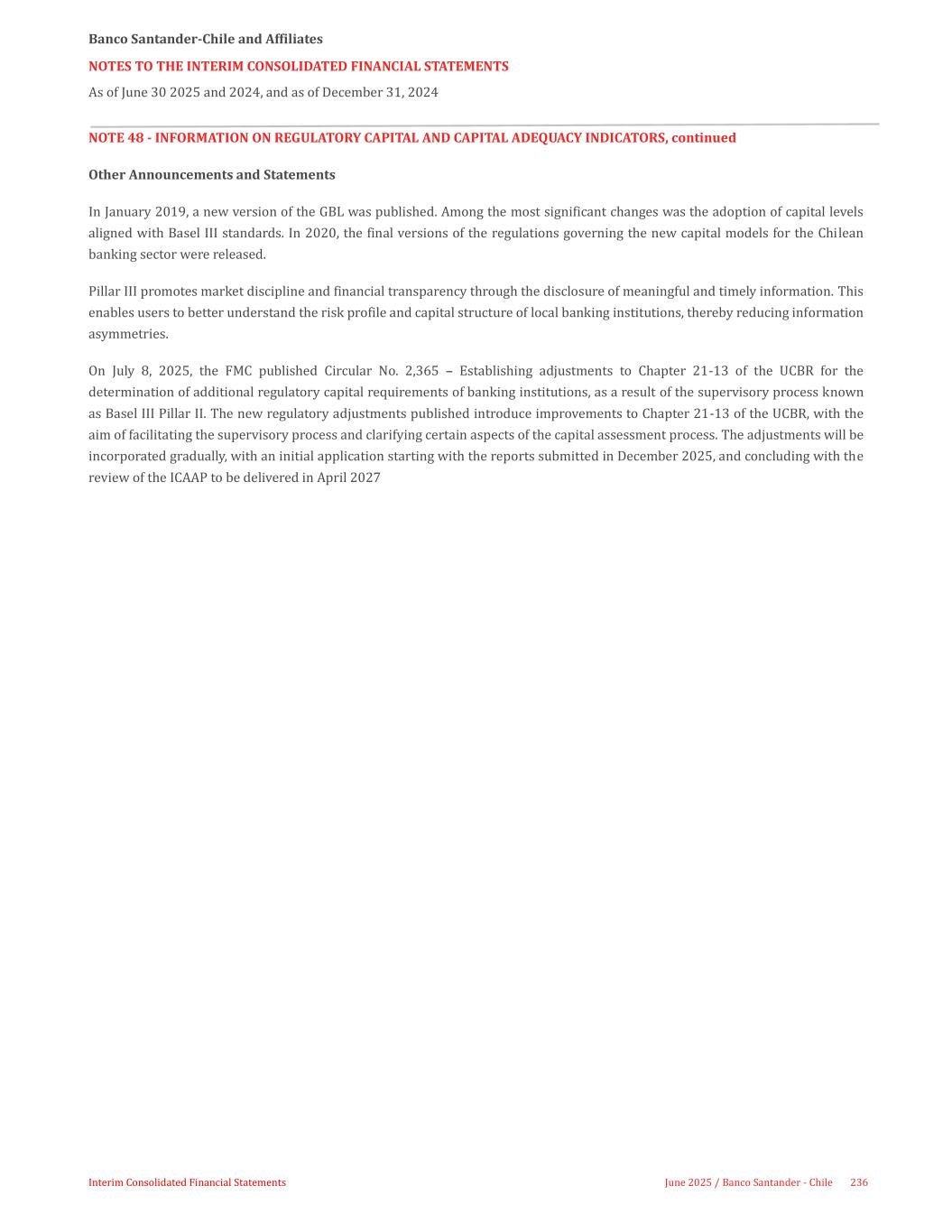 Banco Santander-Chile and Affiliates NOTES TO THE INTERIM CONSOLIDATED FINANCIAL STATEMENTS As of June 30 2025 and 2024, and as of December 31, 2024 Interim Consolidated Financial Statements June 2025 / Banco Santander - Chile 236 NOTE 48 - INFORMATION ON REGULATORY CAPITAL AND CAPITAL ADEQUACY INDICATORS, continued Other Announcements and Statements In January 2019, a new version of the GBL was published. Among the most significant changes was the adoption of capital levels aligned with Basel III standards. In 2020, the final versions of the regulations governing the new capital models for the Chilean banking sector were released. Pillar III promotes market discipline and financial transparency through the disclosure of meaningful and timely information. This enables users to better understand the risk profile and capital structure of local banking institutions, thereby reducing information asymmetries. On July 8, 2025, the FMC published Circular No. 2,365 Establishing adjustments to Chapter 21-13 of the UCBR for the determination of additional regulatory capital requirements of banking institutions, as a result of the supervisory process known as Basel III Pillar II. The new regulatory adjustments published introduce improvements to Chapter 21-13 of the UCBR, with the aim of facilitating the supervisory process and clarifying certain aspects of the capital assessment process. The adjustments will be incorporated gradually, with an initial application starting with the reports submitted in December 2025, and concluding with the review of the ICAAP to be delivered in April 2027