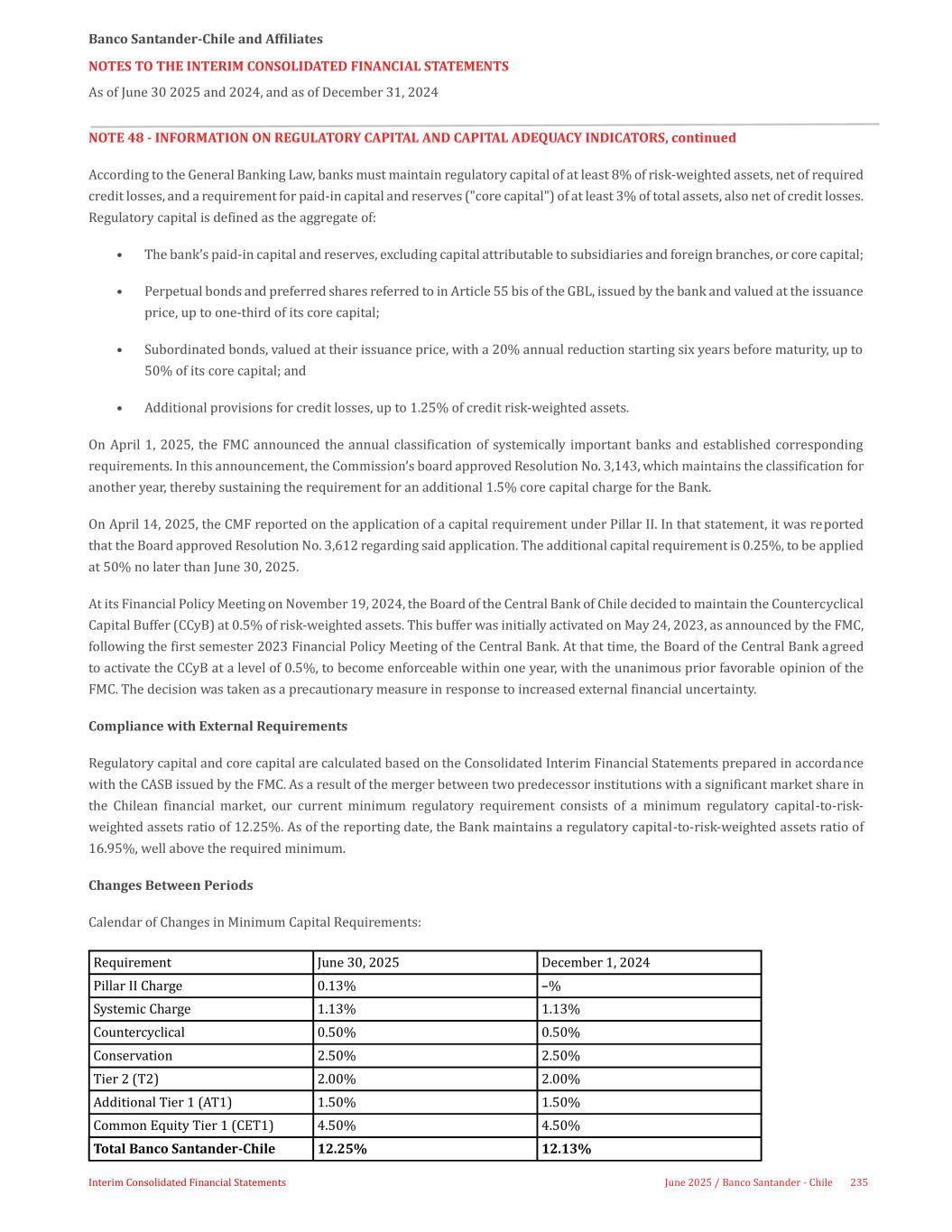 Banco Santander-Chile and Affiliates NOTES TO THE INTERIM CONSOLIDATED FINANCIAL STATEMENTS As of June 30 2025 and 2024, and as of December 31, 2024 Interim Consolidated Financial Statements June 2025 / Banco Santander - Chile 235 NOTE 48 - INFORMATION ON REGULATORY CAPITAL AND CAPITAL ADEQUACY INDICATORS, continued According to the General Banking Law, banks must maintain regulatory capital of at least 8% of risk-weighted assets, net of required credit losses, and a requirement for paid-in capital and reserves ("core capital") of at least 3% of total assets, also net of credit losses. Regulatory capital is defined as the aggregate of: -in capital and reserves, excluding capital attributable to subsidiaries and foreign branches, or core capital; Perpetual bonds and preferred shares referred to in Article 55 bis of the GBL, issued by the bank and valued at the issuance price, up to one-third of its core capital; Subordinated bonds, valued at their issuance price, with a 20% annual reduction starting six years before maturity, up to 50% of its core capital; and Additional provisions for credit losses, up to 1.25% of credit risk-weighted assets. On April 1, 2025, the FMC announced the annual classification of systemically important banks and established corresponding for another year, thereby sustaining the requirement for an additional 1.5% core capital charge for the Bank. On April 14, 2025, the CMF reported on the application of a capital requirement under Pillar II. In that statement, it was reported that the Board approved Resolution No. 3,612 regarding said application. The additional capital requirement is 0.25%, to be applied at 50% no later than June 30, 2025. At its Financial Policy Meeting on November 19, 2024, the Board of the Central Bank of Chile decided to maintain the Countercyclical Capital Buffer (CCyB) at 0.5% of risk-weighted assets. This buffer was initially activated on May 24, 2023, as announced by the FMC, following the first semester 2023 Financial Policy Meeting of the Central Bank. At that time, the Board of the Central Bank agreed to activate the CCyB at a level of 0.5%, to become enforceable within one year, with the unanimous prior favorable opinion of the FMC. The decision was taken as a precautionary measure in response to increased external financial uncertainty. Compliance with External Requirements Regulatory capital and core capital are calculated based on the Consolidated Interim Financial Statements prepared in accordance with the CASB issued by the FMC. As a result of the merger between two predecessor institutions with a significant market share in the Chilean financial market, our current minimum regulatory requirement consists of a minimum regulatory capital-to-risk- weighted assets ratio of 12.25%. As of the reporting date, the Bank maintains a regulatory capital-to-risk-weighted assets ratio of 16.95%, well above the required minimum. Changes Between Periods Calendar of Changes in Minimum Capital Requirements: Requirement June 30, 2025 December 1, 2024 Pillar II Charge 0.13% % Systemic Charge 1.13% 1.13% Countercyclical 0.50% 0.50% Conservation 2.50% 2.50% Tier 2 (T2) 2.00% 2.00% Additional Tier 1 (AT1) 1.50% 1.50% Common Equity Tier 1 (CET1) 4.50% 4.50% Total Banco Santander-Chile 12.25% 12.13%