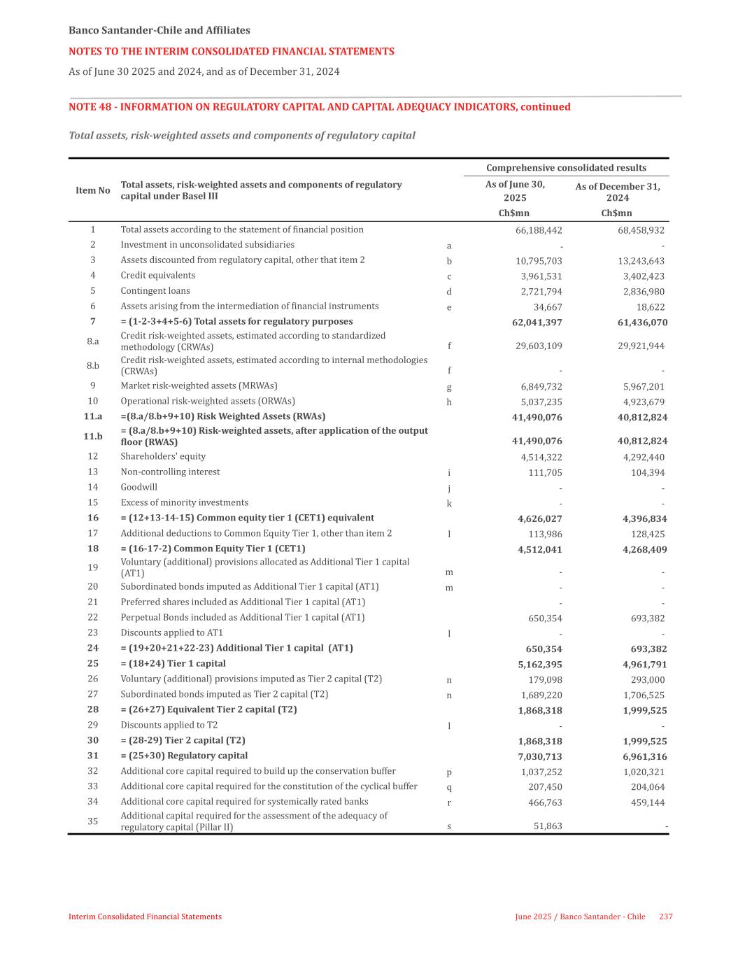 Banco Santander-Chile and Affiliates NOTES TO THE INTERIM CONSOLIDATED FINANCIAL STATEMENTS As of June 30 2025 and 2024, and as of December 31, 2024 Interim Consolidated Financial Statements June 2025 / Banco Santander - Chile 237 NOTE 48 - INFORMATION ON REGULATORY CAPITAL AND CAPITAL ADEQUACY INDICATORS, continued Total assets, risk-weighted assets and components of regulatory capital Item No Total assets, risk-weighted assets and components of regulatory capital under Basel III Comprehensive consolidated results As of June 30, 2025 As of December 31, 2024 Ch$mn Ch$mn 1 Total assets according to the statement of financial position 66,188,442 68,458,932 2 Investment in unconsolidated subsidiaries a - - 3 Assets discounted from regulatory capital, other that item 2 b 10,795,703 13,243,643 4 Credit equivalents c 3,961,531 3,402,423 5 Contingent loans d 2,721,794 2,836,980 6 Assets arising from the intermediation of financial instruments e 34,667 18,622 7 = (1-2-3+4+5-6) Total assets for regulatory purposes 62,041,397 61,436,070 8.a Credit risk-weighted assets, estimated according to standardized methodology (CRWAs) f 29,603,109 29,921,944 8.b Credit risk-weighted assets, estimated according to internal methodologies (CRWAs) f - - 9 Market risk-weighted assets (MRWAs) g 6,849,732 5,967,201 10 Operational risk-weighted assets (ORWAs) h 5,037,235 4,923,679 11.a =(8.a/8.b+9+10) Risk Weighted Assets (RWAs) 41,490,076 40,812,824 11.b = (8.a/8.b+9+10) Risk-weighted assets, after application of the output floor (RWAS) 41,490,076 40,812,824 12 Shareholders' equity 4,514,322 4,292,440 13 Non-controlling interest i 111,705 104,394 14 Goodwill j - - 15 Excess of minority investments k - - 16 = (12+13-14-15) Common equity tier 1 (CET1) equivalent 4,626,027 4,396,834 17 Additional deductions to Common Equity Tier 1, other than item 2 l 113,986 128,425 18 = (16-17-2) Common Equity Tier 1 (CET1) 4,512,041 4,268,409 19 Voluntary (additional) provisions allocated as Additional Tier 1 capital (AT1) m - - 20 Subordinated bonds imputed as Additional Tier 1 capital (AT1) m - - 21 Preferred shares included as Additional Tier 1 capital (AT1) - - 22 Perpetual Bonds included as Additional Tier 1 capital (AT1) 650,354 693,382 23 Discounts applied to AT1 l - - 24 = (19+20+21+22-23) Additional Tier 1 capital (AT1) 650,354 693,382 25 = (18+24) Tier 1 capital 5,162,395 4,961,791 26 Voluntary (additional) provisions imputed as Tier 2 capital (T2) n 179,098 293,000 27 Subordinated bonds imputed as Tier 2 capital (T2) n 1,689,220 1,706,525 28 = (26+27) Equivalent Tier 2 capital (T2) 1,868,318 1,999,525 29 Discounts applied to T2 l - - 30 = (28-29) Tier 2 capital (T2) 1,868,318 1,999,525 31 = (25+30) Regulatory capital 7,030,713 6,961,316 32 Additional core capital required to build up the conservation buffer p 1,037,252 1,020,321 33 Additional core capital required for the constitution of the cyclical buffer q 207,450 204,064 34 Additional core capital required for systemically rated banks r 466,763 459,144 35 Additional capital required for the assessment of the adequacy of regulatory capital (Pillar II) s 51,863 -
