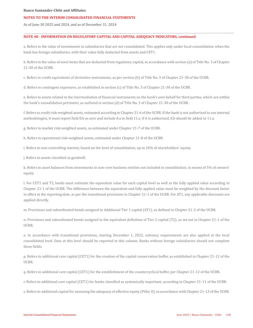 Banco Santander-Chile and Affiliates NOTES TO THE INTERIM CONSOLIDATED FINANCIAL STATEMENTS As of June 30 2025 and 2024, and as of December 31, 2024 Interim Consolidated Financial Statements June 2025 / Banco Santander - Chile 238 NOTE 48 - INFORMATION ON REGULATORY CAPITAL AND CAPITAL ADEQUACY INDICATORS, continued a. Refers to the value of investments in subsidiaries that are not consolidated. This applies only under local consolidation when the bank has foreign subsidiaries, with their value fully deducted from assets and CET1. b. Refers to the value of asset items that are deducted from regulatory capital, in accordance with section (a) of Title No. 3 of Chapter 21-30 of the UCBR. c. Refers to credit equivalents of derivative instruments, as per section (b) of Title No. 3 of Chapter 21-30 of the UCBR. d. Refers to contingent exposures, as established in section (c) of Title No. 3 of Chapter 21-30 of the UCBR. are within -30 of the UCBR. f. Refers to credit risk-weighted assets, estimated according to Chapter 21-6 of the UCBR. If the bank is not authorized to use internal methodologies, it must report field 8.b as zero and include 8.a in field 11.a. If it is authorized, 8.b should be added to 11.a. g. Refers to market risk-weighted assets, as estimated under Chapter 21-7 of the UCBR. h. Refers to operational risk-weighted assets, estimated under Chapter 21-8 of the UCBR. i. Refers to non- j. Refers to assets classified as goodwill. k. Refers to asset balances from investments in non- equity. l. For CET1 and T2, banks must estimate the equivalent value for each capital level as well as the fully applied value according to Chapter 21-1 of the UCBR. The difference between the equivalent and fully applied value must be weighted by the discount factor in effect at the reporting date, as per the transitional provisions in Chapter 21-1 of the UCBR. For AT1, any applicable discounts are applied directly. m. Provisions and subordinated bonds assigned to Additional Tier 1 capital (AT1), as defined in Chapter 21-2 of the UCBR. n. Provisions and subordinated bonds assigned to the equivalent definition of Tier 2 capital (T2), as set out in Chapter 21-1 of the UCBR. o. In accordance with transitional provisions, starting December 1, 2022, solvency requirements are also applied at the local consolidated level. Data at this level should be reported in this column. Banks without foreign subsidiaries should not complete these fields. p. Refers to additional core capital (CET1) for the creation of the capital conservation buffer, as established in Chapter 21-12 of the UCBR. q. Refers to additional core capital (CET1) for the establishment of the countercyclical buffer, per Chapter 21-12 of the UCBR. r. Refers to additional core capital (CET1) for banks classified as systemically important, according to Chapter 21-11 of the UCBR. s. Refers to additional capital for assessing the adequacy of effective equity (Pillar II), in accordance with Chapter 21-13 of the UCBR.