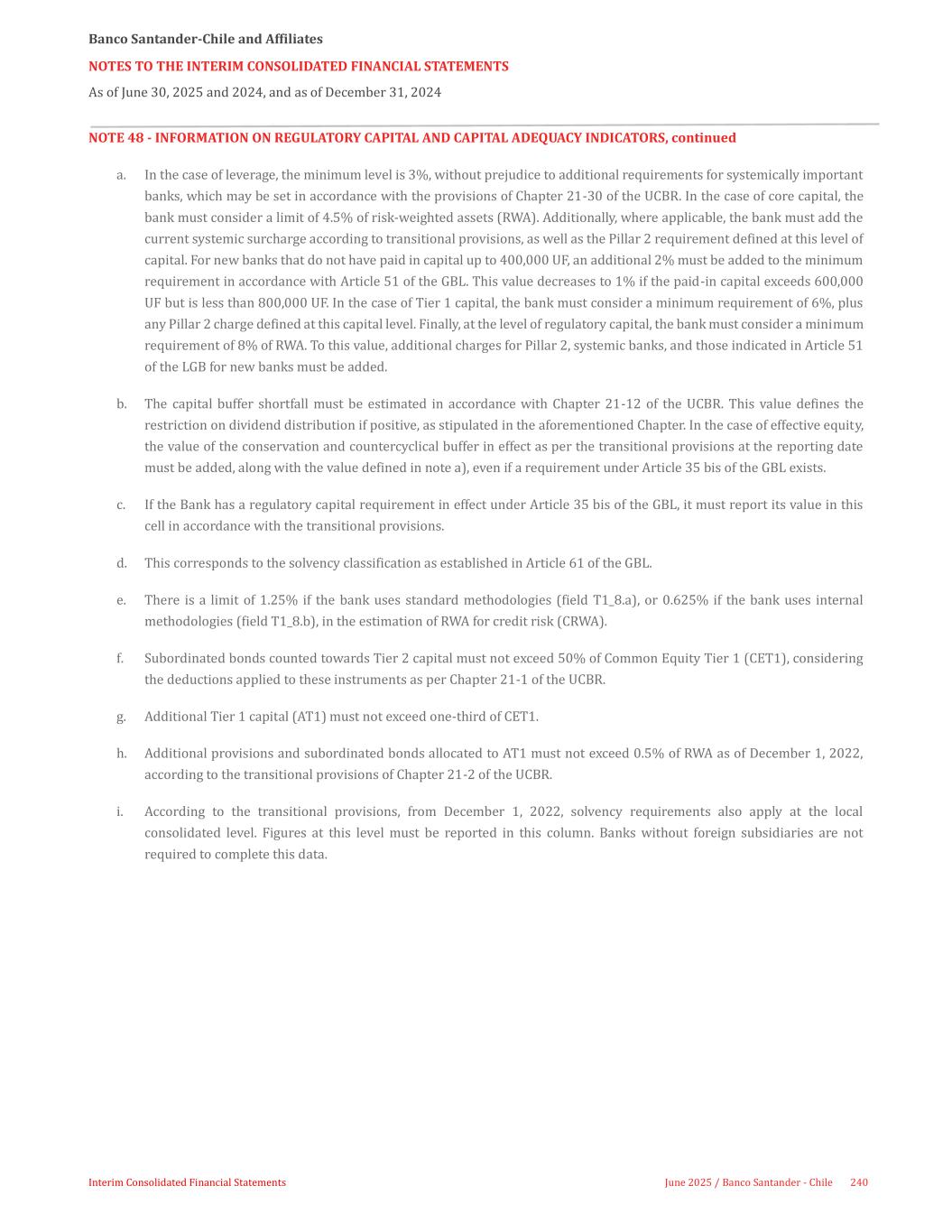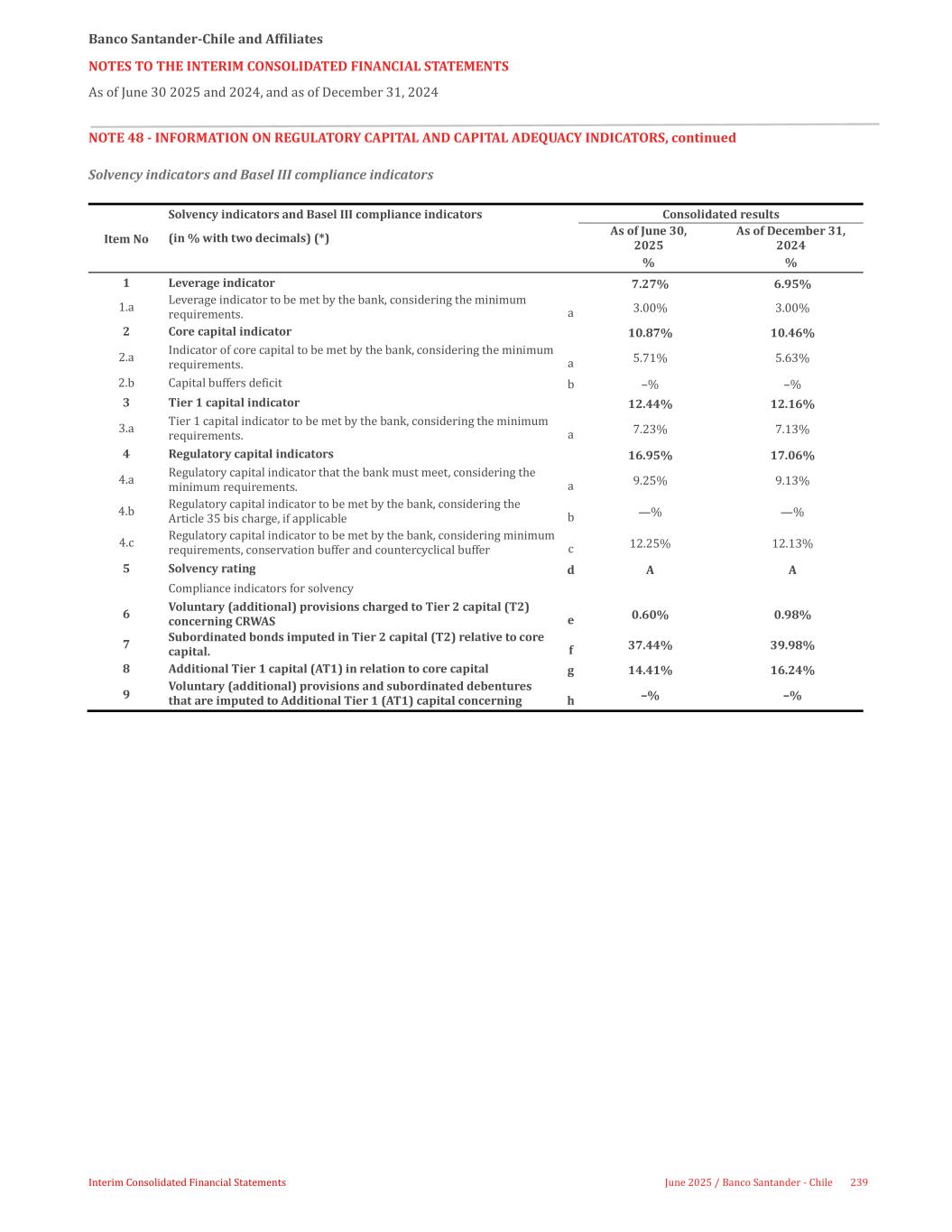 Banco Santander-Chile and Affiliates NOTES TO THE INTERIM CONSOLIDATED FINANCIAL STATEMENTS As of June 30 2025 and 2024, and as of December 31, 2024 Interim Consolidated Financial Statements June 2025 / Banco Santander - Chile 239 NOTE 48 - INFORMATION ON REGULATORY CAPITAL AND CAPITAL ADEQUACY INDICATORS, continued Solvency indicators and Basel III compliance indicators Item No Solvency indicators and Basel III compliance indicators Consolidated results (in % with two decimals) (*) As of June 30, 2025 As of December 31, 2024 % % 1 Leverage indicator 7.27% 6.95% 1.a Leverage indicator to be met by the bank, considering the minimum requirements. a 3.00% 3.00% 2 Core capital indicator 10.87% 10.46% 2.a Indicator of core capital to be met by the bank, considering the minimum requirements. a 5.71% 5.63% 2.b Capital buffers deficit b % % 3 Tier 1 capital indicator 12.44% 12.16% 3.a Tier 1 capital indicator to be met by the bank, considering the minimum requirements. a 7.23% 7.13% 4 Regulatory capital indicators 16.95% 17.06% 4.a Regulatory capital indicator that the bank must meet, considering the minimum requirements. a 9.25% 9.13% 4.b Regulatory capital indicator to be met by the bank, considering the Article 35 bis charge, if applicable b % % 4.c Regulatory capital indicator to be met by the bank, considering minimum requirements, conservation buffer and countercyclical buffer c 12.25% 12.13% 5 Solvency rating d A A Compliance indicators for solvency 6 Voluntary (additional) provisions charged to Tier 2 capital (T2) concerning CRWAS e 0.60% 0.98% 7 Subordinated bonds imputed in Tier 2 capital (T2) relative to core capital. f 37.44% 39.98% 8 Additional Tier 1 capital (AT1) in relation to core capital g 14.41% 16.24% 9 Voluntary (additional) provisions and subordinated debentures that are imputed to Additional Tier 1 (AT1) capital concerning h % %