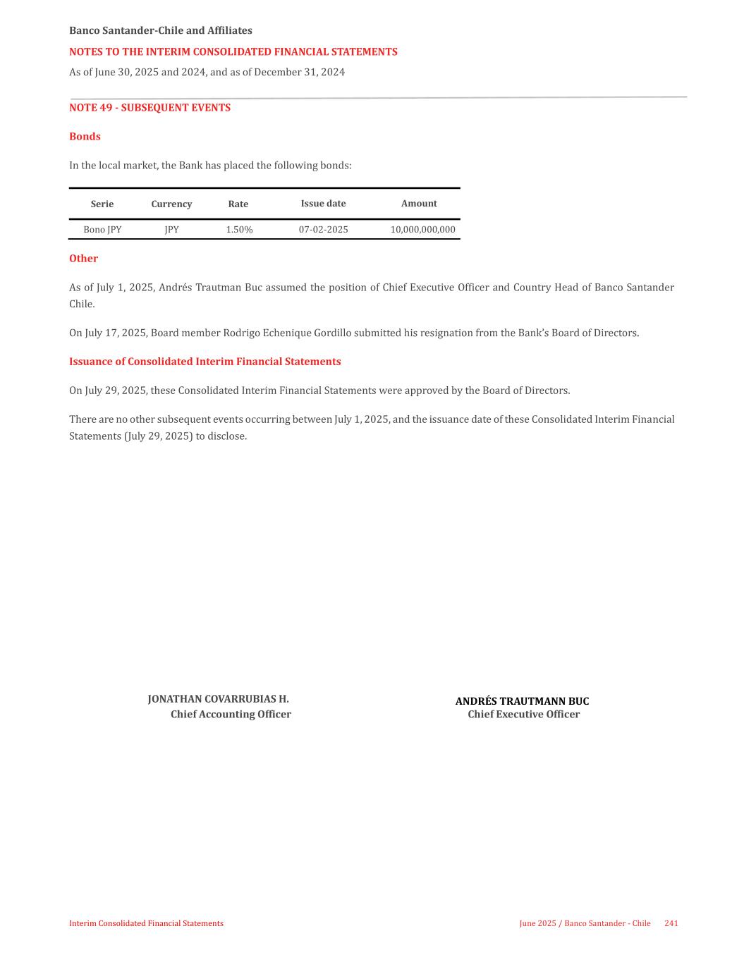 Banco Santander-Chile and Affiliates NOTES TO THE INTERIM CONSOLIDATED FINANCIAL STATEMENTS As of June 30, 2025 and 2024, and as of December 31, 2024 Interim Consolidated Financial Statements June 2025 / Banco Santander - Chile 241 NOTE 49 - SUBSEQUENT EVENTS Bonds In the local market, the Bank has placed the following bonds: Serie Currency Rate Issue date Amount Bono JPY JPY 1.50% 07-02-2025 10,000,000,000 Other As of July 1, 2025, Andrés Trautman Buc assumed the position of Chief Executive Officer and Country Head of Banco Santander Chile. On July 17, 2025, B Issuance of Consolidated Interim Financial Statements On July 29, 2025, these Consolidated Interim Financial Statements were approved by the Board of Directors. There are no other subsequent events occurring between July 1, 2025, and the issuance date of these Consolidated Interim Financial Statements (July 29, 2025) to disclose. JONATHAN COVARRUBIAS H. Chief Accounting Officer ANDRÉS TRAUTMANN BUC Chief Executive Officer