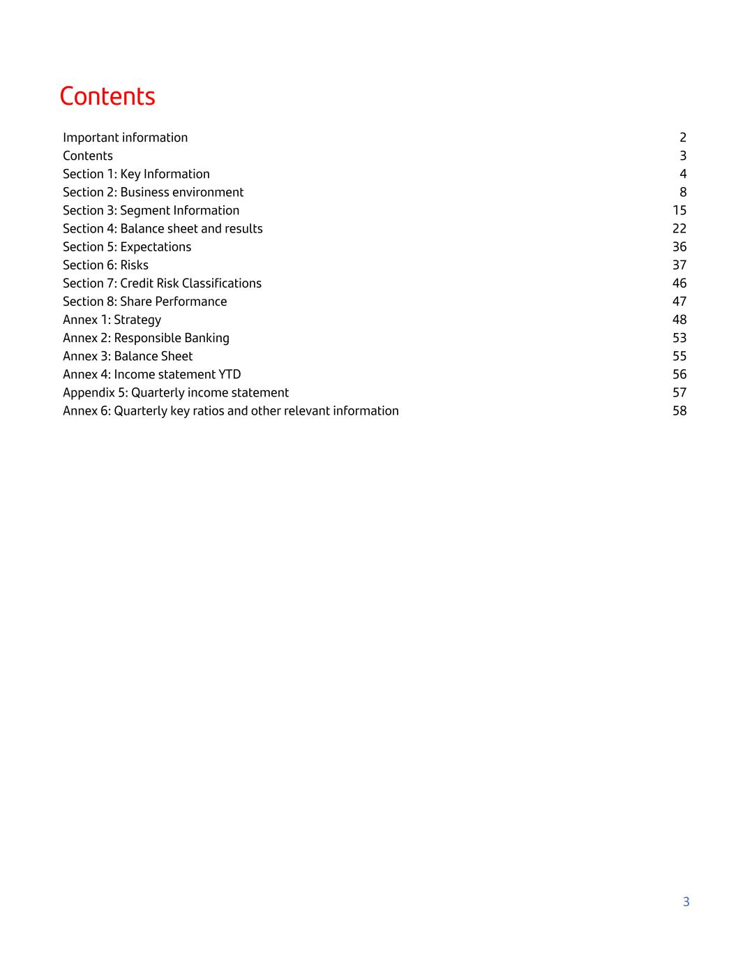 Contents Important information 2 Contents 3 Section 1: Key Information 4 Section 2: Business environment 8 Section 3: Segment Information 15 Section 4: Balance sheet and results 22 Section 5: Expectations 36 Section 6: Risks 37 Section 7: Credit Risk Classifications 46 Section 8: Share Performance 47 Annex 1: Strategy 48 Annex 2: Responsible Banking 53 Annex 3: Balance Sheet 55 Annex 4: Income statement YTD 56 Appendix 5: Quarterly income statement 57 Annex 6: Quarterly key ratios and other relevant information 58 3