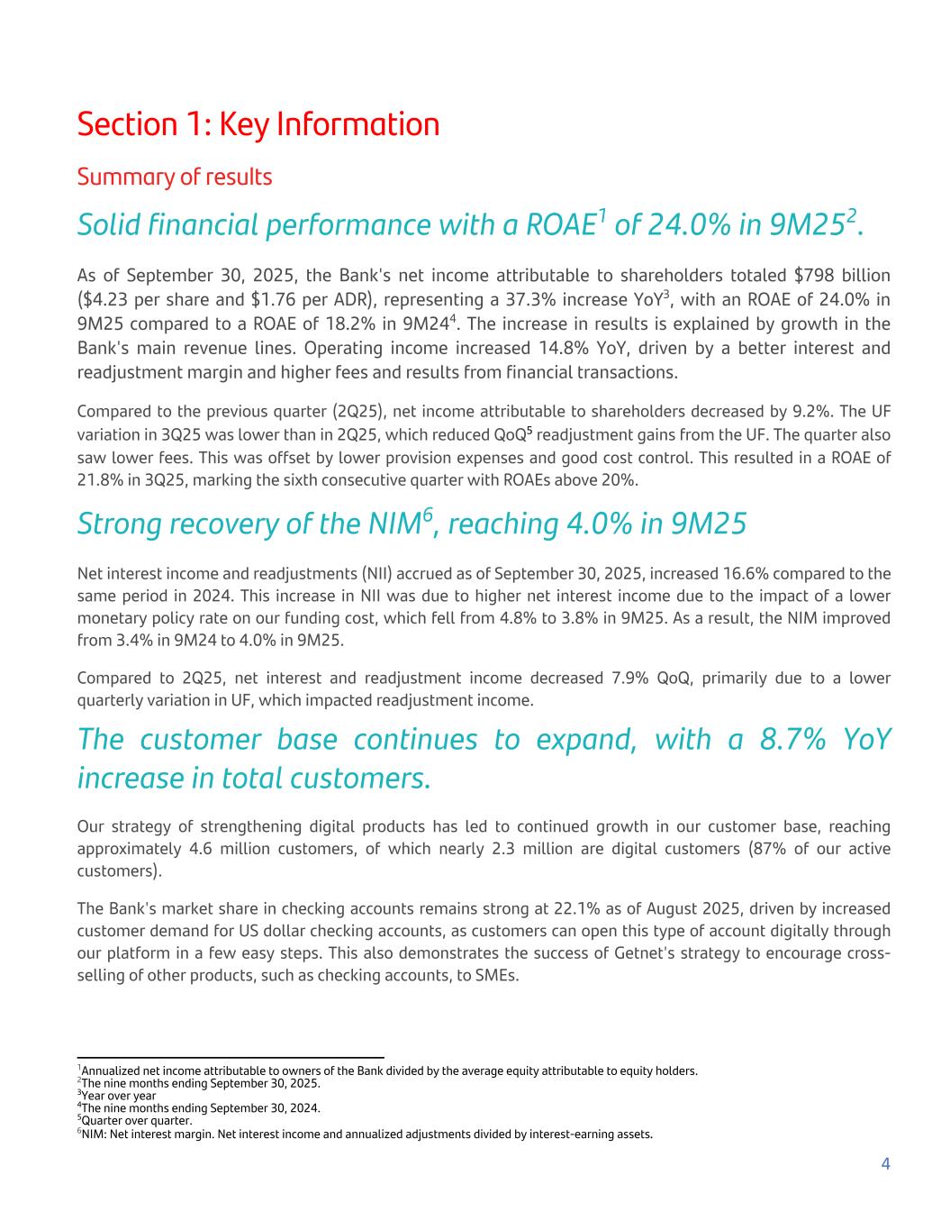 Section 1: Key Information Summary of results Solid financial performance with a ROAE1 of 24.0% in 9M252. As of September 30, 2025, the Bank's net income attributable to shareholders totaled $798 billion ($4.23 per share and $1.76 per ADR), representing a 37.3% increase YoY3, with an ROAE of 24.0% in 9M25 compared to a ROAE of 18.2% in 9M244. The increase in results is explained by growth in the Bank's main revenue lines. Operating income increased 14.8% YoY, driven by a better interest and readjustment margin and higher fees and results from financial transactions. Compared to the previous quarter (2Q25), net income attributable to shareholders decreased by 9.2%. The UF variation in 3Q25 was lower than in 2Q25, which reduced QoQ5 readjustment gains from the UF. The quarter also saw lower fees. This was offset by lower provision expenses and good cost control. This resulted in a ROAE of 21.8% in 3Q25, marking the sixth consecutive quarter with ROAEs above 20%. Strong recovery of the NIM6, reaching 4.0% in 9M25 Net interest income and readjustments (NII) accrued as of September 30, 2025, increased 16.6% compared to the same period in 2024. This increase in NII was due to higher net interest income due to the impact of a lower monetary policy rate on our funding cost, which fell from 4.8% to 3.8% in 9M25. As a result, the NIM improved from 3.4% in 9M24 to 4.0% in 9M25. Compared to 2Q25, net interest and readjustment income decreased 7.9% QoQ, primarily due to a lower quarterly variation in UF, which impacted readjustment income. The customer base continues to expand, with a 8.7% YoY increase in total customers. Our strategy of strengthening digital products has led to continued growth in our customer base, reaching approximately 4.6 million customers, of which nearly 2.3 million are digital customers (87% of our active customers). The Bank's market share in checking accounts remains strong at 22.1% as of August 2025, driven by increased customer demand for US dollar checking accounts, as customers can open this type of account digitally through our platform in a few easy steps. This also demonstrates the success of Getnet's strategy to encourage cross- selling of other products, such as checking accounts, to SMEs. 4 1Annualized net income attributable to owners of the Bank divided by the average equity attributable to equity holders. 2The nine months ending September 30, 2025. 3Year over year 4The nine months ending September 30, 2024. 5Quarter over quarter. 6NIM: Net interest margin. Net interest income and annualized adjustments divided by interest-earning assets.