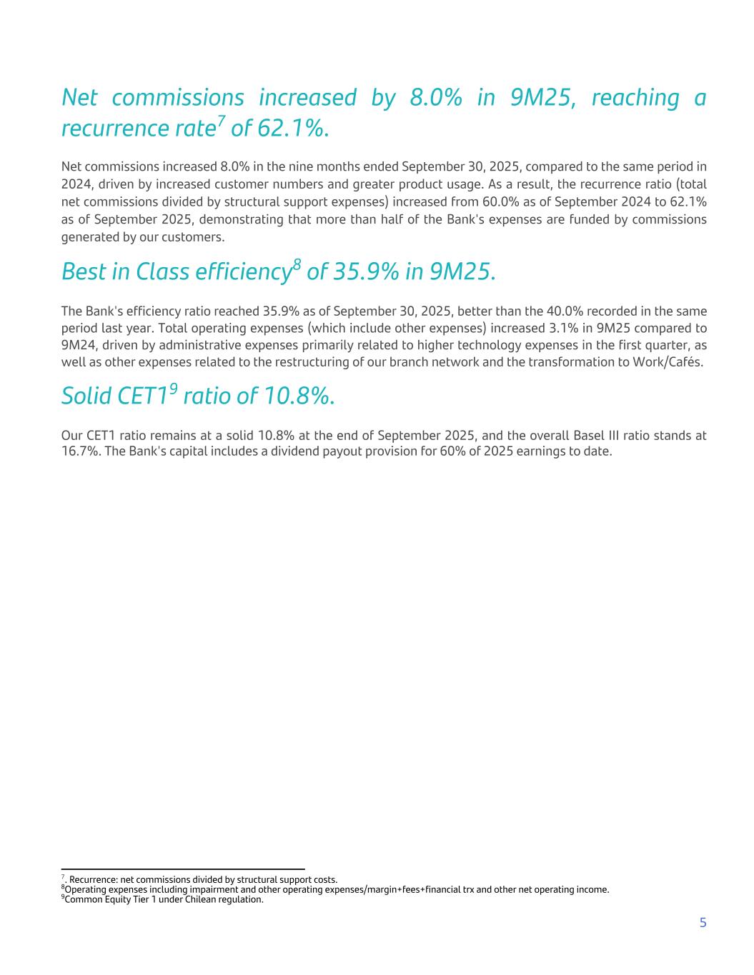 Net commissions increased by 8.0% in 9M25, reaching a recurrence rate7 of 62.1%. Net commissions increased 8.0% in the nine months ended September 30, 2025, compared to the same period in 2024, driven by increased customer numbers and greater product usage. As a result, the recurrence ratio (total net commissions divided by structural support expenses) increased from 60.0% as of September 2024 to 62.1% as of September 2025, demonstrating that more than half of the Bank's expenses are funded by commissions generated by our customers. Best in Class efficiency8 of 35.9% in 9M25. The Bank's efficiency ratio reached 35.9% as of September 30, 2025, better than the 40.0% recorded in the same period last year. Total operating expenses (which include other expenses) increased 3.1% in 9M25 compared to 9M24, driven by administrative expenses primarily related to higher technology expenses in the first quarter, as well as other expenses related to the restructuring of our branch network and the transformation to Work/Cafés. Solid CET19 ratio of 10.8%. Our CET1 ratio remains at a solid 10.8% at the end of September 2025, and the overall Basel III ratio stands at 16.7%. The Bank's capital includes a dividend payout provision for 60% of 2025 earnings to date. 5 7. Recurrence: net commissions divided by structural support costs. 8Operating expenses including impairment and other operating expenses/margin+fees+financial trx and other net operating income. 9Common Equity Tier 1 under Chilean regulation.
