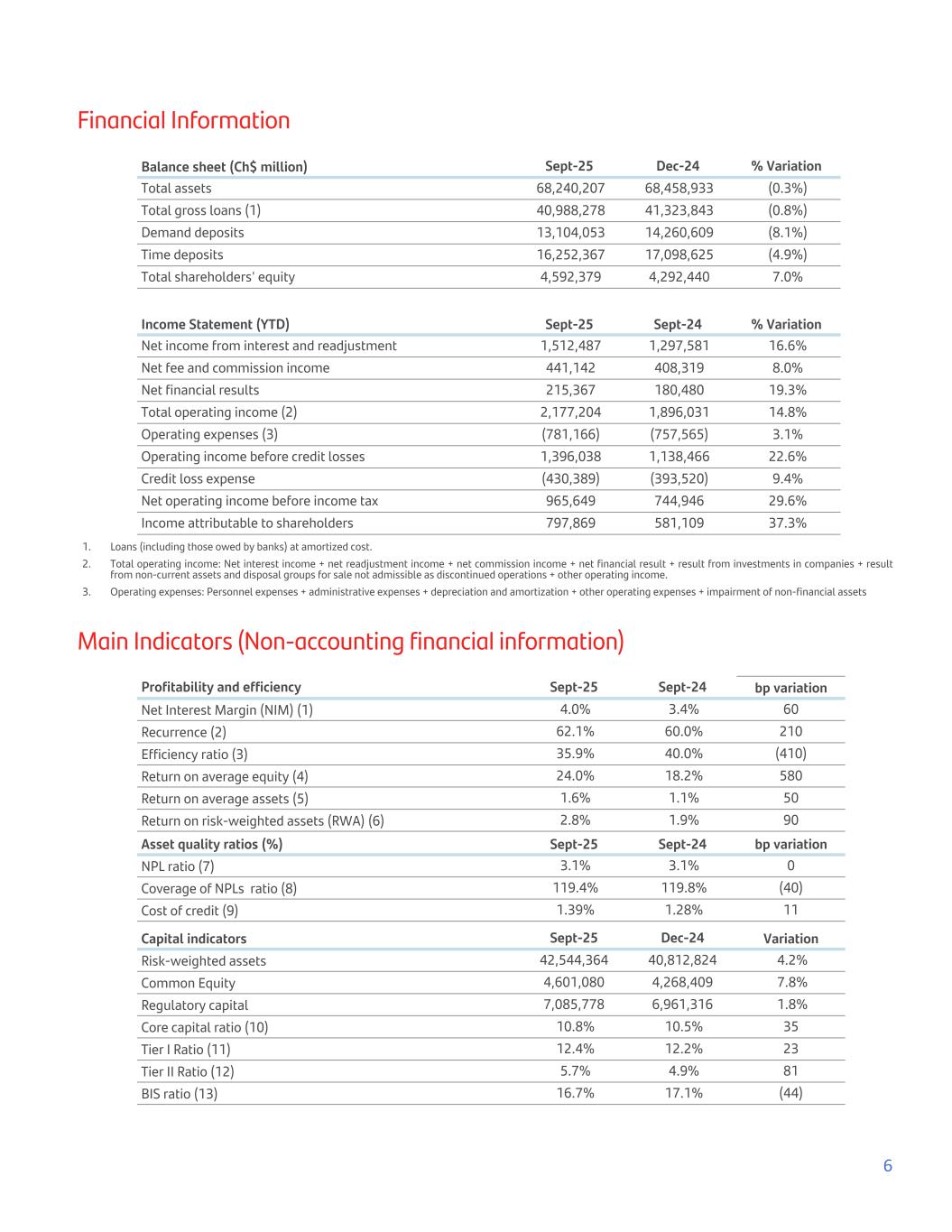 Financial Information Balance sheet (Ch$ million) Sept-25 Dec-24 % Variation Total assets 68,240,207 68,458,933 (0.3%) Total gross loans (1) 40,988,278 41,323,843 (0.8%) Demand deposits 13,104,053 14,260,609 (8.1%) Time deposits 16,252,367 17,098,625 (4.9%) Total shareholders' equity 4,592,379 4,292,440 7.0% Income Statement (YTD) Sept-25 Sept-24 % Variation Net income from interest and readjustment 1,512,487 1,297,581 16.6% Net fee and commission income 441,142 408,319 8.0% Net financial results 215,367 180,480 19.3% Total operating income (2) 2,177,204 1,896,031 14.8% Operating expenses (3) (781,166) (757,565) 3.1% Operating income before credit losses 1,396,038 1,138,466 22.6% Credit loss expense (430,389) (393,520) 9.4% Net operating income before income tax 965,649 744,946 29.6% Income attributable to shareholders 797,869 581,109 37.3% 1. Loans (including those owed by banks) at amortized cost. 2. Total operating income: Net interest income + net readjustment income + net commission income + net financial result + result from investments in companies + result from non-current assets and disposal groups for sale not admissible as discontinued operations + other operating income. 3. Operating expenses: Personnel expenses + administrative expenses + depreciation and amortization + other operating expenses + impairment of non-financial assets Main Indicators (Non-accounting financial information) Profitability and efficiency Sept-25 Sept-24 bp variation Net Interest Margin (NIM) (1) 4.0% 3.4% 60 Recurrence (2) 62.1% 60.0% 210 Efficiency ratio (3) 35.9% 40.0% (410) Return on average equity (4) 24.0% 18.2% 580 Return on average assets (5) 1.6% 1.1% 50 Return on risk-weighted assets (RWA) (6) 2.8% 1.9% 90 Asset quality ratios (%) Sept-25 Sept-24 bp variation NPL ratio (7) 3.1% 3.1% 0 Coverage of NPLs ratio (8) 119.4% 119.8% (40) Cost of credit (9) 1.39% 1.28% 11 Capital indicators Sept-25 Dec-24 Variation Risk-weighted assets 42,544,364 40,812,824 4.2% Common Equity 4,601,080 4,268,409 7.8% Regulatory capital 7,085,778 6,961,316 1.8% Core capital ratio (10) 10.8% 10.5% 35 Tier I Ratio (11) 12.4% 12.2% 23 Tier II Ratio (12) 5.7% 4.9% 81 BIS ratio (13) 16.7% 17.1% (44) 6