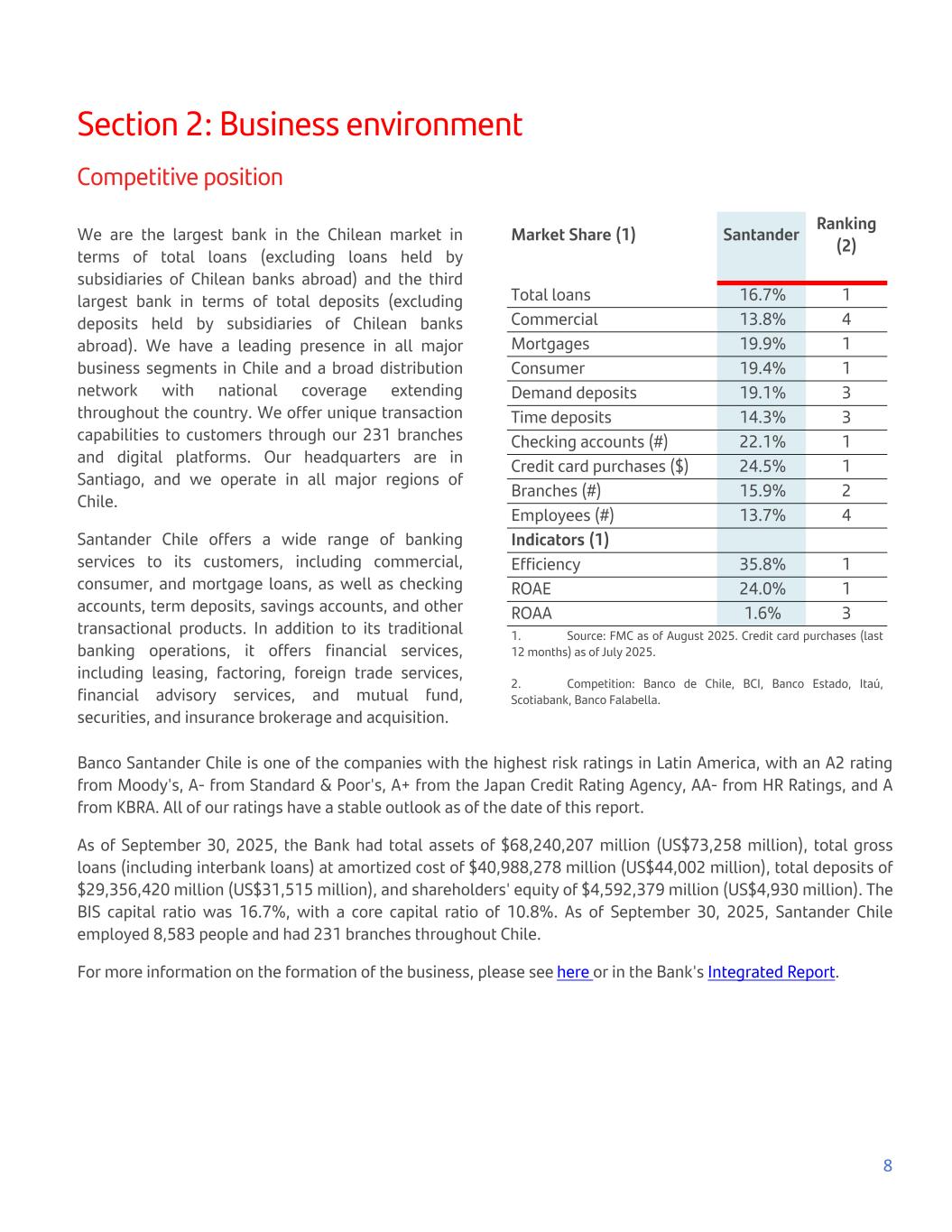Section 2: Business environment Competitive position We are the largest bank in the Chilean market in terms of total loans (excluding loans held by subsidiaries of Chilean banks abroad) and the third largest bank in terms of total deposits (excluding deposits held by subsidiaries of Chilean banks abroad). We have a leading presence in all major business segments in Chile and a broad distribution network with national coverage extending throughout the country. We offer unique transaction capabilities to customers through our 231 branches and digital platforms. Our headquarters are in Santiago, and we operate in all major regions of Chile. Santander Chile offers a wide range of banking services to its customers, including commercial, consumer, and mortgage loans, as well as checking accounts, term deposits, savings accounts, and other transactional products. In addition to its traditional banking operations, it offers financial services, including leasing, factoring, foreign trade services, financial advisory services, and mutual fund, securities, and insurance brokerage and acquisition. Market Share (1) Santander Ranking (2) Total loans 16.7% 1 Commercial 13.8% 4 Mortgages 19.9% 1 Consumer 19.4% 1 Demand deposits 19.1% 3 Time deposits 14.3% 3 Checking accounts (#) 22.1% 1 Credit card purchases ($) 24.5% 1 Branches (#) 15.9% 2 Employees (#) 13.7% 4 Indicators (1) Efficiency 35.8% 1 ROAE 24.0% 1 ROAA 1.6% 3 1. Source: FMC as of August 2025. Credit card purchases (last 12 months) as of July 2025. 2. Competition: Banco de Chile, BCI, Banco Estado, Itaú, Scotiabank, Banco Falabella. Banco Santander Chile is one of the companies with the highest risk ratings in Latin America, with an A2 rating from Moody's, A- from Standard & Poor's, A+ from the Japan Credit Rating Agency, AA- from HR Ratings, and A from KBRA. All of our ratings have a stable outlook as of the date of this report. As of September 30, 2025, the Bank had total assets of $68,240,207 million (US$73,258 million), total gross loans (including interbank loans) at amortized cost of $40,988,278 million (US$44,002 million), total deposits of $29,356,420 million (US$31,515 million), and shareholders' equity of $4,592,379 million (US$4,930 million). The BIS capital ratio was 16.7%, with a core capital ratio of 10.8%. As of September 30, 2025, Santander Chile employed 8,583 people and had 231 branches throughout Chile. For more information on the formation of the business, please see here or in the Bank's Integrated Report. 8