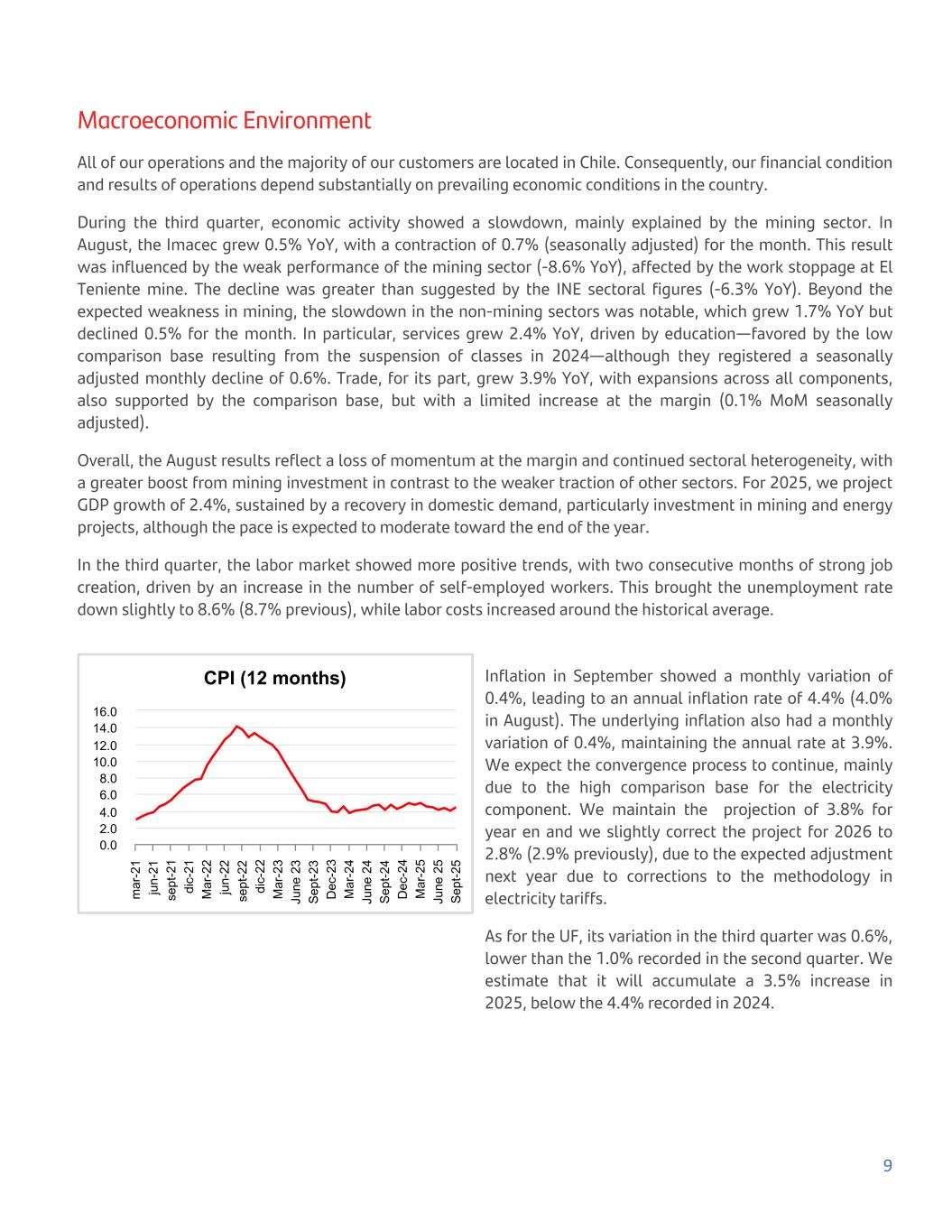 Macroeconomic Environment All of our operations and the majority of our customers are located in Chile. Consequently, our financial condition and results of operations depend substantially on prevailing economic conditions in the country. During the third quarter, economic activity showed a slowdown, mainly explained by the mining sector. In August, the Imacec grew 0.5% YoY, with a contraction of 0.7% (seasonally adjusted) for the month. This result was influenced by the weak performance of the mining sector (-8.6% YoY), affected by the work stoppage at El Teniente mine. The decline was greater than suggested by the INE sectoral figures (-6.3% YoY). Beyond the expected weakness in mining, the slowdown in the non-mining sectors was notable, which grew 1.7% YoY but declined 0.5% for the month. In particular, services grew 2.4% YoY, driven by education—favored by the low comparison base resulting from the suspension of classes in 2024—although they registered a seasonally adjusted monthly decline of 0.6%. Trade, for its part, grew 3.9% YoY, with expansions across all components, also supported by the comparison base, but with a limited increase at the margin (0.1% MoM seasonally adjusted). Overall, the August results reflect a loss of momentum at the margin and continued sectoral heterogeneity, with a greater boost from mining investment in contrast to the weaker traction of other sectors. For 2025, we project GDP growth of 2.4%, sustained by a recovery in domestic demand, particularly investment in mining and energy projects, although the pace is expected to moderate toward the end of the year. In the third quarter, the labor market showed more positive trends, with two consecutive months of strong job creation, driven by an increase in the number of self-employed workers. This brought the unemployment rate down slightly to 8.6% (8.7% previous), while labor costs increased around the historical average. CPI (12 months) m ar -2 1 ju n- 21 se pt -2 1 di c- 21 M ar -2 2 ju n- 22 se pt -2 2 di c- 22 M ar -2 3 Ju ne 2 3 S ep t-2 3 D ec -2 3 M ar -2 4 Ju ne 2 4 S ep t-2 4 D ec -2 4 M ar -2 5 Ju ne 2 5 S ep t-2 5 0.0 2.0 4.0 6.0 8.0 10.0 12.0 14.0 16.0 Inflation in September showed a monthly variation of 0.4%, leading to an annual inflation rate of 4.4% (4.0% in August). The underlying inflation also had a monthly variation of 0.4%, maintaining the annual rate at 3.9%. We expect the convergence process to continue, mainly due to the high comparison base for the electricity component. We maintain the projection of 3.8% for year en and we slightly correct the project for 2026 to 2.8% (2.9% previously), due to the expected adjustment next year due to corrections to the methodology in electricity tariffs. As for the UF, its variation in the third quarter was 0.6%, lower than the 1.0% recorded in the second quarter. We estimate that it will accumulate a 3.5% increase in 2025, below the 4.4% recorded in 2024. 9