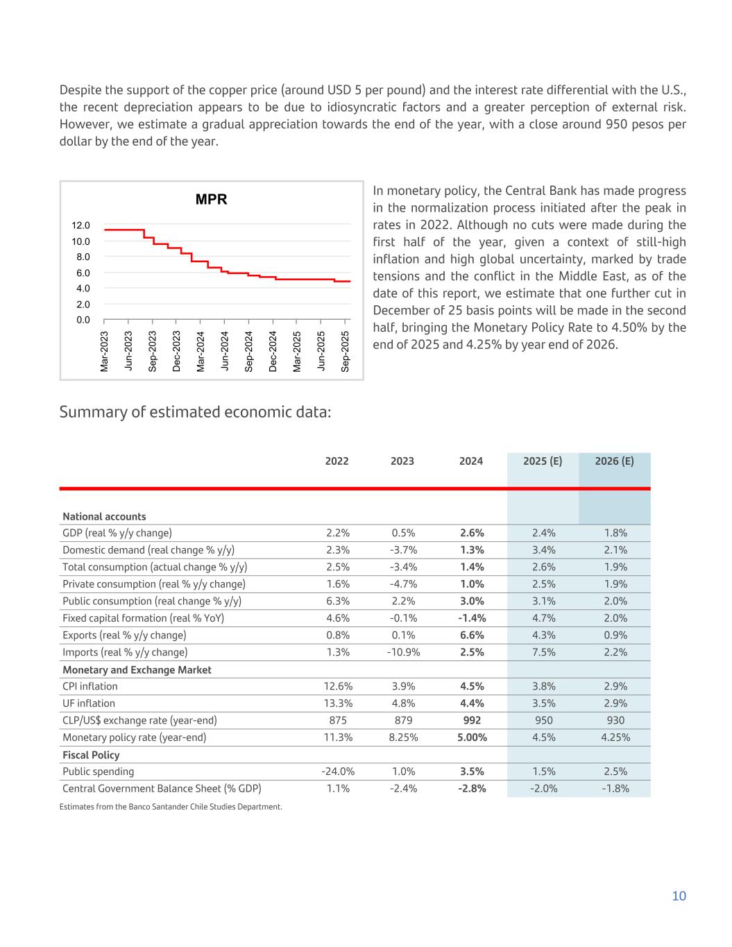Despite the support of the copper price (around USD 5 per pound) and the interest rate differential with the U.S., the recent depreciation appears to be due to idiosyncratic factors and a greater perception of external risk. However, we estimate a gradual appreciation towards the end of the year, with a close around 950 pesos per dollar by the end of the year. MPR M ar -2 02 3 Ju n- 20 23 S ep -2 02 3 D ec -2 02 3 M ar -2 02 4 Ju n- 20 24 S ep -2 02 4 D ec -2 02 4 M ar -2 02 5 Ju n- 20 25 S ep -2 02 5 0.0 2.0 4.0 6.0 8.0 10.0 12.0 In monetary policy, the Central Bank has made progress in the normalization process initiated after the peak in rates in 2022. Although no cuts were made during the first half of the year, given a context of still-high inflation and high global uncertainty, marked by trade tensions and the conflict in the Middle East, as of the date of this report, we estimate that one further cut in December of 25 basis points will be made in the second half, bringing the Monetary Policy Rate to 4.50% by the end of 2025 and 4.25% by year end of 2026. Summary of estimated economic data: 2022 2023 2024 2025 (E) 2026 (E) National accounts GDP (real % y/y change) 2.2% 0.5% 2.6% 2.4% 1.8% Domestic demand (real change % y/y) 2.3% -3.7% 1.3% 3.4% 2.1% Total consumption (actual change % y/y) 2.5% -3.4% 1.4% 2.6% 1.9% Private consumption (real % y/y change) 1.6% -4.7% 1.0% 2.5% 1.9% Public consumption (real change % y/y) 6.3% 2.2% 3.0% 3.1% 2.0% Fixed capital formation (real % YoY) 4.6% -0.1% -1.4% 4.7% 2.0% Exports (real % y/y change) 0.8% 0.1% 6.6% 4.3% 0.9% Imports (real % y/y change) 1.3% -10.9% 2.5% 7.5% 2.2% Monetary and Exchange Market CPI inflation 12.6% 3.9% 4.5% 3.8% 2.9% UF inflation 13.3% 4.8% 4.4% 3.5% 2.9% CLP/US$ exchange rate (year-end) 875 879 992 950 930 Monetary policy rate (year-end) 11.3% 8.25% 5.00% 4.5% 4.25% Fiscal Policy Public spending -24.0% 1.0% 3.5% 1.5% 2.5% Central Government Balance Sheet (% GDP) 1.1% -2.4% -2.8% -2.0% -1.8% Estimates from the Banco Santander Chile Studies Department. 10