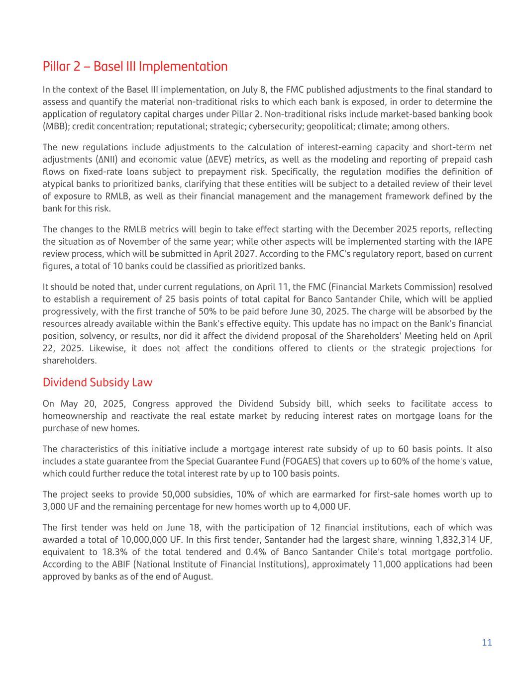 Pillar 2 – Basel III Implementation In the context of the Basel III implementation, on July 8, the FMC published adjustments to the final standard to assess and quantify the material non-traditional risks to which each bank is exposed, in order to determine the application of regulatory capital charges under Pillar 2. Non-traditional risks include market-based banking book (MBB); credit concentration; reputational; strategic; cybersecurity; geopolitical; climate; among others. The new regulations include adjustments to the calculation of interest-earning capacity and short-term net adjustments (ΔNII) and economic value (ΔEVE) metrics, as well as the modeling and reporting of prepaid cash flows on fixed-rate loans subject to prepayment risk. Specifically, the regulation modifies the definition of atypical banks to prioritized banks, clarifying that these entities will be subject to a detailed review of their level of exposure to RMLB, as well as their financial management and the management framework defined by the bank for this risk. The changes to the RMLB metrics will begin to take effect starting with the December 2025 reports, reflecting the situation as of November of the same year; while other aspects will be implemented starting with the IAPE review process, which will be submitted in April 2027. According to the FMC's regulatory report, based on current figures, a total of 10 banks could be classified as prioritized banks. It should be noted that, under current regulations, on April 11, the FMC (Financial Markets Commission) resolved to establish a requirement of 25 basis points of total capital for Banco Santander Chile, which will be applied progressively, with the first tranche of 50% to be paid before June 30, 2025. The charge will be absorbed by the resources already available within the Bank's effective equity. This update has no impact on the Bank's financial position, solvency, or results, nor did it affect the dividend proposal of the Shareholders' Meeting held on April 22, 2025. Likewise, it does not affect the conditions offered to clients or the strategic projections for shareholders. Dividend Subsidy Law On May 20, 2025, Congress approved the Dividend Subsidy bill, which seeks to facilitate access to homeownership and reactivate the real estate market by reducing interest rates on mortgage loans for the purchase of new homes. The characteristics of this initiative include a mortgage interest rate subsidy of up to 60 basis points. It also includes a state guarantee from the Special Guarantee Fund (FOGAES) that covers up to 60% of the home's value, which could further reduce the total interest rate by up to 100 basis points. The project seeks to provide 50,000 subsidies, 10% of which are earmarked for first-sale homes worth up to 3,000 UF and the remaining percentage for new homes worth up to 4,000 UF. The first tender was held on June 18, with the participation of 12 financial institutions, each of which was awarded a total of 10,000,000 UF. In this first tender, Santander had the largest share, winning 1,832,314 UF, equivalent to 18.3% of the total tendered and 0.4% of Banco Santander Chile's total mortgage portfolio. According to the ABIF (National Institute of Financial Institutions), approximately 11,000 applications had been approved by banks as of the end of August. 11