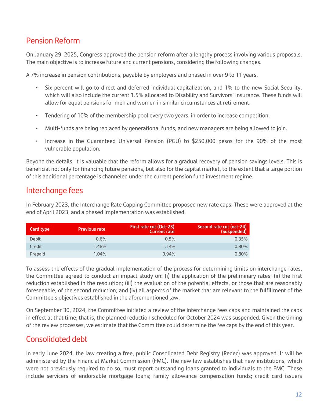 Pension Reform On January 29, 2025, Congress approved the pension reform after a lengthy process involving various proposals. The main objective is to increase future and current pensions, considering the following changes. A 7% increase in pension contributions, payable by employers and phased in over 9 to 11 years. • Six percent will go to direct and deferred individual capitalization, and 1% to the new Social Security, which will also include the current 1.5% allocated to Disability and Survivors' Insurance. These funds will allow for equal pensions for men and women in similar circumstances at retirement. • Tendering of 10% of the membership pool every two years, in order to increase competition. • Multi-funds are being replaced by generational funds, and new managers are being allowed to join. • Increase in the Guaranteed Universal Pension (PGU) to $250,000 pesos for the 90% of the most vulnerable population. Beyond the details, it is valuable that the reform allows for a gradual recovery of pension savings levels. This is beneficial not only for financing future pensions, but also for the capital market, to the extent that a large portion of this additional percentage is channeled under the current pension fund investment regime. Interchange fees In February 2023, the Interchange Rate Capping Committee proposed new rate caps. These were approved at the end of April 2023, and a phased implementation was established. Card type Previous rate First rate cut (Oct-23) Current rate Second rate cut (oct-24) (Suspended) Debit 0.6% 0.5% 0.35% Credit 1.48% 1.14% 0.80% Prepaid 1.04% 0.94% 0.80% To assess the effects of the gradual implementation of the process for determining limits on interchange rates, the Committee agreed to conduct an impact study on: (i) the application of the preliminary rates; (ii) the first reduction established in the resolution; (iii) the evaluation of the potential effects, or those that are reasonably foreseeable, of the second reduction; and (iv) all aspects of the market that are relevant to the fulfillment of the Committee's objectives established in the aforementioned law. On September 30, 2024, the Committee initiated a review of the interchange fees caps and maintained the caps in effect at that time; that is, the planned reduction scheduled for October 2024 was suspended. Given the timing of the review processes, we estimate that the Committee could determine the fee caps by the end of this year. Consolidated debt In early June 2024, the law creating a free, public Consolidated Debt Registry (Redec) was approved. It will be administered by the Financial Market Commission (FMC). The new law establishes that new institutions, which were not previously required to do so, must report outstanding loans granted to individuals to the FMC. These include servicers of endorsable mortgage loans; family allowance compensation funds; credit card issuers 12