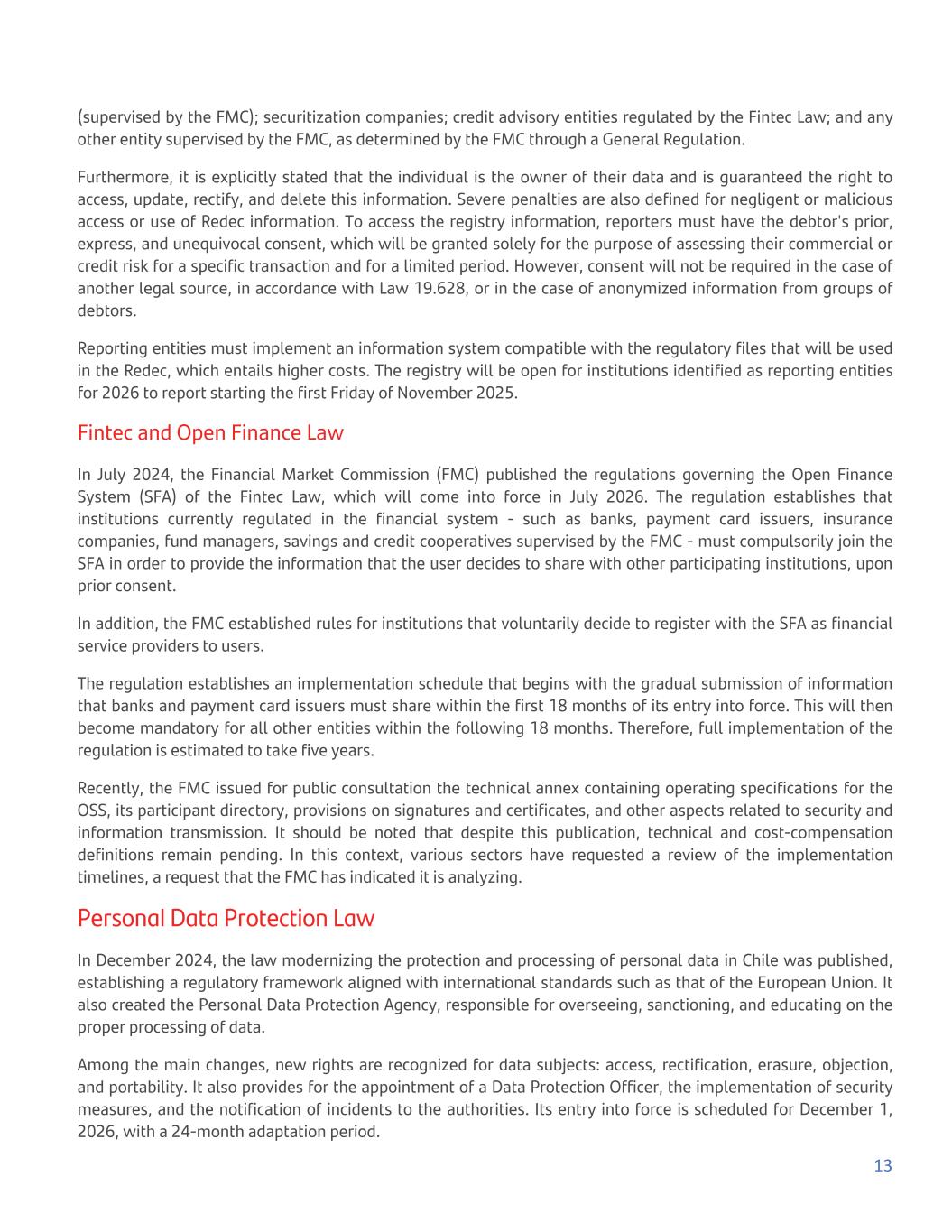 (supervised by the FMC); securitization companies; credit advisory entities regulated by the Fintec Law; and any other entity supervised by the FMC, as determined by the FMC through a General Regulation. Furthermore, it is explicitly stated that the individual is the owner of their data and is guaranteed the right to access, update, rectify, and delete this information. Severe penalties are also defined for negligent or malicious access or use of Redec information. To access the registry information, reporters must have the debtor's prior, express, and unequivocal consent, which will be granted solely for the purpose of assessing their commercial or credit risk for a specific transaction and for a limited period. However, consent will not be required in the case of another legal source, in accordance with Law 19.628, or in the case of anonymized information from groups of debtors. Reporting entities must implement an information system compatible with the regulatory files that will be used in the Redec, which entails higher costs. The registry will be open for institutions identified as reporting entities for 2026 to report starting the first Friday of November 2025. Fintec and Open Finance Law In July 2024, the Financial Market Commission (FMC) published the regulations governing the Open Finance System (SFA) of the Fintec Law, which will come into force in July 2026. The regulation establishes that institutions currently regulated in the financial system - such as banks, payment card issuers, insurance companies, fund managers, savings and credit cooperatives supervised by the FMC - must compulsorily join the SFA in order to provide the information that the user decides to share with other participating institutions, upon prior consent. In addition, the FMC established rules for institutions that voluntarily decide to register with the SFA as financial service providers to users. The regulation establishes an implementation schedule that begins with the gradual submission of information that banks and payment card issuers must share within the first 18 months of its entry into force. This will then become mandatory for all other entities within the following 18 months. Therefore, full implementation of the regulation is estimated to take five years. Recently, the FMC issued for public consultation the technical annex containing operating specifications for the OSS, its participant directory, provisions on signatures and certificates, and other aspects related to security and information transmission. It should be noted that despite this publication, technical and cost-compensation definitions remain pending. In this context, various sectors have requested a review of the implementation timelines, a request that the FMC has indicated it is analyzing. Personal Data Protection Law In December 2024, the law modernizing the protection and processing of personal data in Chile was published, establishing a regulatory framework aligned with international standards such as that of the European Union. It also created the Personal Data Protection Agency, responsible for overseeing, sanctioning, and educating on the proper processing of data. Among the main changes, new rights are recognized for data subjects: access, rectification, erasure, objection, and portability. It also provides for the appointment of a Data Protection Officer, the implementation of security measures, and the notification of incidents to the authorities. Its entry into force is scheduled for December 1, 2026, with a 24-month adaptation period. 13