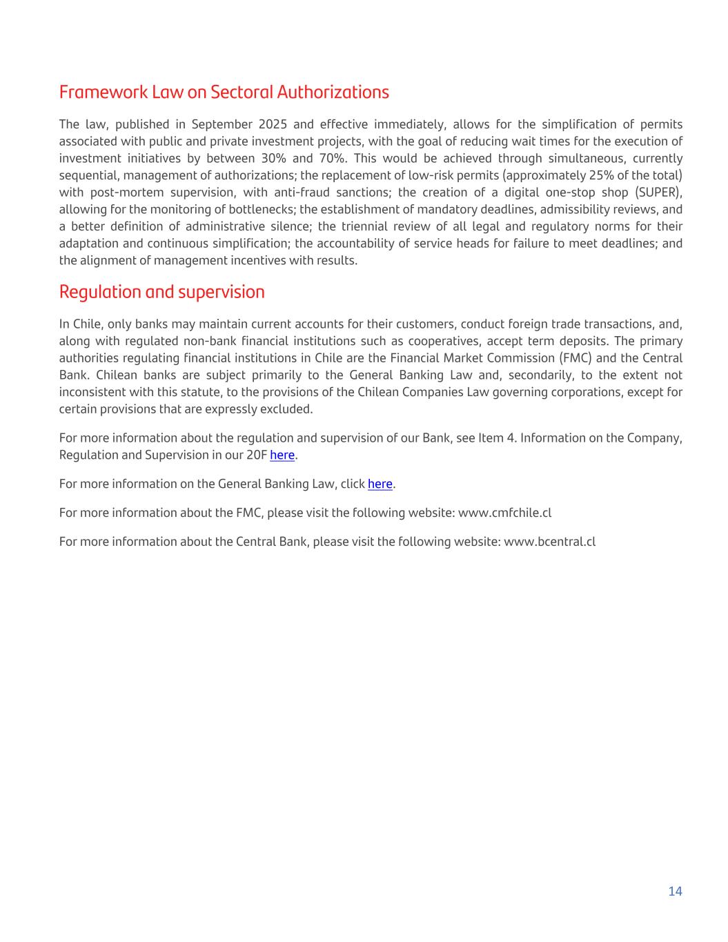 Framework Law on Sectoral Authorizations The law, published in September 2025 and effective immediately, allows for the simplification of permits associated with public and private investment projects, with the goal of reducing wait times for the execution of investment initiatives by between 30% and 70%. This would be achieved through simultaneous, currently sequential, management of authorizations; the replacement of low-risk permits (approximately 25% of the total) with post-mortem supervision, with anti-fraud sanctions; the creation of a digital one-stop shop (SUPER), allowing for the monitoring of bottlenecks; the establishment of mandatory deadlines, admissibility reviews, and a better definition of administrative silence; the triennial review of all legal and regulatory norms for their adaptation and continuous simplification; the accountability of service heads for failure to meet deadlines; and the alignment of management incentives with results. Regulation and supervision In Chile, only banks may maintain current accounts for their customers, conduct foreign trade transactions, and, along with regulated non-bank financial institutions such as cooperatives, accept term deposits. The primary authorities regulating financial institutions in Chile are the Financial Market Commission (FMC) and the Central Bank. Chilean banks are subject primarily to the General Banking Law and, secondarily, to the extent not inconsistent with this statute, to the provisions of the Chilean Companies Law governing corporations, except for certain provisions that are expressly excluded. For more information about the regulation and supervision of our Bank, see Item 4. Information on the Company, Regulation and Supervision in our 20F here. For more information on the General Banking Law, click here. For more information about the FMC, please visit the following website: www.cmfchile.cl For more information about the Central Bank, please visit the following website: www.bcentral.cl 14