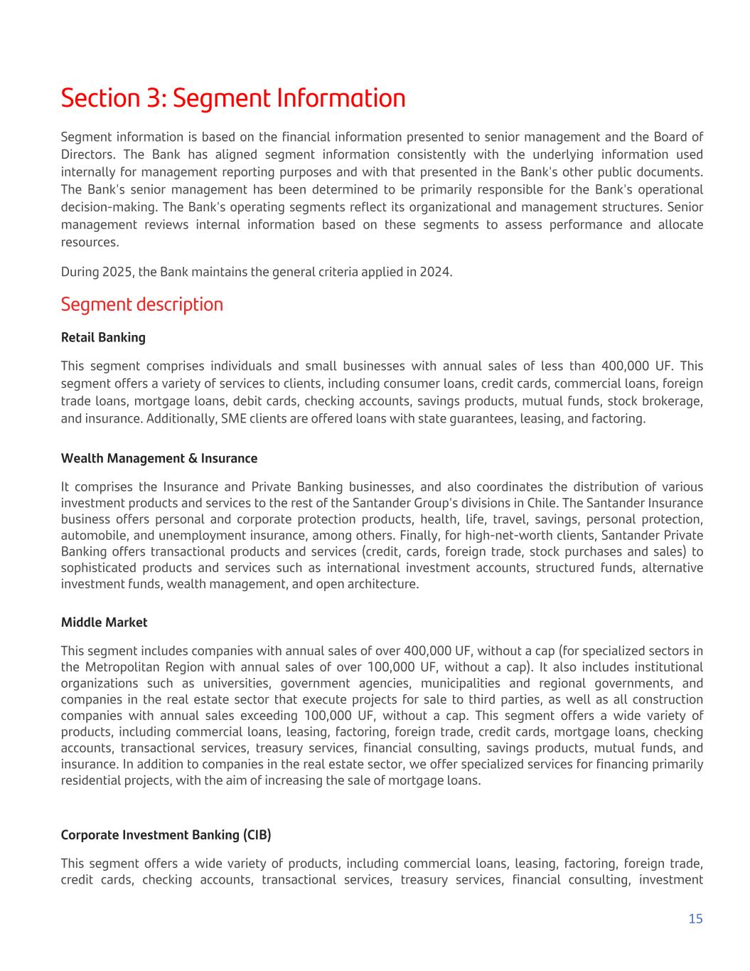 Section 3: Segment Information Segment information is based on the financial information presented to senior management and the Board of Directors. The Bank has aligned segment information consistently with the underlying information used internally for management reporting purposes and with that presented in the Bank's other public documents. The Bank's senior management has been determined to be primarily responsible for the Bank's operational decision-making. The Bank's operating segments reflect its organizational and management structures. Senior management reviews internal information based on these segments to assess performance and allocate resources. During 2025, the Bank maintains the general criteria applied in 2024. Segment description Retail Banking This segment comprises individuals and small businesses with annual sales of less than 400,000 UF. This segment offers a variety of services to clients, including consumer loans, credit cards, commercial loans, foreign trade loans, mortgage loans, debit cards, checking accounts, savings products, mutual funds, stock brokerage, and insurance. Additionally, SME clients are offered loans with state guarantees, leasing, and factoring. Wealth Management & Insurance It comprises the Insurance and Private Banking businesses, and also coordinates the distribution of various investment products and services to the rest of the Santander Group's divisions in Chile. The Santander Insurance business offers personal and corporate protection products, health, life, travel, savings, personal protection, automobile, and unemployment insurance, among others. Finally, for high-net-worth clients, Santander Private Banking offers transactional products and services (credit, cards, foreign trade, stock purchases and sales) to sophisticated products and services such as international investment accounts, structured funds, alternative investment funds, wealth management, and open architecture. Middle Market This segment includes companies with annual sales of over 400,000 UF, without a cap (for specialized sectors in the Metropolitan Region with annual sales of over 100,000 UF, without a cap). It also includes institutional organizations such as universities, government agencies, municipalities and regional governments, and companies in the real estate sector that execute projects for sale to third parties, as well as all construction companies with annual sales exceeding 100,000 UF, without a cap. This segment offers a wide variety of products, including commercial loans, leasing, factoring, foreign trade, credit cards, mortgage loans, checking accounts, transactional services, treasury services, financial consulting, savings products, mutual funds, and insurance. In addition to companies in the real estate sector, we offer specialized services for financing primarily residential projects, with the aim of increasing the sale of mortgage loans. Corporate Investment Banking (CIB) This segment offers a wide variety of products, including commercial loans, leasing, factoring, foreign trade, credit cards, checking accounts, transactional services, treasury services, financial consulting, investment 15