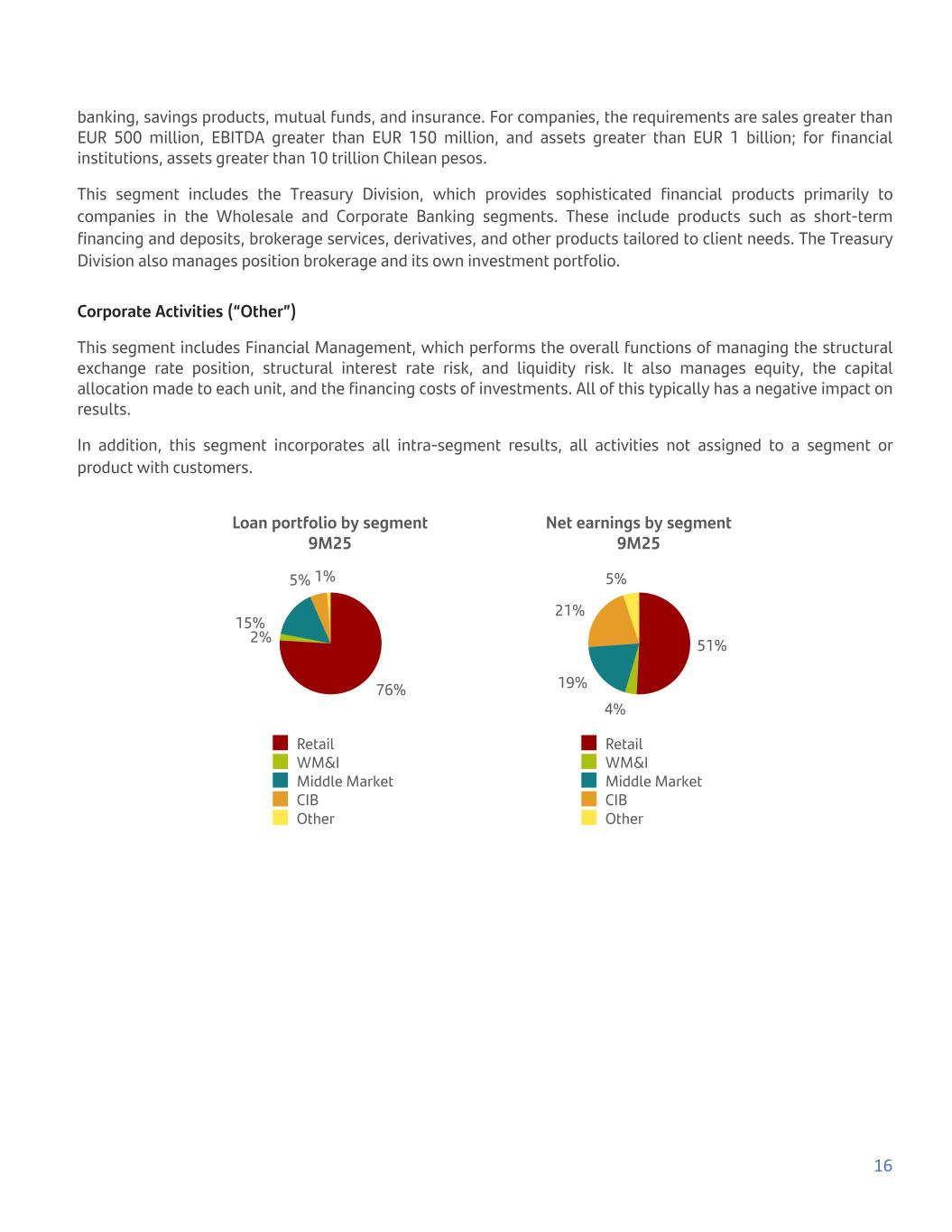 banking, savings products, mutual funds, and insurance. For companies, the requirements are sales greater than EUR 500 million, EBITDA greater than EUR 150 million, and assets greater than EUR 1 billion; for financial institutions, assets greater than 10 trillion Chilean pesos. This segment includes the Treasury Division, which provides sophisticated financial products primarily to companies in the Wholesale and Corporate Banking segments. These include products such as short-term financing and deposits, brokerage services, derivatives, and other products tailored to client needs. The Treasury Division also manages position brokerage and its own investment portfolio. Corporate Activities (“Other”) This segment includes Financial Management, which performs the overall functions of managing the structural exchange rate position, structural interest rate risk, and liquidity risk. It also manages equity, the capital allocation made to each unit, and the financing costs of investments. All of this typically has a negative impact on results. In addition, this segment incorporates all intra-segment results, all activities not assigned to a segment or product with customers. Loan portfolio by segment 9M25 76% 2% 15% 5% 1% Retail WM&I Middle Market CIB Other Net earnings by segment 9M25 51% 4% 19% 21% 5% Retail WM&I Middle Market CIB Other 16