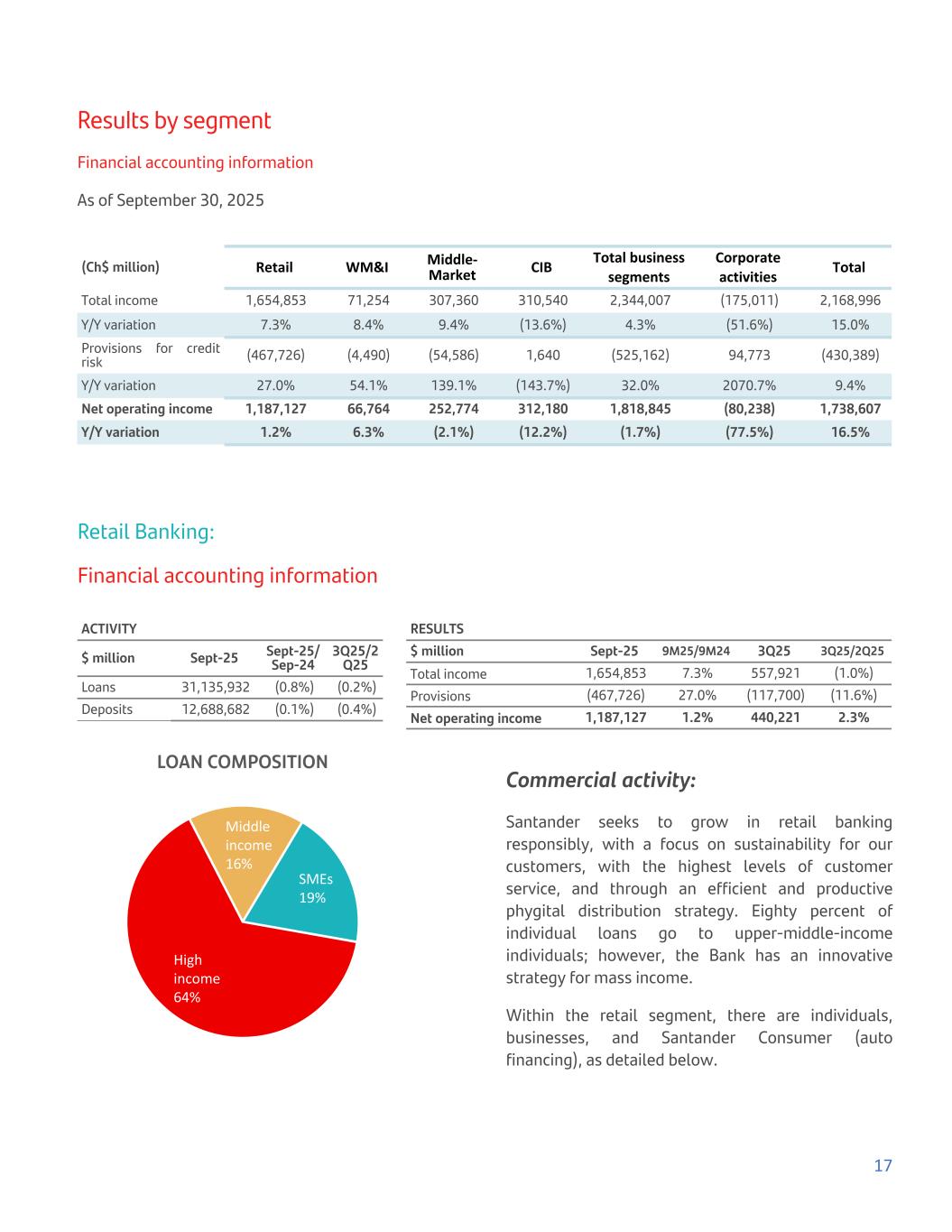 Results by segment Financial accounting information As of September 30, 2025 (Ch$ million) Retail WM&I Middle- Market CIB Total business segments Corporate activities Total Total income 1,654,853 71,254 307,360 310,540 2,344,007 (175,011) 2,168,996 Y/Y variation 7.3% 8.4% 9.4% (13.6%) 4.3% (51.6%) 15.0% Provisions for credit risk (467,726) (4,490) (54,586) 1,640 (525,162) 94,773 (430,389) Y/Y variation 27.0% 54.1% 139.1% (143.7%) 32.0% 2070.7% 9.4% Net operating income 1,187,127 66,764 252,774 312,180 1,818,845 (80,238) 1,738,607 Y/Y variation 1.2% 6.3% (2.1%) (12.2%) (1.7%) (77.5%) 16.5% Retail Banking: Financial accounting information ACTIVITY $ million Sept-25 Sept-25/ Sep-24 3Q25/2 Q25 Loans 31,135,932 (0.8%) (0.2%) Deposits 12,688,682 (0.1%) (0.4%) RESULTS $ million Sept-25 9M25/9M24 3Q25 3Q25/2Q25 Total income 1,654,853 7.3% 557,921 (1.0%) Provisions (467,726) 27.0% (117,700) (11.6%) Net operating income 1,187,127 1.2% 440,221 2.3% LOAN COMPOSITION High income 64% Middle income 16% SMEs 19% Commercial activity: Santander seeks to grow in retail banking responsibly, with a focus on sustainability for our customers, with the highest levels of customer service, and through an efficient and productive phygital distribution strategy. Eighty percent of individual loans go to upper-middle-income individuals; however, the Bank has an innovative strategy for mass income. Within the retail segment, there are individuals, businesses, and Santander Consumer (auto financing), as detailed below. 17