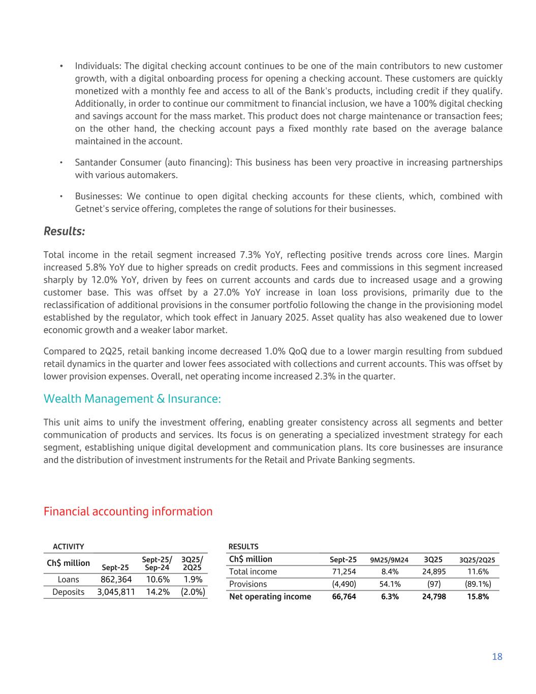 • Individuals: The digital checking account continues to be one of the main contributors to new customer growth, with a digital onboarding process for opening a checking account. These customers are quickly monetized with a monthly fee and access to all of the Bank's products, including credit if they qualify. Additionally, in order to continue our commitment to financial inclusion, we have a 100% digital checking and savings account for the mass market. This product does not charge maintenance or transaction fees; on the other hand, the checking account pays a fixed monthly rate based on the average balance maintained in the account. • Santander Consumer (auto financing): This business has been very proactive in increasing partnerships with various automakers. • Businesses: We continue to open digital checking accounts for these clients, which, combined with Getnet's service offering, completes the range of solutions for their businesses. Results: Total income in the retail segment increased 7.3% YoY, reflecting positive trends across core lines. Margin increased 5.8% YoY due to higher spreads on credit products. Fees and commissions in this segment increased sharply by 12.0% YoY, driven by fees on current accounts and cards due to increased usage and a growing customer base. This was offset by a 27.0% YoY increase in loan loss provisions, primarily due to the reclassification of additional provisions in the consumer portfolio following the change in the provisioning model established by the regulator, which took effect in January 2025. Asset quality has also weakened due to lower economic growth and a weaker labor market. Compared to 2Q25, retail banking income decreased 1.0% QoQ due to a lower margin resulting from subdued retail dynamics in the quarter and lower fees associated with collections and current accounts. This was offset by lower provision expenses. Overall, net operating income increased 2.3% in the quarter. Wealth Management & Insurance: This unit aims to unify the investment offering, enabling greater consistency across all segments and better communication of products and services. Its focus is on generating a specialized investment strategy for each segment, establishing unique digital development and communication plans. Its core businesses are insurance and the distribution of investment instruments for the Retail and Private Banking segments. Financial accounting information ACTIVITY Ch$ million Sept-25 Sept-25/ Sep-24 3Q25/ 2Q25 Loans 862,364 10.6% 1.9% Deposits 3,045,811 14.2% (2.0%) RESULTS Ch$ million Sept-25 9M25/9M24 3Q25 3Q25/2Q25 Total income 71,254 8.4% 24,895 11.6% Provisions (4,490) 54.1% (97) (89.1%) Net operating income 66,764 6.3% 24,798 15.8% 18