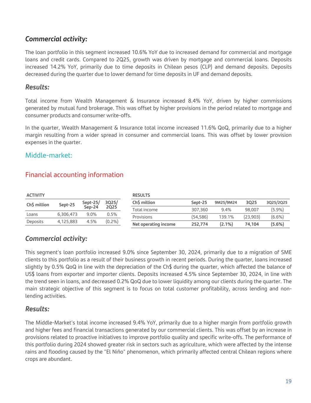 Commercial activity: The loan portfolio in this segment increased 10.6% YoY due to increased demand for commercial and mortgage loans and credit cards. Compared to 2Q25, growth was driven by mortgage and commercial loans. Deposits increased 14.2% YoY, primarily due to time deposits in Chilean pesos (CLP) and demand deposits. Deposits decreased during the quarter due to lower demand for time deposits in UF and demand deposits. Results: Total income from Wealth Management & Insurance increased 8.4% YoY, driven by higher commissions generated by mutual fund brokerage. This was offset by higher provisions in the period related to mortgage and consumer products and consumer write-offs. In the quarter, Wealth Management & Insurance total income increased 11.6% QoQ, primarily due to a higher margin resulting from a wider spread in consumer and commercial loans. This was offset by lower provision expenses in the quarter. Middle-market: Financial accounting information ACTIVITY Ch$ million Sept-25 Sept-25/ Sep-24 3Q25/ 2Q25 Loans 6,306,473 9.0% 0.5% Deposits 4,125,883 4.5% (0.2%) RESULTS Ch$ million Sept-25 9M25/9M24 3Q25 3Q25/2Q25 Total income 307,360 9.4% 98,007 (5.9%) Provisions (54,586) 139.1% (23,903) (6.6%) Net operating income 252,774 (2.1%) 74,104 (5.6%) Commercial activity: This segment's loan portfolio increased 9.0% since September 30, 2024, primarily due to a migration of SME clients to this portfolio as a result of their business growth in recent periods. During the quarter, loans increased slightly by 0.5% QoQ in line with the depreciation of the Ch$ during the quarter, which affected the balance of US$ loans from exporter and importer clients. Deposits increased 4.5% since September 30, 2024, in line with the trend seen in loans, and decreased 0.2% QoQ due to lower liquidity among our clients during the quarter. The main strategic objective of this segment is to focus on total customer profitability, across lending and non- lending activities. Results: The Middle-Market's total income increased 9.4% YoY, primarily due to a higher margin from portfolio growth and higher fees and financial transactions generated by our commercial clients. This was offset by an increase in provisions related to proactive initiatives to improve portfolio quality and specific write-offs. The performance of this portfolio during 2024 showed greater risk in sectors such as agriculture, which were affected by the intense rains and flooding caused by the "El Niño" phenomenon, which primarily affected central Chilean regions where crops are abundant. 19