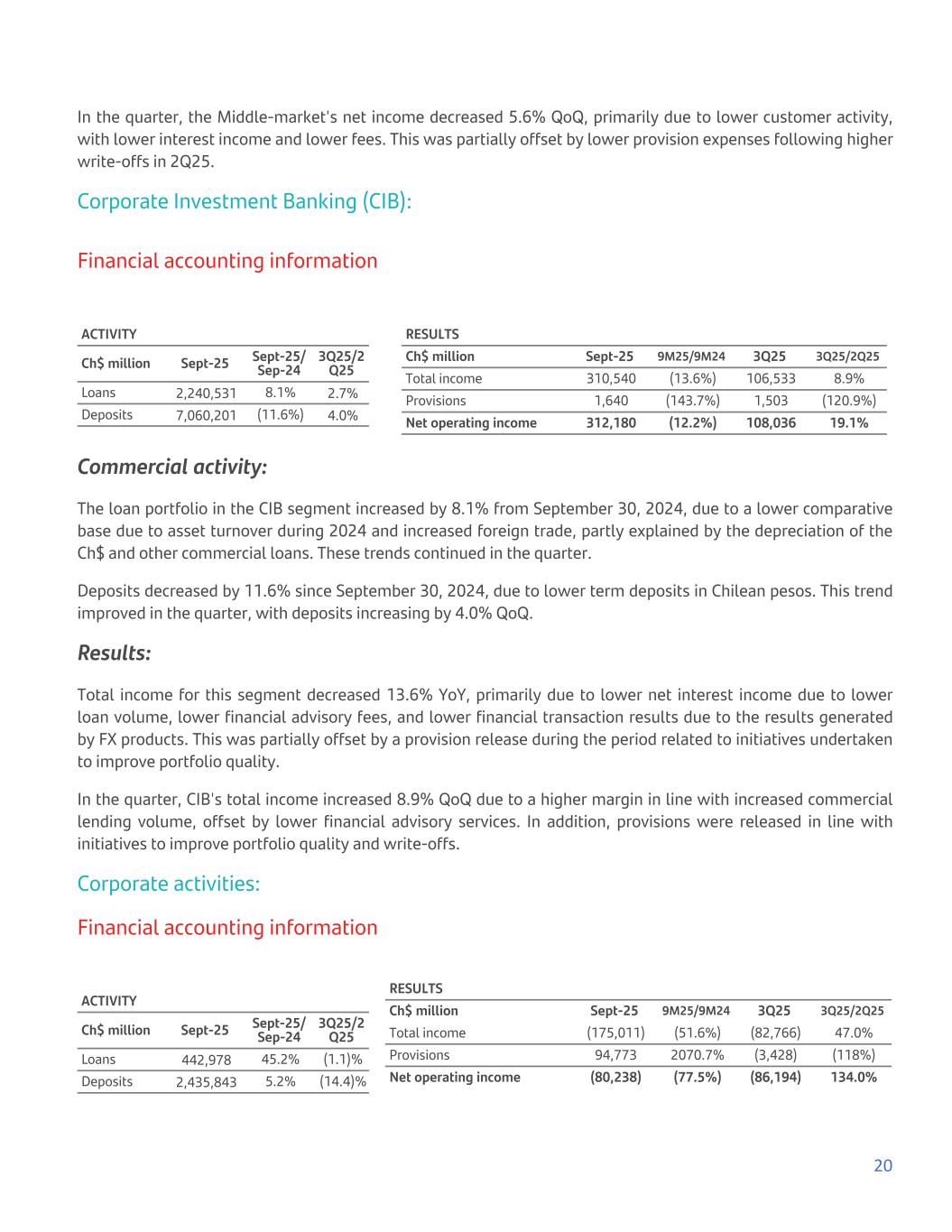 In the quarter, the Middle-market's net income decreased 5.6% QoQ, primarily due to lower customer activity, with lower interest income and lower fees. This was partially offset by lower provision expenses following higher write-offs in 2Q25. Corporate Investment Banking (CIB): Financial accounting information ACTIVITY Ch$ million Sept-25 Sept-25/ Sep-24 3Q25/2 Q25 Loans 2,240,531 8.1% 2.7% Deposits 7,060,201 (11.6%) 4.0% RESULTS Ch$ million Sept-25 9M25/9M24 3Q25 3Q25/2Q25 Total income 310,540 (13.6%) 106,533 8.9% Provisions 1,640 (143.7%) 1,503 (120.9%) Net operating income 312,180 (12.2%) 108,036 19.1% Commercial activity: The loan portfolio in the CIB segment increased by 8.1% from September 30, 2024, due to a lower comparative base due to asset turnover during 2024 and increased foreign trade, partly explained by the depreciation of the Ch$ and other commercial loans. These trends continued in the quarter. Deposits decreased by 11.6% since September 30, 2024, due to lower term deposits in Chilean pesos. This trend improved in the quarter, with deposits increasing by 4.0% QoQ. Results: Total income for this segment decreased 13.6% YoY, primarily due to lower net interest income due to lower loan volume, lower financial advisory fees, and lower financial transaction results due to the results generated by FX products. This was partially offset by a provision release during the period related to initiatives undertaken to improve portfolio quality. In the quarter, CIB's total income increased 8.9% QoQ due to a higher margin in line with increased commercial lending volume, offset by lower financial advisory services. In addition, provisions were released in line with initiatives to improve portfolio quality and write-offs. Corporate activities: Financial accounting information ACTIVITY Ch$ million Sept-25 Sept-25/ Sep-24 3Q25/2 Q25 Loans 442,978 45.2% (1.1)% Deposits 2,435,843 5.2% (14.4)% RESULTS Ch$ million Sept-25 9M25/9M24 3Q25 3Q25/2Q25 Total income (175,011) (51.6%) (82,766) 47.0% Provisions 94,773 2070.7% (3,428) (118%) Net operating income (80,238) (77.5%) (86,194) 134.0% 20