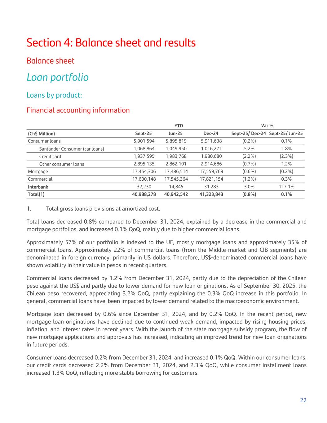 Section 4: Balance sheet and results Balance sheet Loan portfolio Loans by product: Financial accounting information YTD Var % (Ch$ Million) Sept-25 Jun-25 Dec-24 Sept-25/ Dec-24 Sept-25/ Jun-25 Consumer loans 5,901,594 5,895,819 5,911,638 (0.2%) 0.1% Santander Consumer (car loans) 1,068,864 1,049,950 1,016,271 5.2% 1.8% Credit card 1,937,595 1,983,768 1,980,680 (2.2%) (2.3%) Other consumer loans 2,895,135 2,862,101 2,914,686 (0.7%) 1.2% Mortgage 17,454,306 17,486,514 17,559,769 (0.6%) (0.2%) Commercial 17,600,148 17,545,364 17,821,154 (1.2%) 0.3% Interbank 32,230 14,845 31,283 3.0% 117.1% Total(1) 40,988,278 40,942,542 41,323,843 (0.8%) 0.1% 1. Total gross loans provisions at amortized cost. Total loans decreased 0.8% compared to December 31, 2024, explained by a decrease in the commercial and mortgage portfolios, and increased 0.1% QoQ, mainly due to higher commercial loans. Approximately 57% of our portfolio is indexed to the UF, mostly mortgage loans and approximately 35% of commercial loans. Approximately 22% of commercial loans (from the Middle-market and CIB segments) are denominated in foreign currency, primarily in US dollars. Therefore, US$-denominated commercial loans have shown volatility in their value in pesos in recent quarters. Commercial loans decreased by 1.2% from December 31, 2024, partly due to the depreciation of the Chilean peso against the US$ and partly due to lower demand for new loan originations. As of September 30, 2025, the Chilean peso recovered, appreciating 3.2% QoQ, partly explaining the 0.3% QoQ increase in this portfolio. In general, commercial loans have been impacted by lower demand related to the macroeconomic environment. Mortgage loan decreased by 0.6% since December 31, 2024, and by 0.2% QoQ. In the recent period, new mortgage loan originations have declined due to continued weak demand, impacted by rising housing prices, inflation, and interest rates in recent years. With the launch of the state mortgage subsidy program, the flow of new mortgage applications and approvals has increased, indicating an improved trend for new loan originations in future periods. Consumer loans decreased 0.2% from December 31, 2024, and increased 0.1% QoQ. Within our consumer loans, our credit cards decreased 2.2% from December 31, 2024, and 2.3% QoQ, while consumer installment loans increased 1.3% QoQ, reflecting more stable borrowing for customers. 22