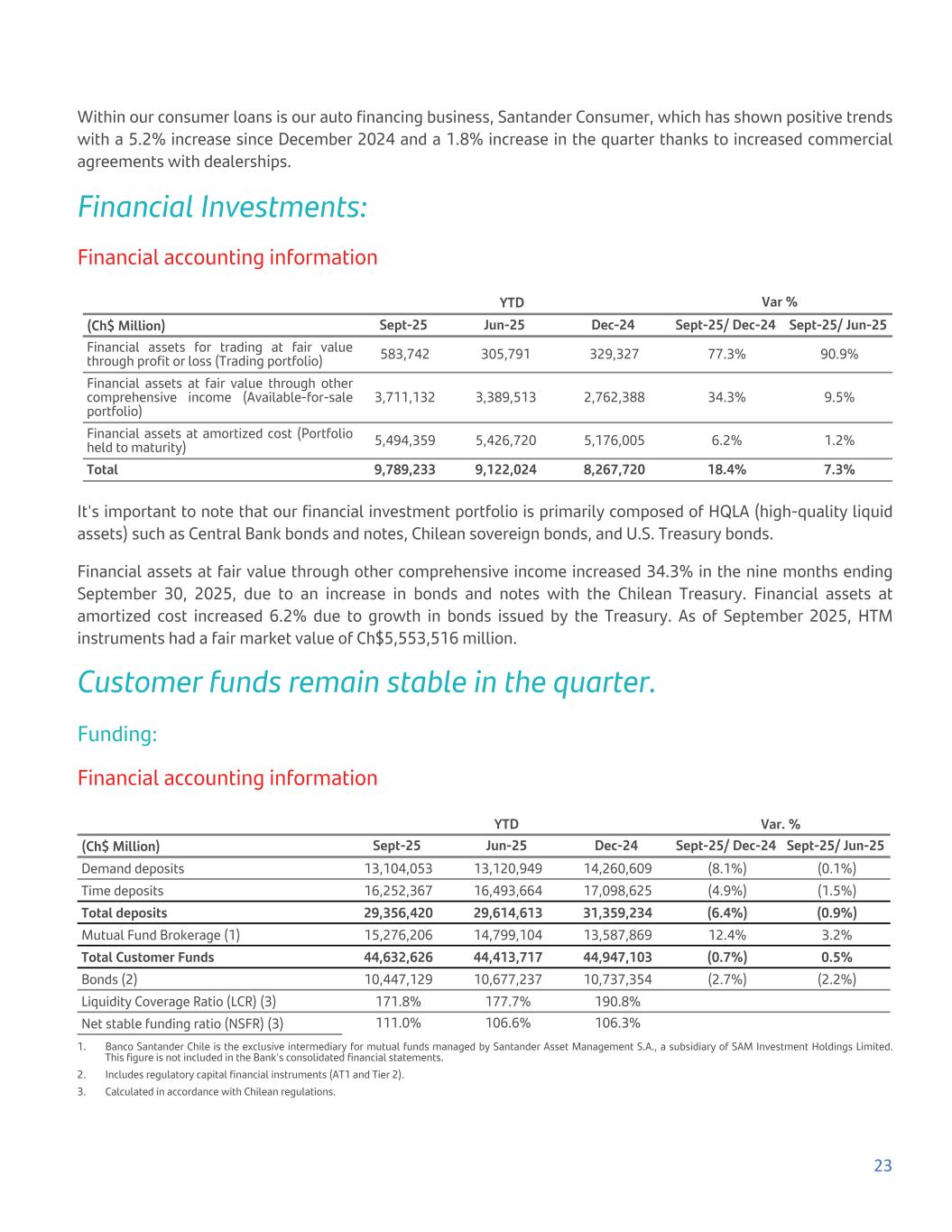 Within our consumer loans is our auto financing business, Santander Consumer, which has shown positive trends with a 5.2% increase since December 2024 and a 1.8% increase in the quarter thanks to increased commercial agreements with dealerships. Financial Investments: Financial accounting information YTD Var % (Ch$ Million) Sept-25 Jun-25 Dec-24 Sept-25/ Dec-24 Sept-25/ Jun-25 Financial assets for trading at fair value through profit or loss (Trading portfolio) 583,742 305,791 329,327 77.3% 90.9% Financial assets at fair value through other comprehensive income (Available-for-sale portfolio) 3,711,132 3,389,513 2,762,388 34.3% 9.5% Financial assets at amortized cost (Portfolio held to maturity) 5,494,359 5,426,720 5,176,005 6.2% 1.2% Total 9,789,233 9,122,024 8,267,720 18.4% 7.3% It's important to note that our financial investment portfolio is primarily composed of HQLA (high-quality liquid assets) such as Central Bank bonds and notes, Chilean sovereign bonds, and U.S. Treasury bonds. Financial assets at fair value through other comprehensive income increased 34.3% in the nine months ending September 30, 2025, due to an increase in bonds and notes with the Chilean Treasury. Financial assets at amortized cost increased 6.2% due to growth in bonds issued by the Treasury. As of September 2025, HTM instruments had a fair market value of Ch$5,553,516 million. Customer funds remain stable in the quarter. Funding: Financial accounting information YTD Var. % (Ch$ Million) Sept-25 Jun-25 Dec-24 Sept-25/ Dec-24 Sept-25/ Jun-25 Demand deposits 13,104,053 13,120,949 14,260,609 (8.1%) (0.1%) Time deposits 16,252,367 16,493,664 17,098,625 (4.9%) (1.5%) Total deposits 29,356,420 29,614,613 31,359,234 (6.4%) (0.9%) Mutual Fund Brokerage (1) 15,276,206 14,799,104 13,587,869 12.4% 3.2% Total Customer Funds 44,632,626 44,413,717 44,947,103 (0.7%) 0.5% Bonds (2) 10,447,129 10,677,237 10,737,354 (2.7%) (2.2%) Liquidity Coverage Ratio (LCR) (3) 171.8% 177.7% 190.8% Net stable funding ratio (NSFR) (3) 111.0% 106.6% 106.3% 1. Banco Santander Chile is the exclusive intermediary for mutual funds managed by Santander Asset Management S.A., a subsidiary of SAM Investment Holdings Limited. This figure is not included in the Bank's consolidated financial statements. 2. Includes regulatory capital financial instruments (AT1 and Tier 2). 3. Calculated in accordance with Chilean regulations. 23