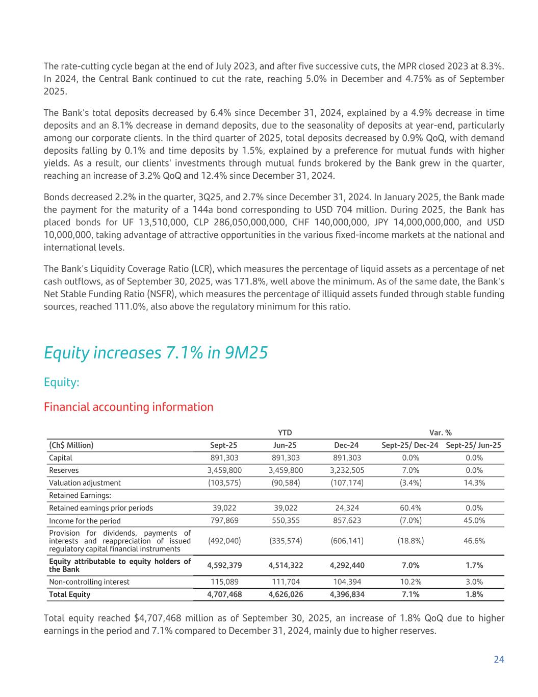 The rate-cutting cycle began at the end of July 2023, and after five successive cuts, the MPR closed 2023 at 8.3%. In 2024, the Central Bank continued to cut the rate, reaching 5.0% in December and 4.75% as of September 2025. The Bank's total deposits decreased by 6.4% since December 31, 2024, explained by a 4.9% decrease in time deposits and an 8.1% decrease in demand deposits, due to the seasonality of deposits at year-end, particularly among our corporate clients. In the third quarter of 2025, total deposits decreased by 0.9% QoQ, with demand deposits falling by 0.1% and time deposits by 1.5%, explained by a preference for mutual funds with higher yields. As a result, our clients' investments through mutual funds brokered by the Bank grew in the quarter, reaching an increase of 3.2% QoQ and 12.4% since December 31, 2024. Bonds decreased 2.2% in the quarter, 3Q25, and 2.7% since December 31, 2024. In January 2025, the Bank made the payment for the maturity of a 144a bond corresponding to USD 704 million. During 2025, the Bank has placed bonds for UF 13,510,000, CLP 286,050,000,000, CHF 140,000,000, JPY 14,000,000,000, and USD 10,000,000, taking advantage of attractive opportunities in the various fixed-income markets at the national and international levels. The Bank's Liquidity Coverage Ratio (LCR), which measures the percentage of liquid assets as a percentage of net cash outflows, as of September 30, 2025, was 171.8%, well above the minimum. As of the same date, the Bank's Net Stable Funding Ratio (NSFR), which measures the percentage of illiquid assets funded through stable funding sources, reached 111.0%, also above the regulatory minimum for this ratio. Equity increases 7.1% in 9M25 Equity: Financial accounting information YTD Var. % (Ch$ Million) Sept-25 Jun-25 Dec-24 Sept-25/ Dec-24 Sept-25/ Jun-25 Capital 891,303 891,303 891,303 0.0% 0.0% Reserves 3,459,800 3,459,800 3,232,505 7.0% 0.0% Valuation adjustment (103,575) (90,584) (107,174) (3.4%) 14.3% Retained Earnings: Retained earnings prior periods 39,022 39,022 24,324 60.4% 0.0% Income for the period 797,869 550,355 857,623 (7.0%) 45.0% Provision for dividends, payments of interests and reappreciation of issued regulatory capital financial instruments (492,040) (335,574) (606,141) (18.8%) 46.6% Equity attributable to equity holders of the Bank 4,592,379 4,514,322 4,292,440 7.0% 1.7% Non-controlling interest 115,089 111,704 104,394 10.2% 3.0% Total Equity 4,707,468 4,626,026 4,396,834 7.1% 1.8% Total equity reached $4,707,468 million as of September 30, 2025, an increase of 1.8% QoQ due to higher earnings in the period and 7.1% compared to December 31, 2024, mainly due to higher reserves. 24