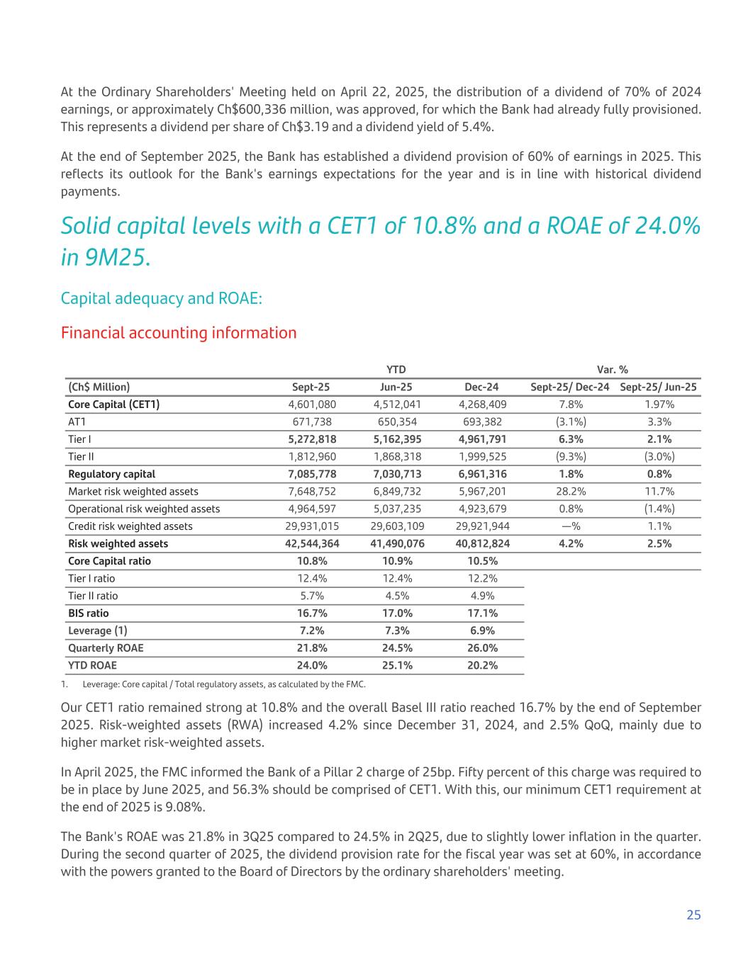 At the Ordinary Shareholders' Meeting held on April 22, 2025, the distribution of a dividend of 70% of 2024 earnings, or approximately Ch$600,336 million, was approved, for which the Bank had already fully provisioned. This represents a dividend per share of Ch$3.19 and a dividend yield of 5.4%. At the end of September 2025, the Bank has established a dividend provision of 60% of earnings in 2025. This reflects its outlook for the Bank's earnings expectations for the year and is in line with historical dividend payments. Solid capital levels with a CET1 of 10.8% and a ROAE of 24.0% in 9M25. Capital adequacy and ROAE: Financial accounting information YTD Var. % (Ch$ Million) Sept-25 Jun-25 Dec-24 Sept-25/ Dec-24 Sept-25/ Jun-25 Core Capital (CET1) 4,601,080 4,512,041 4,268,409 7.8% 1.97% AT1 671,738 650,354 693,382 (3.1%) 3.3% Tier I 5,272,818 5,162,395 4,961,791 6.3% 2.1% Tier II 1,812,960 1,868,318 1,999,525 (9.3%) (3.0%) Regulatory capital 7,085,778 7,030,713 6,961,316 1.8% 0.8% Market risk weighted assets 7,648,752 6,849,732 5,967,201 28.2% 11.7% Operational risk weighted assets 4,964,597 5,037,235 4,923,679 0.8% (1.4%) Credit risk weighted assets 29,931,015 29,603,109 29,921,944 —% 1.1% Risk weighted assets 42,544,364 41,490,076 40,812,824 4.2% 2.5% Core Capital ratio 10.8% 10.9% 10.5% Tier I ratio 12.4% 12.4% 12.2% Tier II ratio 5.7% 4.5% 4.9% BIS ratio 16.7% 17.0% 17.1% Leverage (1) 7.2% 7.3% 6.9% Quarterly ROAE 21.8% 24.5% 26.0% YTD ROAE 24.0% 25.1% 20.2% 1. Leverage: Core capital / Total regulatory assets, as calculated by the FMC. Our CET1 ratio remained strong at 10.8% and the overall Basel III ratio reached 16.7% by the end of September 2025. Risk-weighted assets (RWA) increased 4.2% since December 31, 2024, and 2.5% QoQ, mainly due to higher market risk-weighted assets. In April 2025, the FMC informed the Bank of a Pillar 2 charge of 25bp. Fifty percent of this charge was required to be in place by June 2025, and 56.3% should be comprised of CET1. With this, our minimum CET1 requirement at the end of 2025 is 9.08%. The Bank's ROAE was 21.8% in 3Q25 compared to 24.5% in 2Q25, due to slightly lower inflation in the quarter. During the second quarter of 2025, the dividend provision rate for the fiscal year was set at 60%, in accordance with the powers granted to the Board of Directors by the ordinary shareholders' meeting. 25