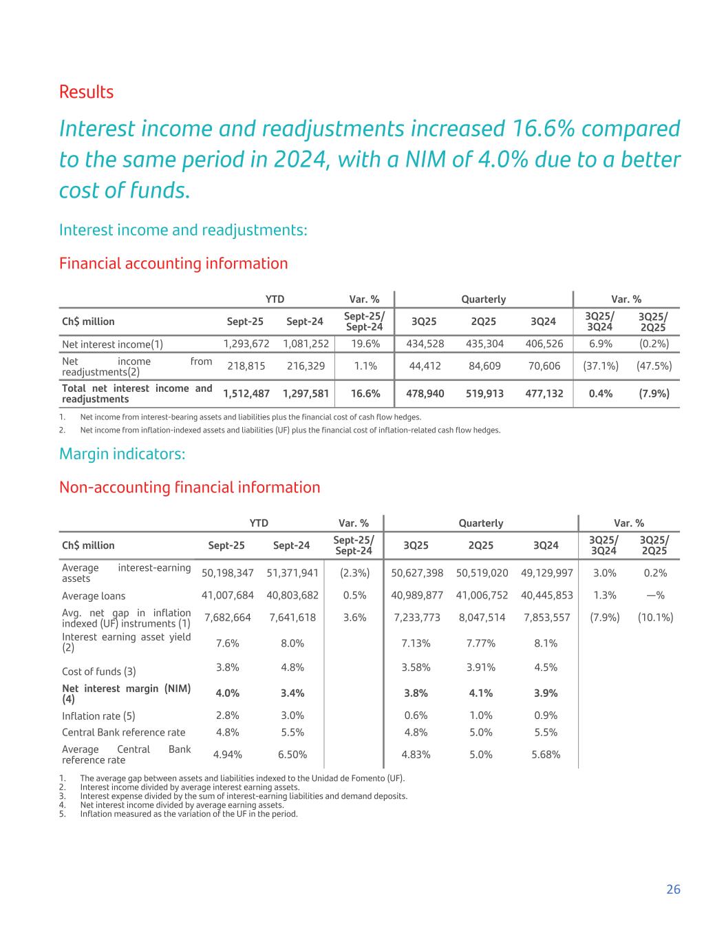 Results Interest income and readjustments increased 16.6% compared to the same period in 2024, with a NIM of 4.0% due to a better cost of funds. Interest income and readjustments: Financial accounting information YTD Var. % Quarterly Var. % Ch$ million Sept-25 Sept-24 Sept-25/ Sept-24 3Q25 2Q25 3Q24 3Q25/ 3Q24 3Q25/ 2Q25 Net interest income(1) 1,293,672 1,081,252 19.6% 434,528 435,304 406,526 6.9% (0.2%) Net income from readjustments(2) 218,815 216,329 1.1% 44,412 84,609 70,606 (37.1%) (47.5%) Total net interest income and readjustments 1,512,487 1,297,581 16.6% 478,940 519,913 477,132 0.4% (7.9%) 1. Net income from interest-bearing assets and liabilities plus the financial cost of cash flow hedges. 2. Net income from inflation-indexed assets and liabilities (UF) plus the financial cost of inflation-related cash flow hedges. Margin indicators: Non-accounting financial information YTD Var. % Quarterly Var. % Ch$ million Sept-25 Sept-24 Sept-25/ Sept-24 3Q25 2Q25 3Q24 3Q25/ 3Q24 3Q25/ 2Q25 Average interest-earning assets 50,198,347 51,371,941 (2.3%) 50,627,398 50,519,020 49,129,997 3.0% 0.2% Average loans 41,007,684 40,803,682 0.5% 40,989,877 41,006,752 40,445,853 1.3% —% Avg. net gap in inflation indexed (UF) instruments (1) 7,682,664 7,641,618 3.6% 7,233,773 8,047,514 7,853,557 (7.9%) (10.1%) Interest earning asset yield (2) 7.6% 8.0% 7.13% 7.77% 8.1% Cost of funds (3) 3.8% 4.8% 3.58% 3.91% 4.5% Net interest margin (NIM) (4) 4.0% 3.4% 3.8% 4.1% 3.9% Inflation rate (5) 2.8% 3.0% 0.6% 1.0% 0.9% Central Bank reference rate 4.8% 5.5% 4.8% 5.0% 5.5% Average Central Bank reference rate 4.94% 6.50% 4.83% 5.0% 5.68% 1. The average gap between assets and liabilities indexed to the Unidad de Fomento (UF). 2. Interest income divided by average interest earning assets. 3. Interest expense divided by the sum of interest-earning liabilities and demand deposits. 4. Net interest income divided by average earning assets. 5. Inflation measured as the variation of the UF in the period. 26