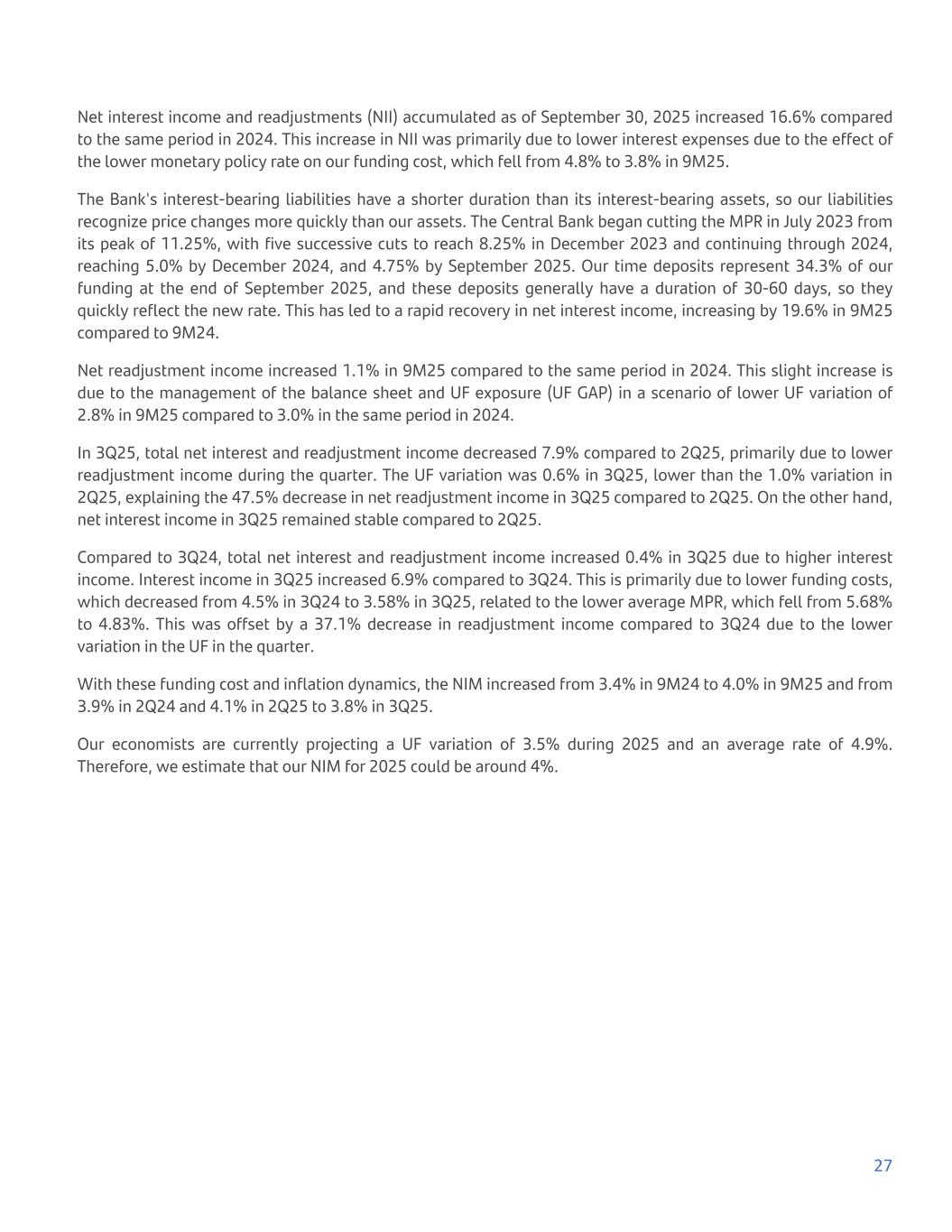 Net interest income and readjustments (NII) accumulated as of September 30, 2025 increased 16.6% compared to the same period in 2024. This increase in NII was primarily due to lower interest expenses due to the effect of the lower monetary policy rate on our funding cost, which fell from 4.8% to 3.8% in 9M25. The Bank's interest-bearing liabilities have a shorter duration than its interest-bearing assets, so our liabilities recognize price changes more quickly than our assets. The Central Bank began cutting the MPR in July 2023 from its peak of 11.25%, with five successive cuts to reach 8.25% in December 2023 and continuing through 2024, reaching 5.0% by December 2024, and 4.75% by September 2025. Our time deposits represent 34.3% of our funding at the end of September 2025, and these deposits generally have a duration of 30-60 days, so they quickly reflect the new rate. This has led to a rapid recovery in net interest income, increasing by 19.6% in 9M25 compared to 9M24. Net readjustment income increased 1.1% in 9M25 compared to the same period in 2024. This slight increase is due to the management of the balance sheet and UF exposure (UF GAP) in a scenario of lower UF variation of 2.8% in 9M25 compared to 3.0% in the same period in 2024. In 3Q25, total net interest and readjustment income decreased 7.9% compared to 2Q25, primarily due to lower readjustment income during the quarter. The UF variation was 0.6% in 3Q25, lower than the 1.0% variation in 2Q25, explaining the 47.5% decrease in net readjustment income in 3Q25 compared to 2Q25. On the other hand, net interest income in 3Q25 remained stable compared to 2Q25. Compared to 3Q24, total net interest and readjustment income increased 0.4% in 3Q25 due to higher interest income. Interest income in 3Q25 increased 6.9% compared to 3Q24. This is primarily due to lower funding costs, which decreased from 4.5% in 3Q24 to 3.58% in 3Q25, related to the lower average MPR, which fell from 5.68% to 4.83%. This was offset by a 37.1% decrease in readjustment income compared to 3Q24 due to the lower variation in the UF in the quarter. With these funding cost and inflation dynamics, the NIM increased from 3.4% in 9M24 to 4.0% in 9M25 and from 3.9% in 2Q24 and 4.1% in 2Q25 to 3.8% in 3Q25. Our economists are currently projecting a UF variation of 3.5% during 2025 and an average rate of 4.9%. Therefore, we estimate that our NIM for 2025 could be around 4%. 27
