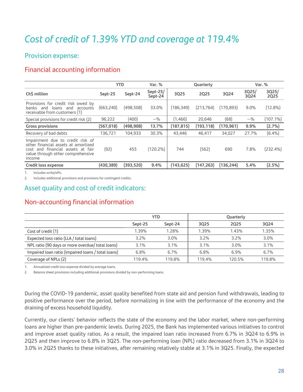 Cost of credit of 1.39% YTD and coverage at 119.4% Provision expense: Financial accounting information YTD Var. % Quarterly Var. % Ch$ million Sept-25 Sept-24 Sept-25/ Sept-24 3Q25 2Q25 3Q24 3Q25/ 3Q24 3Q25/ 2Q25 Provisions for credit risk owed by banks and loans and accounts receivable from customers (1) (663,240) (498,508) 33.0% (186,349) (213,764) (170,893) 9.0% (12.8%) Special provisions for credit risk (2) 96,222 (400) --% (1,466) 20,646 (68) --% (107.1%) Gross provisions (567,018) (498,908) 13.7% (187,815) (193,118) (170,961) 9.9% (2.7%) Recovery of bad debts 136,721 104,933 30.3% 43,446 46,417 34,027 27.7% (6.4%) Impairment due to credit risk of other financial assets at amortized cost and financial assets at fair value through other comprehensive income (92) 455 (120.2%) 744 (562) 690 7.8% (232.4%) Credit loss expense (430,389) (393,520) 9.4% (143,625) (147,263) (136,244) 5.4% (2.5%) 1. Includes write/offs. 2. Includes additional provisions and provisions for contingent credits. Asset quality and cost of credit indicators: Non-accounting financial information YTD Quarterly Sept-25 Sept-24 3Q25 2Q25 3Q24 Cost of credit (1) 1.39% 1.28% 1.39% 1.43% 1.35% Expected loss ratio (LLA / total loans) 3.2% 3.0% 3.2% 3.2% 3.0% NPL ratio (90 days or more overdue/ total loans) 3.1% 3.1% 3.1% 3.0% 3.1% Impaired loan ratio (impaired loans / total loans) 6.8% 6.7% 6.8% 6.9% 6.7% Coverage of NPLs (2) 119.4% 119.8% 119.4% 120.5% 119.8% 1. Annualized credit loss expense divided by average loans. 2. Balance sheet provisions including additional provisions divided by non-performing loans. During the COVID-19 pandemic, asset quality benefited from state aid and pension fund withdrawals, leading to positive performance over the period, before normalizing in line with the performance of the economy and the draining of excess household liquidity. Currently, our clients' behavior reflects the state of the economy and the labor market, where non-performing loans are higher than pre-pandemic levels. During 2025, the Bank has implemented various initiatives to control and improve asset quality ratios. As a result, the impaired loan ratio increased from 6.7% in 3Q24 to 6.9% in 2Q25 and then improve to 6.8% in 3Q25. The non-performing loan (NPL) ratio decreased from 3.1% in 3Q24 to 3.0% in 2Q25 thanks to these initiatives, after remaining relatively stable at 3.1% in 3Q25. Finally, the expected 28