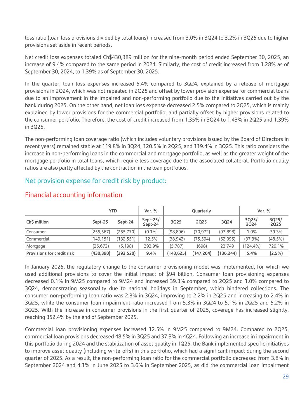 loss ratio (loan loss provisions divided by total loans) increased from 3.0% in 3Q24 to 3.2% in 3Q25 due to higher provisions set aside in recent periods. Net credit loss expenses totaled Ch$430,389 million for the nine-month period ended September 30, 2025, an increase of 9.4% compared to the same period in 2024. Similarly, the cost of credit increased from 1.28% as of September 30, 2024, to 1.39% as of September 30, 2025. In the quarter, loan loss expenses increased 5.4% compared to 3Q24, explained by a release of mortgage provisions in 2Q24, which was not repeated in 2Q25 and offset by lower provision expense for commercial loans due to an improvement in the impaired and non-performing portfolio due to the initiatives carried out by the bank during 2025. On the other hand, net loan loss expense decreased 2.5% compared to 2Q25, which is mainly explained by lower provisions for the commercial portfolio, and partially offset by higher provisions related to the consumer portfolio. Therefore, the cost of credit increased from 1.35% in 3Q24 to 1.43% in 2Q25 and 1.39% in 3Q25. The non-performing loan coverage ratio (which includes voluntary provisions issued by the Board of Directors in recent years) remained stable at 119.8% in 3Q24, 120.5% in 2Q25, and 119.4% in 3Q25. This ratio considers the increase in non-performing loans in the commercial and mortgage portfolio, as well as the greater weight of the mortgage portfolio in total loans, which require less coverage due to the associated collateral. Portfolio quality ratios are also partly affected by the contraction in the loan portfolios. Net provision expense for credit risk by product: Financial accounting information YTD Var. % Quarterly Var. % Ch$ million Sept-25 Sept-24 Sept-25/ Sept-24 3Q25 2Q25 3Q24 3Q25/ 3Q24 3Q25/ 2Q25 Consumer (255,567) (255,770) (0.1%) (98,896) (70,972) (97,898) 1.0% 39.3% Commercial (149,151) (132,551) 12.5% (38,942) (75,594) (62,095) (37.3%) (48.5%) Mortgage (25,672) (5,198) 393.9% (5,787) (698) 23,749 (124.4%) 729.1% Provisions for credit risk (430,390) (393,520) 9.4% (143,625) (147,264) (136,244) 5.4% (2.5%) In January 2025, the regulatory change to the consumer provisioning model was implemented, for which we used additional provisions to cover the initial impact of $94 billion. Consumer loan provisioning expenses decreased 0.1% in 9M25 compared to 9M24 and increased 39.3% compared to 2Q25 and 1.0% compared to 3Q24, demonstrating seasonality due to national holidays in September, which hindered collections. The consumer non-performing loan ratio was 2.3% in 3Q24, improving to 2.2% in 2Q25 and increasing to 2.4% in 3Q25, while the consumer loan impairment ratio increased from 5.3% in 3Q24 to 5.1% in 2Q25 and 5.2% in 3Q25. With the increase in consumer provisions in the first quarter of 2025, coverage has increased slightly, reaching 352.4% by the end of September 2025. Commercial loan provisioning expenses increased 12.5% in 9M25 compared to 9M24. Compared to 2Q25, commercial loan provisions decreased 48.5% in 3Q25 and 37.3% in 4Q24. Following an increase in impairment in this portfolio during 2024 and the stabilization of asset quality in 1Q25, the Bank implemented specific initiatives to improve asset quality (including write-offs) in this portfolio, which had a significant impact during the second quarter of 2025. As a result, the non-performing loan ratio for the commercial portfolio decreased from 3.8% in September 2024 and 4.1% in June 2025 to 3.6% in September 2025, as did the commercial loan impairment 29