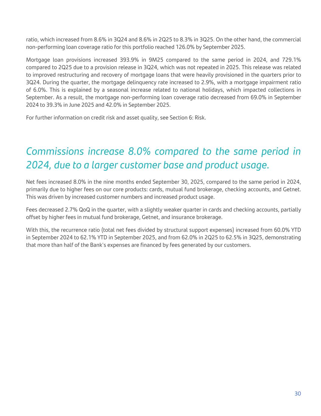 ratio, which increased from 8.6% in 3Q24 and 8.6% in 2Q25 to 8.3% in 3Q25. On the other hand, the commercial non-performing loan coverage ratio for this portfolio reached 126.0% by September 2025. Mortgage loan provisions increased 393.9% in 9M25 compared to the same period in 2024, and 729.1% compared to 2Q25 due to a provision release in 3Q24, which was not repeated in 2025. This release was related to improved restructuring and recovery of mortgage loans that were heavily provisioned in the quarters prior to 3Q24. During the quarter, the mortgage delinquency rate increased to 2.9%, with a mortgage impairment ratio of 6.0%. This is explained by a seasonal increase related to national holidays, which impacted collections in September. As a result, the mortgage non-performing loan coverage ratio decreased from 69.0% in September 2024 to 39.3% in June 2025 and 42.0% in September 2025. For further information on credit risk and asset quality, see Section 6: Risk. Commissions increase 8.0% compared to the same period in 2024, due to a larger customer base and product usage. Net fees increased 8.0% in the nine months ended September 30, 2025, compared to the same period in 2024, primarily due to higher fees on our core products: cards, mutual fund brokerage, checking accounts, and Getnet. This was driven by increased customer numbers and increased product usage. Fees decreased 2.7% QoQ in the quarter, with a slightly weaker quarter in cards and checking accounts, partially offset by higher fees in mutual fund brokerage, Getnet, and insurance brokerage. With this, the recurrence ratio (total net fees divided by structural support expenses) increased from 60.0% YTD in September 2024 to 62.1% YTD in September 2025, and from 62.0% in 2Q25 to 62.5% in 3Q25, demonstrating that more than half of the Bank's expenses are financed by fees generated by our customers. 30