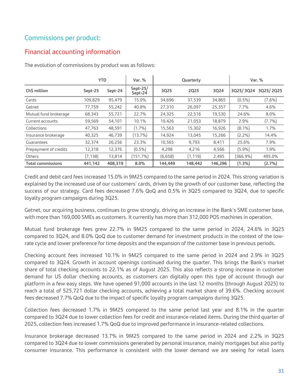 Commissions per product: Financial accounting information The evolution of commissions by product was as follows: YTD Var. % Quarterly Var. % Ch$ million Sept-25 Sept-24 Sept-25/ Sept-24 3Q25 2Q25 3Q24 3Q25/ 3Q24 3Q25/ 2Q25 Cards 109,829 95,479 15.0% 34,696 37,539 34,865 (0.5%) (7.6%) Getnet 77,759 55,242 40.8% 27,310 26,097 25,357 7.7% 4.6% Mutual fund brokerage 68,343 55,721 22.7% 24,325 22,516 19,530 24.6% 8.0% Current accounts 59,569 54,101 10.1% 19,426 21,053 18,879 2.9% (7.7%) Collections 47,763 48,591 (1.7%) 15,563 15,302 16,926 (8.1%) 1.7% Insurance brokerage 40,325 46,739 (13.7%) 14,924 13,045 15,266 (2.2%) 14.4% Guarantees 32,374 26,256 23.3% 10,565 9,793 8,411 25.6% 7.9% Prepayment of credits 12,318 12,376 (0.5%) 4,298 4,216 4,566 (5.9%) 1.9% Others (7,138) 13,814 (151.7%) (6,658) (1,119) 2,495 (366.9%) 495.0% Total commissions 441,142 408,319 8.0% 144,449 148,442 146,296 (1.3%) (2.7%) Credit and debit card fees increased 15.0% in 9M25 compared to the same period in 2024. This strong variation is explained by the increased use of our customers' cards, driven by the growth of our customer base, reflecting the success of our strategy. Card fees decreased 7.6% QoQ and 0.5% in 3Q25 compared to 3Q24, due to specific loyalty program campaigns during 3Q25. Getnet, our acquiring business, continues to grow strongly, driving an increase in the Bank's SME customer base, with more than 169,000 SMEs as customers. It currently has more than 312,000 POS machines in operation. Mutual fund brokerage fees grew 22.7% in 9M25 compared to the same period in 2024, 24.6% in 3Q25 compared to 3Q24, and 8.0% QoQ due to customer demand for investment products in the context of the low- rate cycle and lower preference for time deposits and the expansion of the customer base in previous periods. Checking account fees increased 10.1% in 9M25 compared to the same period in 2024 and 2.9% in 3Q25 compared to 3Q24. Growth in account openings continued during the quarter. This brings the Bank's market share of total checking accounts to 22.1% as of August 2025. This also reflects a strong increase in customer demand for US dollar checking accounts, as customers can digitally open this type of account through our platform in a few easy steps. We have opened 91,000 accounts in the last 12 months (through August 2025) to reach a total of 525,721 dollar checking accounts, achieving a total market share of 39.6%. Checking account fees decreased 7.7% QoQ due to the impact of specific loyalty program campaigns during 3Q25. Collection fees decreased 1.7% in 9M25 compared to the same period last year and 8.1% in the quarter compared to 3Q24 due to lower collection fees for credit and insurance-related items. During the third quarter of 2025, collection fees increased 1.7% QoQ due to improved performance in insurance-related collections. Insurance brokerage decreased 13.7% in 9M25 compared to the same period in 2024 and 2.2% in 3Q25 compared to 3Q24 due to lower commissions generated by personal insurance, mainly mortgages but also partly consumer insurance. This performance is consistent with the lower demand we are seeing for retail loans 31