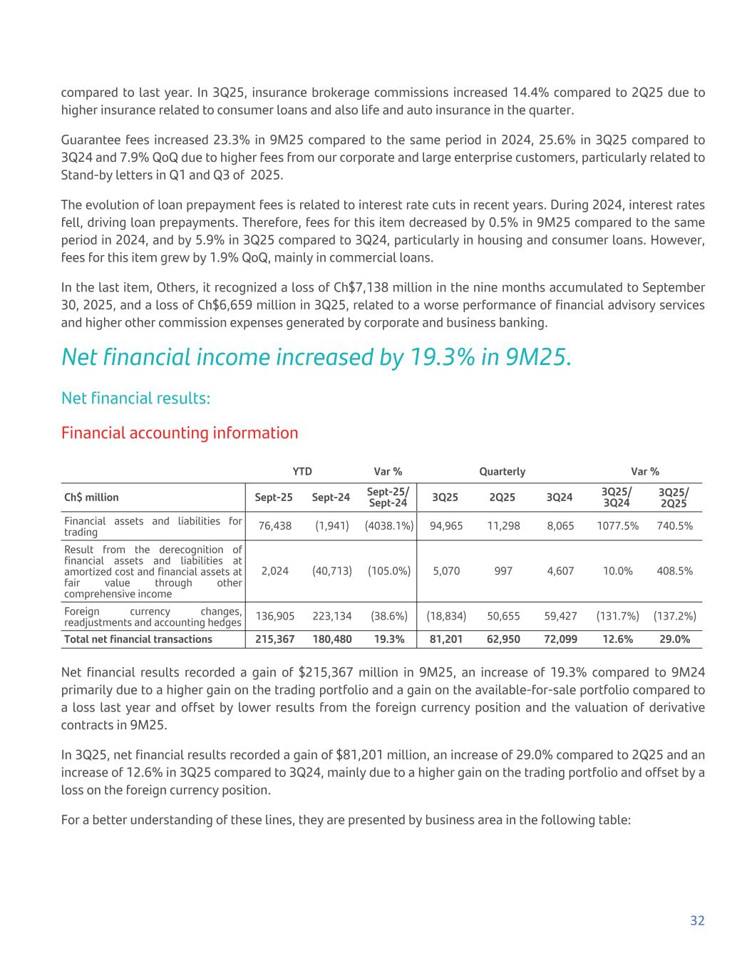 compared to last year. In 3Q25, insurance brokerage commissions increased 14.4% compared to 2Q25 due to higher insurance related to consumer loans and also life and auto insurance in the quarter. Guarantee fees increased 23.3% in 9M25 compared to the same period in 2024, 25.6% in 3Q25 compared to 3Q24 and 7.9% QoQ due to higher fees from our corporate and large enterprise customers, particularly related to Stand-by letters in Q1 and Q3 of 2025. The evolution of loan prepayment fees is related to interest rate cuts in recent years. During 2024, interest rates fell, driving loan prepayments. Therefore, fees for this item decreased by 0.5% in 9M25 compared to the same period in 2024, and by 5.9% in 3Q25 compared to 3Q24, particularly in housing and consumer loans. However, fees for this item grew by 1.9% QoQ, mainly in commercial loans. In the last item, Others, it recognized a loss of Ch$7,138 million in the nine months accumulated to September 30, 2025, and a loss of Ch$6,659 million in 3Q25, related to a worse performance of financial advisory services and higher other commission expenses generated by corporate and business banking. Net financial income increased by 19.3% in 9M25. Net financial results: Financial accounting information YTD Var % Quarterly Var % Ch$ million Sept-25 Sept-24 Sept-25/ Sept-24 3Q25 2Q25 3Q24 3Q25/ 3Q24 3Q25/ 2Q25 Financial assets and liabilities for trading 76,438 (1,941) (4038.1%) 94,965 11,298 8,065 1077.5% 740.5% Result from the derecognition of financial assets and liabilities at amortized cost and financial assets at fair value through other comprehensive income 2,024 (40,713) (105.0%) 5,070 997 4,607 10.0% 408.5% Foreign currency changes, readjustments and accounting hedges 136,905 223,134 (38.6%) (18,834) 50,655 59,427 (131.7%) (137.2%) Total net financial transactions 215,367 180,480 19.3% 81,201 62,950 72,099 12.6% 29.0% Net financial results recorded a gain of $215,367 million in 9M25, an increase of 19.3% compared to 9M24 primarily due to a higher gain on the trading portfolio and a gain on the available-for-sale portfolio compared to a loss last year and offset by lower results from the foreign currency position and the valuation of derivative contracts in 9M25. In 3Q25, net financial results recorded a gain of $81,201 million, an increase of 29.0% compared to 2Q25 and an increase of 12.6% in 3Q25 compared to 3Q24, mainly due to a higher gain on the trading portfolio and offset by a loss on the foreign currency position. For a better understanding of these lines, they are presented by business area in the following table: 32