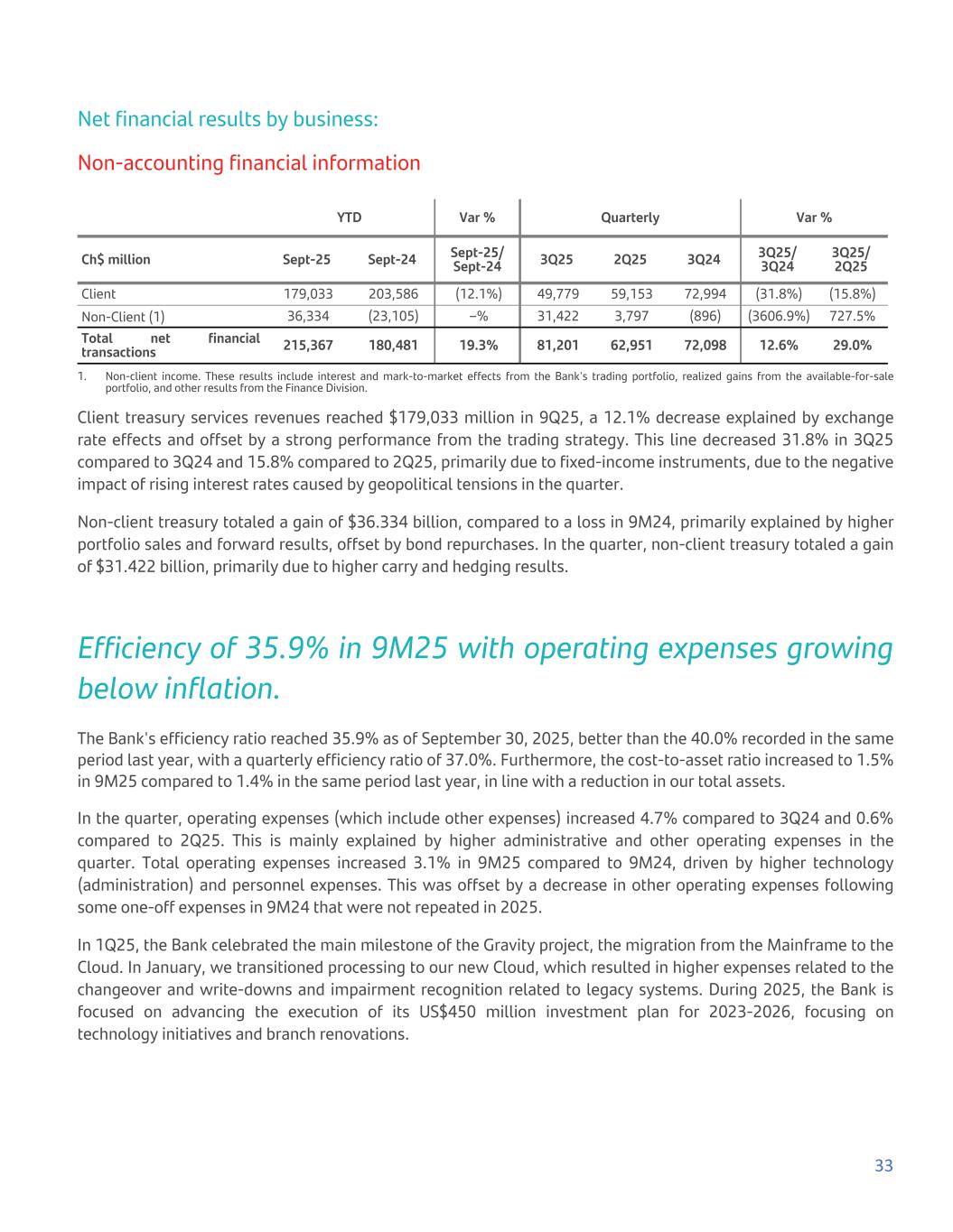 Net financial results by business: Non-accounting financial information YTD Var % Quarterly Var % Ch$ million Sept-25 Sept-24 Sept-25/ Sept-24 3Q25 2Q25 3Q24 3Q25/ 3Q24 3Q25/ 2Q25 Client 179,033 203,586 (12.1%) 49,779 59,153 72,994 (31.8%) (15.8%) Non-Client (1) 36,334 (23,105) –% 31,422 3,797 (896) (3606.9%) 727.5% Total net financial transactions 215,367 180,481 19.3% 81,201 62,951 72,098 12.6% 29.0% 1. Non-client income. These results include interest and mark-to-market effects from the Bank's trading portfolio, realized gains from the available-for-sale portfolio, and other results from the Finance Division. Client treasury services revenues reached $179,033 million in 9Q25, a 12.1% decrease explained by exchange rate effects and offset by a strong performance from the trading strategy. This line decreased 31.8% in 3Q25 compared to 3Q24 and 15.8% compared to 2Q25, primarily due to fixed-income instruments, due to the negative impact of rising interest rates caused by geopolitical tensions in the quarter. Non-client treasury totaled a gain of $36.334 billion, compared to a loss in 9M24, primarily explained by higher portfolio sales and forward results, offset by bond repurchases. In the quarter, non-client treasury totaled a gain of $31.422 billion, primarily due to higher carry and hedging results. Efficiency of 35.9% in 9M25 with operating expenses growing below inflation. The Bank's efficiency ratio reached 35.9% as of September 30, 2025, better than the 40.0% recorded in the same period last year, with a quarterly efficiency ratio of 37.0%. Furthermore, the cost-to-asset ratio increased to 1.5% in 9M25 compared to 1.4% in the same period last year, in line with a reduction in our total assets. In the quarter, operating expenses (which include other expenses) increased 4.7% compared to 3Q24 and 0.6% compared to 2Q25. This is mainly explained by higher administrative and other operating expenses in the quarter. Total operating expenses increased 3.1% in 9M25 compared to 9M24, driven by higher technology (administration) and personnel expenses. This was offset by a decrease in other operating expenses following some one-off expenses in 9M24 that were not repeated in 2025. In 1Q25, the Bank celebrated the main milestone of the Gravity project, the migration from the Mainframe to the Cloud. In January, we transitioned processing to our new Cloud, which resulted in higher expenses related to the changeover and write-downs and impairment recognition related to legacy systems. During 2025, the Bank is focused on advancing the execution of its US$450 million investment plan for 2023-2026, focusing on technology initiatives and branch renovations. 33