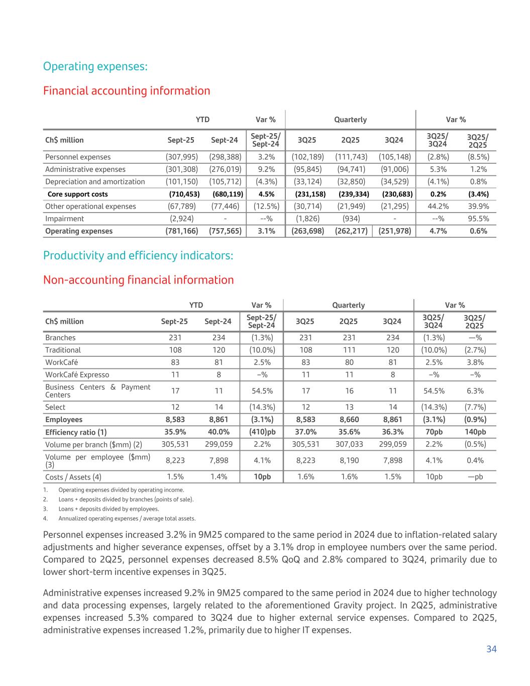 Operating expenses: Financial accounting information YTD Var % Quarterly Var % Ch$ million Sept-25 Sept-24 Sept-25/ Sept-24 3Q25 2Q25 3Q24 3Q25/ 3Q24 3Q25/ 2Q25 Personnel expenses (307,995) (298,388) 3.2% (102,189) (111,743) (105,148) (2.8%) (8.5%) Administrative expenses (301,308) (276,019) 9.2% (95,845) (94,741) (91,006) 5.3% 1.2% Depreciation and amortization (101,150) (105,712) (4.3%) (33,124) (32,850) (34,529) (4.1%) 0.8% Core support costs (710,453) (680,119) 4.5% (231,158) (239,334) (230,683) 0.2% (3.4%) Other operational expenses (67,789) (77,446) (12.5%) (30,714) (21,949) (21,295) 44.2% 39.9% Impairment (2,924) - --% (1,826) (934) - --% 95.5% Operating expenses (781,166) (757,565) 3.1% (263,698) (262,217) (251,978) 4.7% 0.6% Productivity and efficiency indicators: Non-accounting financial information YTD Var % Quarterly Var % Ch$ million Sept-25 Sept-24 Sept-25/ Sept-24 3Q25 2Q25 3Q24 3Q25/ 3Q24 3Q25/ 2Q25 Branches 231 234 (1.3%) 231 231 234 (1.3%) —% Traditional 108 120 (10.0%) 108 111 120 (10.0%) (2.7%) WorkCafé 83 81 2.5% 83 80 81 2.5% 3.8% WorkCafé Expresso 11 8 –% 11 11 8 –% –% Business Centers & Payment Centers 17 11 54.5% 17 16 11 54.5% 6.3% Select 12 14 (14.3%) 12 13 14 (14.3%) (7.7%) Employees 8,583 8,861 (3.1%) 8,583 8,660 8,861 (3.1%) (0.9%) Efficiency ratio (1) 35.9% 40.0% (410)pb 37.0% 35.6% 36.3% 70pb 140pb Volume per branch ($mm) (2) 305,531 299,059 2.2% 305,531 307,033 299,059 2.2% (0.5%) Volume per employee ($mm) (3) 8,223 7,898 4.1% 8,223 8,190 7,898 4.1% 0.4% Costs / Assets (4) 1.5% 1.4% 10pb 1.6% 1.6% 1.5% 10pb —pb 1. Operating expenses divided by operating income. 2. Loans + deposits divided by branches (points of sale). 3. Loans + deposits divided by employees. 4. Annualized operating expenses / average total assets. Personnel expenses increased 3.2% in 9M25 compared to the same period in 2024 due to inflation-related salary adjustments and higher severance expenses, offset by a 3.1% drop in employee numbers over the same period. Compared to 2Q25, personnel expenses decreased 8.5% QoQ and 2.8% compared to 3Q24, primarily due to lower short-term incentive expenses in 3Q25. Administrative expenses increased 9.2% in 9M25 compared to the same period in 2024 due to higher technology and data processing expenses, largely related to the aforementioned Gravity project. In 2Q25, administrative expenses increased 5.3% compared to 3Q24 due to higher external service expenses. Compared to 2Q25, administrative expenses increased 1.2%, primarily due to higher IT expenses. 34