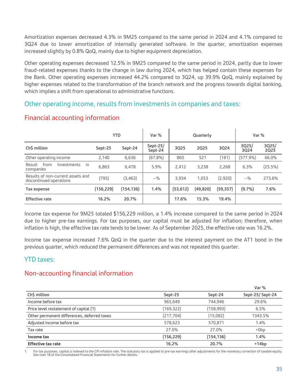 Amortization expenses decreased 4.3% in 9M25 compared to the same period in 2024 and 4.1% compared to 3Q24 due to lower amortization of internally generated software. In the quarter, amortization expenses increased slightly by 0.8% QoQ, mainly due to higher equipment depreciation. Other operating expenses decreased 12.5% in 9M25 compared to the same period in 2024, partly due to lower fraud-related expenses thanks to the change in law during 2024, which has helped contain these expenses for the Bank. Other operating expenses increased 44.2% compared to 3Q24, up 39.9% QoQ, mainly explained by higher expenses related to the transformation of the branch network and the progress towards digital banking, which implies a shift from operational to administrative functions. Other operating income, results from investments in companies and taxes: Financial accounting information YTD Var % Quarterly Var % Ch$ million Sept-25 Sept-24 Sept-25/ Sept-24 3Q25 2Q25 3Q24 3Q25/ 3Q24 3Q25/ 2Q25 Other operating income 2,140 6,636 (67.8%) 865 521 (181) (577.9%) 66.0% Result from investments in companies 6,863 6,478 5.9% 2,412 3,238 2,268 6.3% (25.5%) Results of non-current assets and discontinued operations (795) (3,463) --% 3,934 1,053 (2,920) --% 273.6% Tax expense (156,229) (154,136) 1.4% (53,612) (49,820) (59,357) (9.7%) 7.6% Effective rate 16.2% 20.7%   17.6% 15.3% 19.4% Income tax expense for 9M25 totaled $156,229 million, a 1.4% increase compared to the same period in 2024 due to higher pre-tax earnings. For tax purposes, our capital must be adjusted for inflation; therefore, when inflation is high, the effective tax rate tends to be lower. As of September 2025, the effective rate was 16.2%. Income tax expense increased 7.6% QoQ in the quarter due to the interest payment on the AT1 bond in the previous quarter, which reduced the permanent differences and was not repeated this quarter. YTD taxes: Non-accounting financial information Var % Ch$ million Sept-25 Sept-24 Sept-25/ Sept-24 Income before tax 965,649 744,946 29.6% Price level restatement of capital (1) (169,322) (158,993) 6.5% Other permanent differences, deferred taxes (217,704) (15,082) 1343.5% Adjusted income before tax 578,623 570,871 1.4% Tax rate 27.0% 27.0% +0bp Income tax (156,229) (154,136) 1.4% Effective tax rate 16.2% 20.7% +14bp 1. For tax purposes, capital is indexed to the CPI inflation rate. The statutory tax is applied to pre-tax earnings after adjustments for the monetary correction of taxable equity. See note 18 of the Consolidated Financial Statements for further details. 35