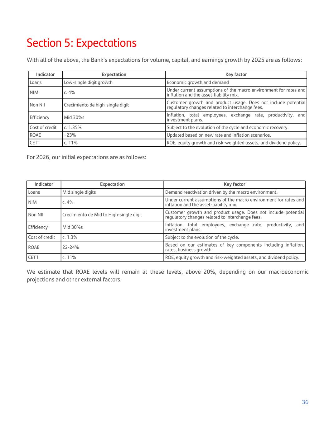Section 5: Expectations With all of the above, the Bank's expectations for volume, capital, and earnings growth by 2025 are as follows: Indicator Expectation Key factor Loans Low-single digit growth Economic growth and demand NIM c. 4% Under current assumptions of the macro environment for rates and inflation and the asset-liability mix. Non NII Crecimiento de high-single digit Customer growth and product usage. Does not include potential regulatory changes related to interchange fees. Efficiency Mid 30%s Inflation, total employees, exchange rate, productivity, and investment plans. Cost of credit c. 1.35% Subject to the evolution of the cycle and economic recovery. ROAE ~23% Updated based on new rate and inflation scenarios. CET1 c. 11% ROE, equity growth and risk-weighted assets, and dividend policy. For 2026, our initial expectations are as follows: Indicator Expectation Key factor Loans Mid single digits Demand reactivation driven by the macro environment. NIM c. 4% Under current assumptions of the macro environment for rates and inflation and the asset-liability mix. Non NII Crecimiento de Mid to High-single digit Customer growth and product usage. Does not include potential regulatory changes related to interchange fees. Efficiency Mid 30%s Inflation, total employees, exchange rate, productivity, and investment plans. Cost of credit c. 1.3% Subject to the evolution of the cycle. ROAE 22-24% Based on our estimates of key components including inflation, rates, business growth. CET1 c. 11% ROE, equity growth and risk-weighted assets, and dividend policy. We estimate that ROAE levels will remain at these levels, above 20%, depending on our macroeconomic projections and other external factors. 36