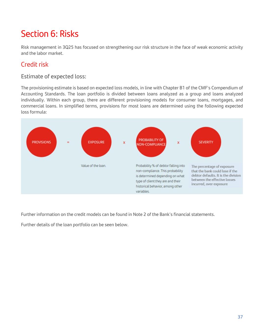 Section 6: Risks Risk management in 3Q25 has focused on strengthening our risk structure in the face of weak economic activity and the labor market. Credit risk Estimate of expected loss: The provisioning estimate is based on expected loss models, in line with Chapter B1 of the CMF's Compendium of Accounting Standards. The loan portfolio is divided between loans analyzed as a group and loans analyzed individually. Within each group, there are different provisioning models for consumer loans, mortgages, and commercial loans. In simplified terms, provisions for most loans are determined using the following expected loss formula: Further information on the credit models can be found in Note 2 of the Bank's financial statements. Further details of the loan portfolio can be seen below. 37