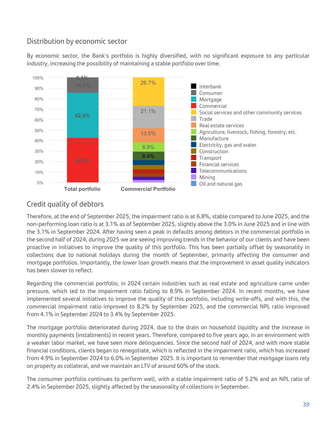 Distribution by economic sector By economic sector, the Bank's portfolio is highly diversified, with no significant exposure to any particular industry, increasing the possibility of maintaining a stable portfolio over time. 8.4% 8.9% 13.5% 21.1% 26.7% 42.9% 42.6% 14.4% 0.1% Interbank Consumer Mortgage Commercial Social services and other community services Trade Real estate services Agriculture, livestock, fishing, forestry, etc. Manufacture Electricity, gas and water Construction Transport Financial services Telecommunications Mining Oil and natural gas Total portfolio Commercial Portfolio 0% 10% 20% 30% 40% 50% 60% 70% 80% 90% 100% Credit quality of debtors Therefore, at the end of September 2025, the impairment ratio is at 6.8%, stable compared to June 2025, and the non-performing loan ratio is at 3.1% as of September 2025, slightly above the 3.0% in June 2025 and in line with the 3.1% in September 2024. After having seen a peak in defaults among debtors in the commercial portfolio in the second half of 2024, during 2025 we are seeing improving trends in the behavior of our clients and have been proactive in initiatives to improve the quality of this portfolio. This has been partially offset by seasonality in collections due to national holidays during the month of September, primarily affecting the consumer and mortgage portfolios. Importantly, the lower loan growth means that the improvement in asset quality indicators has been slower to reflect. Regarding the commercial portfolio, in 2024 certain industries such as real estate and agriculture came under pressure, which led to the impairment ratio falling to 8.9% in September 2024. In recent months, we have implemented several initiatives to improve the quality of this portfolio, including write-offs, and with this, the commercial impairment ratio improved to 8.2% by September 2025, and the commercial NPL ratio improved from 4.1% in September 2024 to 3.4% by September 2025. The mortgage portfolio deteriorated during 2024, due to the drain on household liquidity and the increase in monthly payments (installments) in recent years. Therefore, compared to five years ago, in an environment with a weaker labor market, we have seen more delinquencies. Since the second half of 2024, and with more stable financial conditions, clients began to renegotiate, which is reflected in the impairment ratio, which has increased from 4.9% in September 2024 to 6.0% in September 2025. It is important to remember that mortgage loans rely on property as collateral, and we maintain an LTV of around 60% of the stock. The consumer portfolio continues to perform well, with a stable impairment ratio of 5.2% and an NPL ratio of 2.4% in September 2025, slightly affected by the seasonality of collections in September. 39