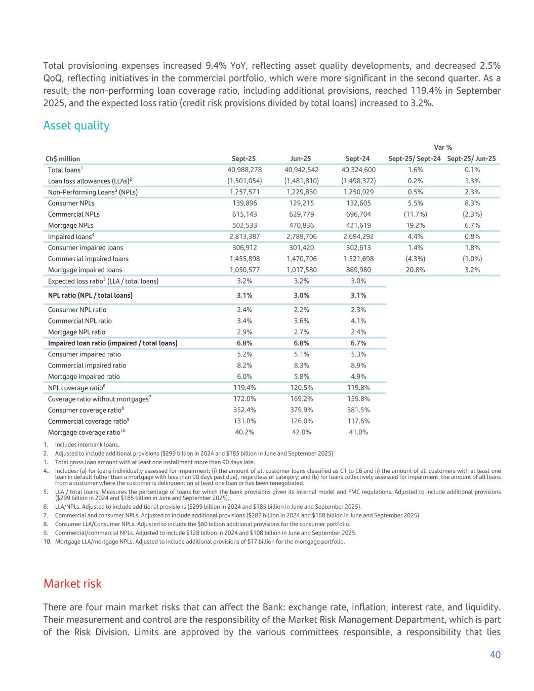Total provisioning expenses increased 9.4% YoY, reflecting asset quality developments, and decreased 2.5% QoQ, reflecting initiatives in the commercial portfolio, which were more significant in the second quarter. As a result, the non-performing loan coverage ratio, including additional provisions, reached 119.4% in September 2025, and the expected loss ratio (credit risk provisions divided by total loans) increased to 3.2%. Asset quality Var % Ch$ million Sept-25 Jun-25 Sept-24 Sept-25/ Sept-24 Sept-25/ Jun-25 Total loans1 40,988,278 40,942,542 40,324,600 1.6% 0.1% Loan loss allowances (LLAs)2 (1,501,054) (1,481,810) (1,498,372) 0.2% 1.3% Non-Performing Loans3 (NPLs) 1,257,571 1,229,830 1,250,929 0.5% 2.3% Consumer NPLs 139,896 129,215 132,605 5.5% 8.3% Commercial NPLs 615,143 629,779 696,704 (11.7%) (2.3%) Mortgage NPLs 502,533 470,836 421,619 19.2% 6.7% Impaired loans4 2,813,387 2,789,706 2,694,292 4.4% 0.8% Consumer impaired loans 306,912 301,420 302,613 1.4% 1.8% Commercial impaired loans 1,455,898 1,470,706 1,521,698 (4.3%) (1.0%) Mortgage impaired loans 1,050,577 1,017,580 869,980 20.8% 3.2% Expected loss ratio5 (LLA / total loans) 3.2% 3.2% 3.0% NPL ratio (NPL / total loans) 3.1% 3.0% 3.1% Consumer NPL ratio 2.4% 2.2% 2.3% Commercial NPL ratio 3.4% 3.6% 4.1% Mortgage NPL ratio 2.9% 2.7% 2.4% Impaired loan ratio (impaired / total loans) 6.8% 6.8% 6.7% Consumer impaired ratio 5.2% 5.1% 5.3% Commercial impaired ratio 8.2% 8.3% 8.9% Mortgage impaired ratio 6.0% 5.8% 4.9% NPL coverage ratio6 119.4% 120.5% 119.8% Coverage ratio without mortgages7 172.0% 169.2% 159.8% Consumer coverage ratio8 352.4% 379.9% 381.5% Commercial coverage ratio9 131.0% 126.0% 117.6% Mortgage coverage ratio10 40.2% 42.0% 41.0% 1. Includes interbank loans. 2. Adjusted to include additional provisions ($299 billion in 2024 and $185 billion in June and September 2025) 3. Total gross loan amount with at least one installment more than 90 days late. 4.. Includes: (a) for loans individually assessed for impairment: (i) the amount of all customer loans classified as C1 to C6 and ii) the amount of all customers with at least one loan in default (other than a mortgage with less than 90 days past due), regardless of category; and (b) for loans collectively assessed for impairment, the amount of all loans from a customer where the customer is delinquent on at least one loan or has been renegotiated. 5. LLA / total loans. Measures the percentage of loans for which the bank provisions given its internal model and FMC regulations. Adjusted to include additional provisions ($299 billion in 2024 and $185 billion in June and September 2025). 6. LLA/NPLs. Adjusted to include additional provisions ($299 billion in 2024 and $185 billion in June and September 2025). 7. Commercial and consumer NPLs. Adjusted to include additional provisions ($282 billion in 2024 and $168 billion in June and September 2025) 8. Consumer LLA/Consumer NPLs. Adjusted to include the $60 billion additional provisions for the consumer portfolio. 9. Commercial/commercial NPLs. Adjusted to include $128 billion in 2024 and $108 billion in June and September 2025. 10. Mortgage LLA/mortgage NPLs. Adjusted to include additional provisions of $17 billion for the mortgage portfolio. Market risk There are four main market risks that can affect the Bank: exchange rate, inflation, interest rate, and liquidity. Their measurement and control are the responsibility of the Market Risk Management Department, which is part of the Risk Division. Limits are approved by the various committees responsible, a responsibility that lies 40
