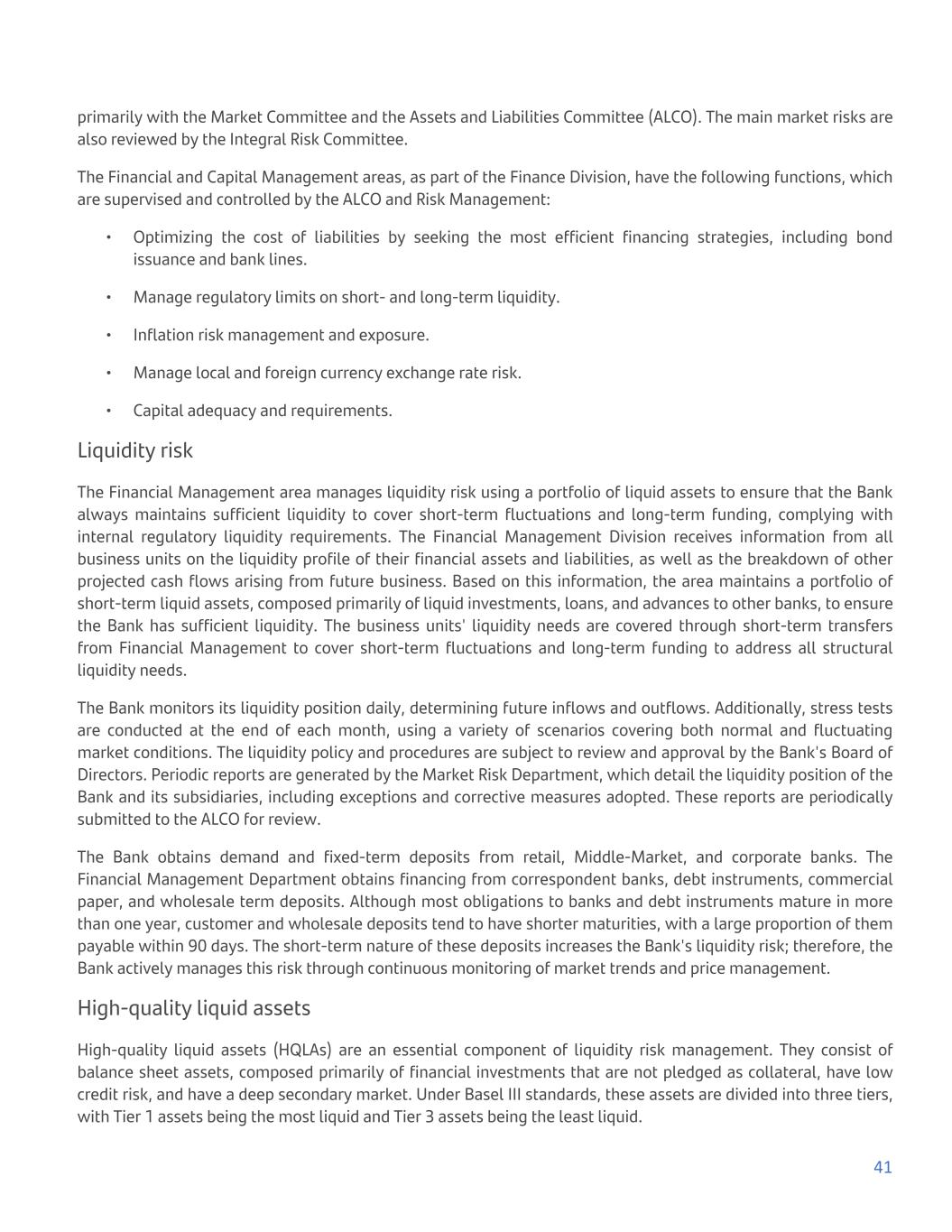 primarily with the Market Committee and the Assets and Liabilities Committee (ALCO). The main market risks are also reviewed by the Integral Risk Committee. The Financial and Capital Management areas, as part of the Finance Division, have the following functions, which are supervised and controlled by the ALCO and Risk Management: • Optimizing the cost of liabilities by seeking the most efficient financing strategies, including bond issuance and bank lines. • Manage regulatory limits on short- and long-term liquidity. • Inflation risk management and exposure. • Manage local and foreign currency exchange rate risk. • Capital adequacy and requirements. Liquidity risk The Financial Management area manages liquidity risk using a portfolio of liquid assets to ensure that the Bank always maintains sufficient liquidity to cover short-term fluctuations and long-term funding, complying with internal regulatory liquidity requirements. The Financial Management Division receives information from all business units on the liquidity profile of their financial assets and liabilities, as well as the breakdown of other projected cash flows arising from future business. Based on this information, the area maintains a portfolio of short-term liquid assets, composed primarily of liquid investments, loans, and advances to other banks, to ensure the Bank has sufficient liquidity. The business units' liquidity needs are covered through short-term transfers from Financial Management to cover short-term fluctuations and long-term funding to address all structural liquidity needs. The Bank monitors its liquidity position daily, determining future inflows and outflows. Additionally, stress tests are conducted at the end of each month, using a variety of scenarios covering both normal and fluctuating market conditions. The liquidity policy and procedures are subject to review and approval by the Bank's Board of Directors. Periodic reports are generated by the Market Risk Department, which detail the liquidity position of the Bank and its subsidiaries, including exceptions and corrective measures adopted. These reports are periodically submitted to the ALCO for review. The Bank obtains demand and fixed-term deposits from retail, Middle-Market, and corporate banks. The Financial Management Department obtains financing from correspondent banks, debt instruments, commercial paper, and wholesale term deposits. Although most obligations to banks and debt instruments mature in more than one year, customer and wholesale deposits tend to have shorter maturities, with a large proportion of them payable within 90 days. The short-term nature of these deposits increases the Bank's liquidity risk; therefore, the Bank actively manages this risk through continuous monitoring of market trends and price management. High-quality liquid assets High-quality liquid assets (HQLAs) are an essential component of liquidity risk management. They consist of balance sheet assets, composed primarily of financial investments that are not pledged as collateral, have low credit risk, and have a deep secondary market. Under Basel III standards, these assets are divided into three tiers, with Tier 1 assets being the most liquid and Tier 3 assets being the least liquid. 41